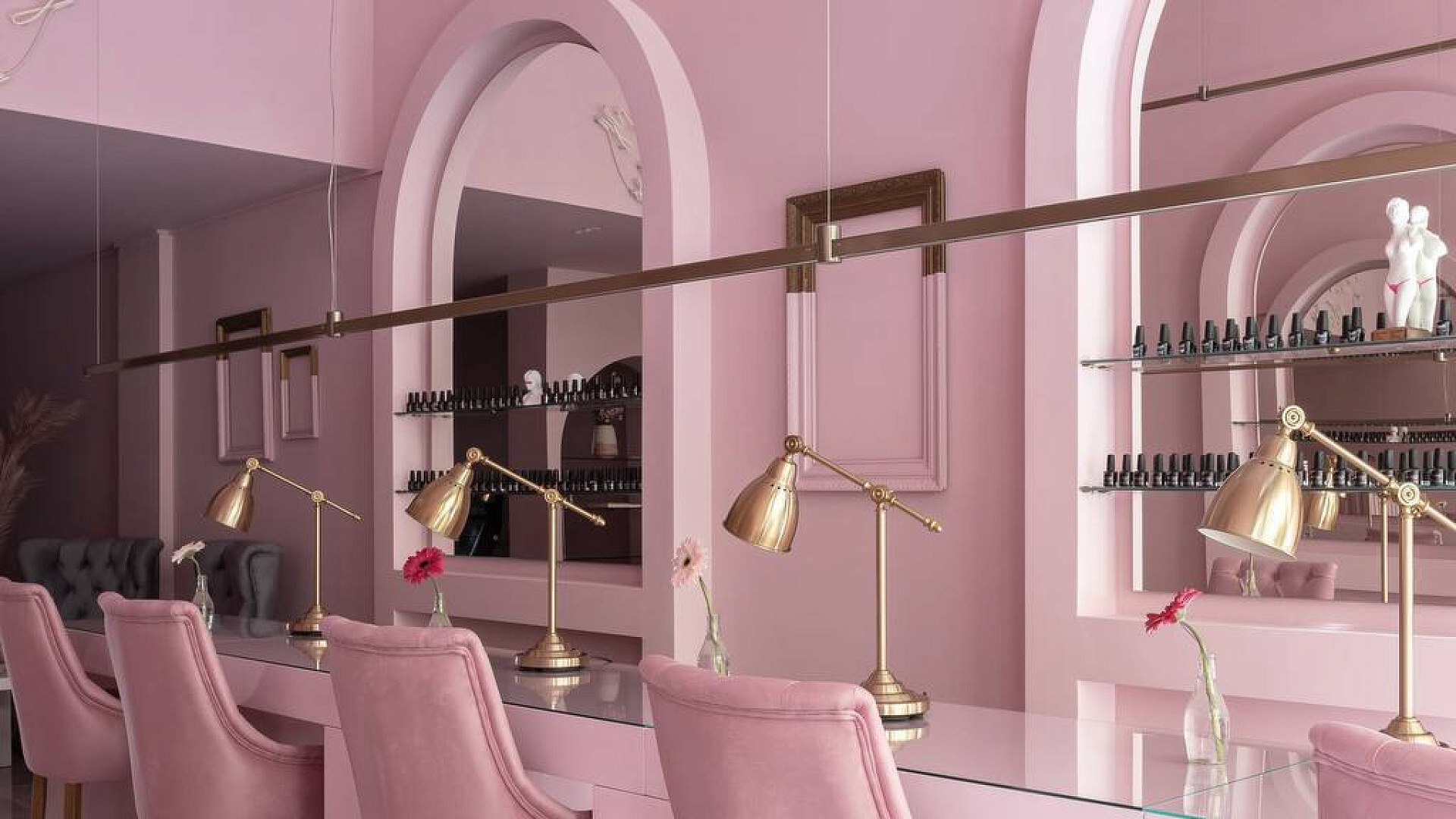 5 рабочих мест для маникюра, 4 кушетки (2 для ресниц, 1 для педикюра, 1 универсальное место для работы в четыре руки / педикюра), Место бровиста / визажиста
