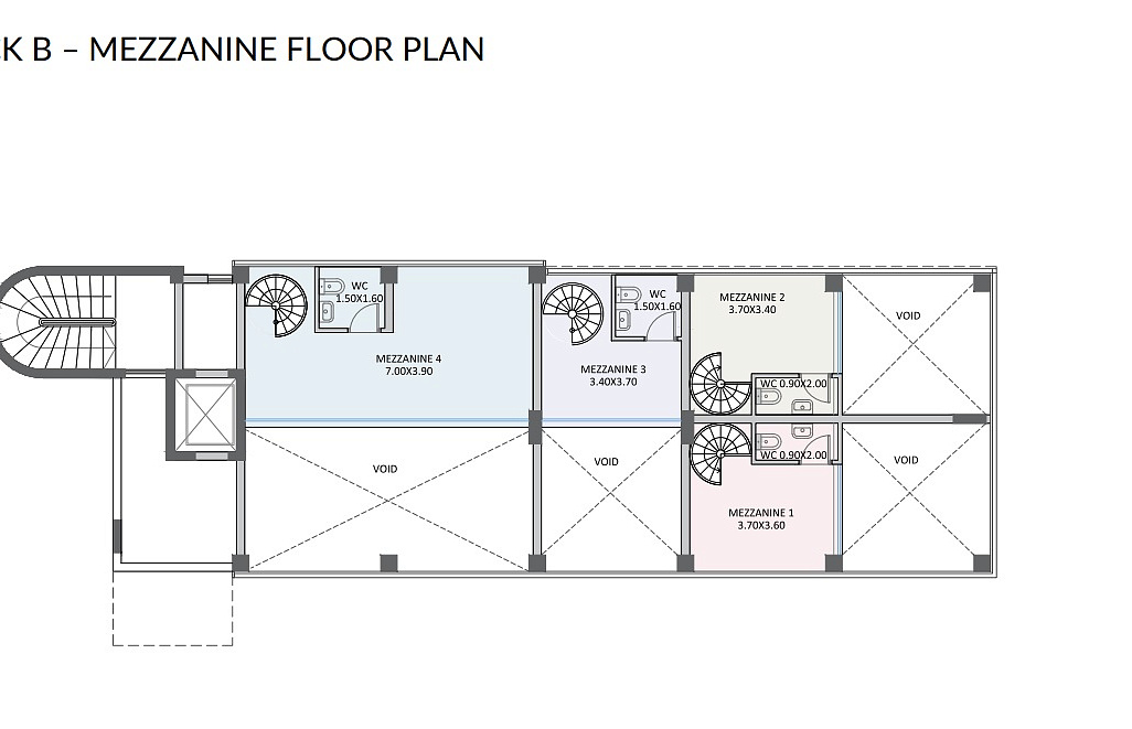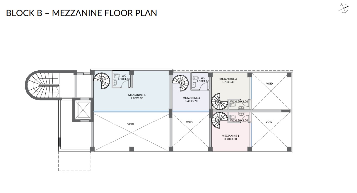 Здание состоит из 4-х магазинов на ground floor + мезонины и 2-х офисов на 1 и 2 этажах:
