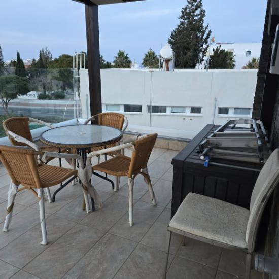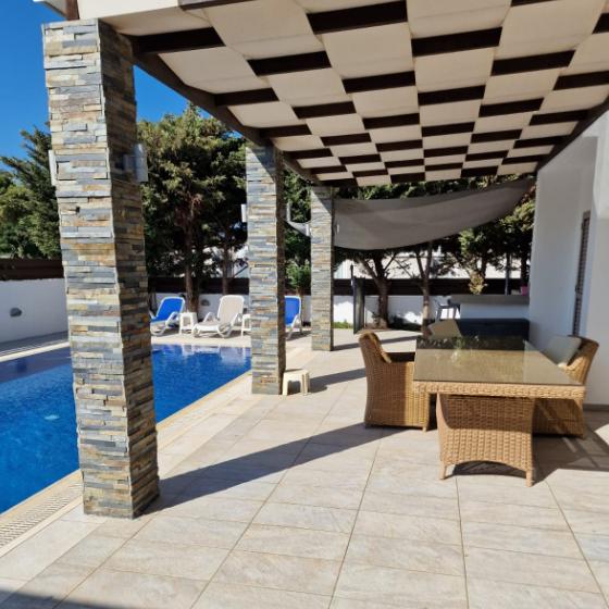 Сдаётся полностью меблированная трёхспальная вилла с бассейном в районе Protaras Famagusta с общей площадью 165 м² и участком 350 м². Вилла включает три просторные спальни и три современные ванные комнаты. Интерьер полностью меблирован, выполнена открытая планировка гостиной и кухни. На территории виллы есть частный бассейн и ухоженная зона отдыха, включая крытую и открытую веранду площадью 50 м². Вилла оснащена кондиционерами, солнечными панелями для воды и фотовольтаикой, встроенными шкафами, кухонной техникой, энергоэффективными окнами и дверями, а также крытой парковкой. Расположена в популярном курортном районе Protaras, рядом с пляжами, ресторанами, магазинами и всей необходимой инфраструктурой.
