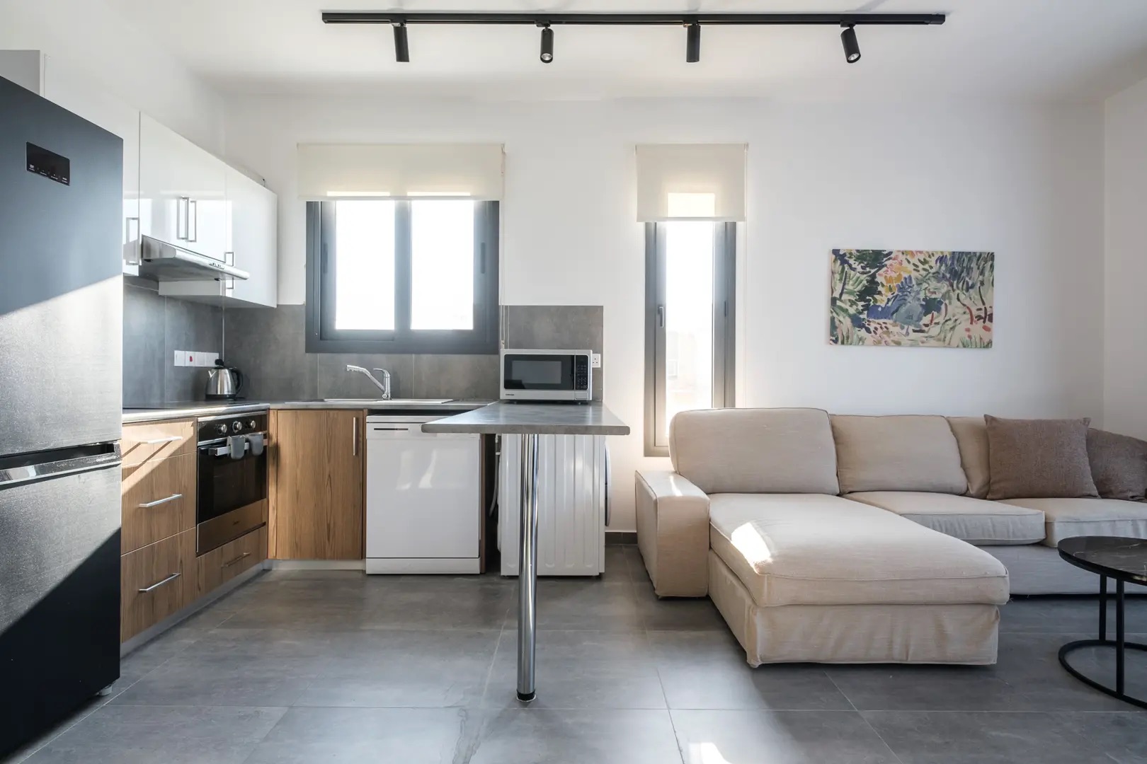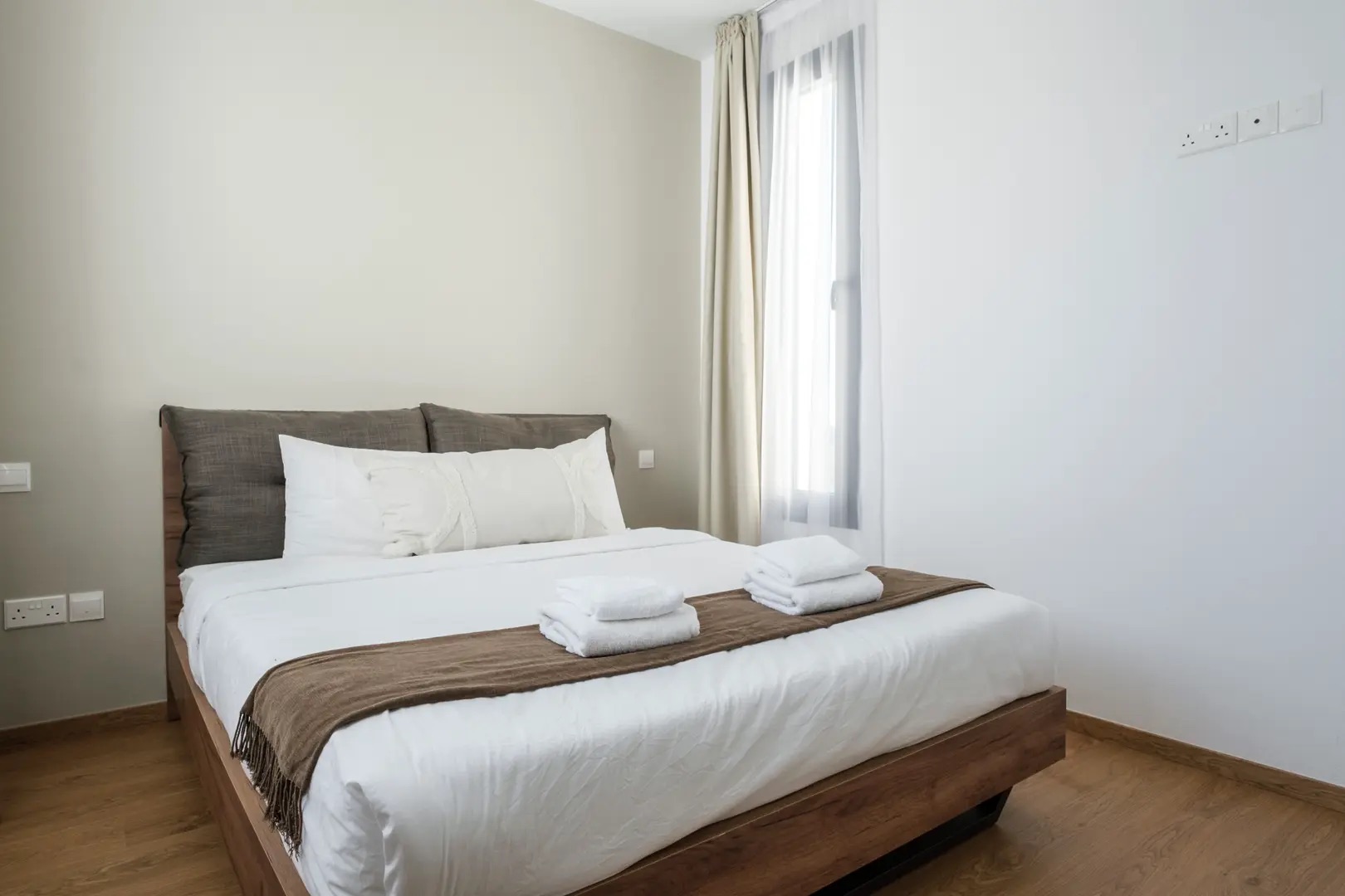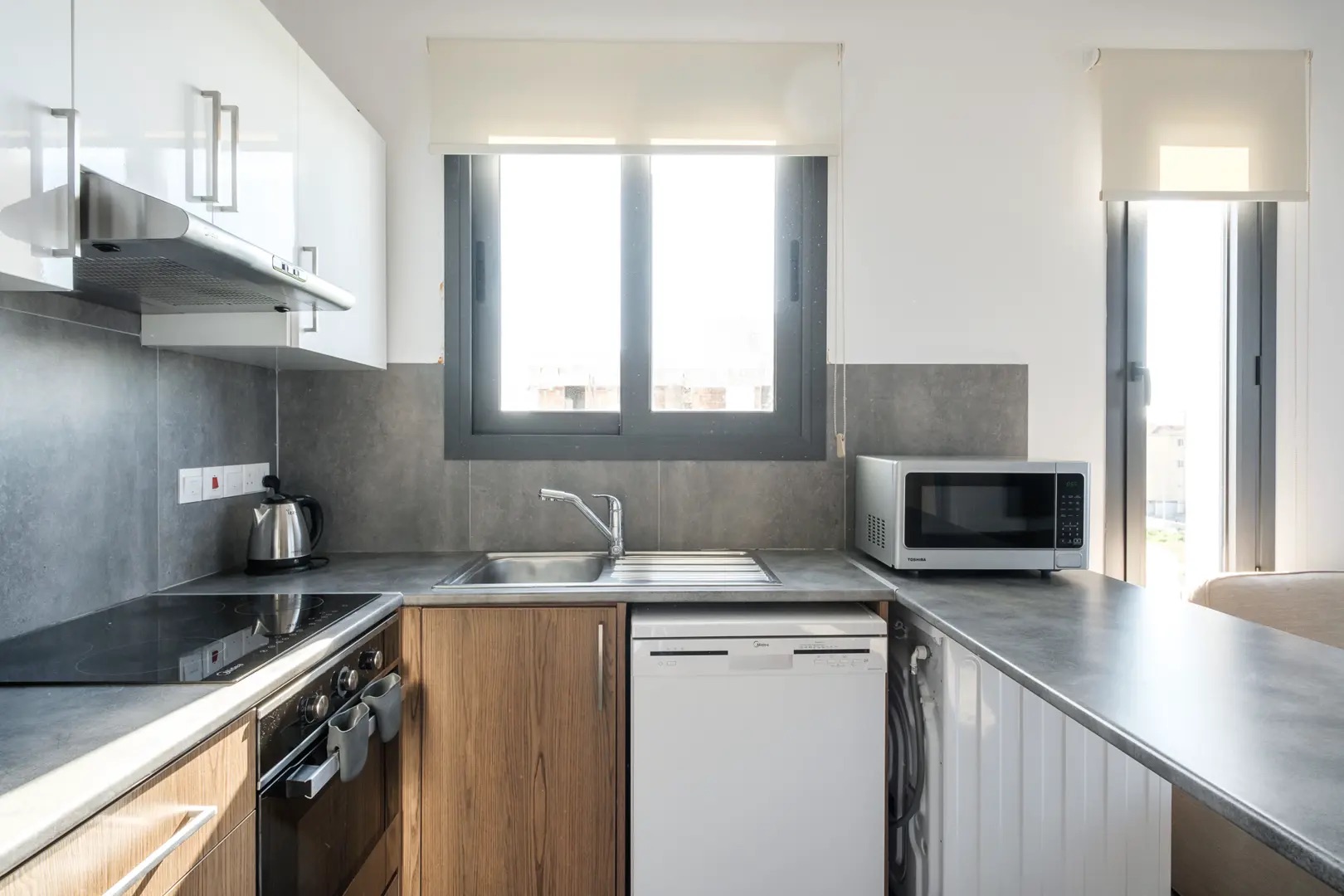 Сдается в аренду двухспальные апартаменты площадью 100 м² в районе Town Center Paphos, город Paphos. Апартаменты включают две спальни, две ванные комнаты, просторную гостиную, полностью оборудованную кухню, частный балкон с видом на город, кладовую и место на частной парковке. Апартаменты полностью меблированы и оснащены всей необходимой бытовой техникой: кондиционеры во всех комнатах, стиральная и сушильная машины, посудомоечная машина, духовка, варочная панель, вытяжка, холодильник, микроволновая печь, кофемашина Nespresso, электрический чайник, утюг, пылесос, телевизор Smart TV, аудиосистема Marshall, фен, отопление, интернет Wi-Fi и система безопасности с бронированной дверью.