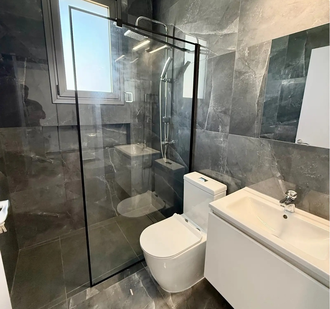 Квартира включает 2 спальни, 1 ванную комнату (душ) и гостевой санузел. Общая площадь — 87 м2 (75 м2 крытая площадь + 12 м2 веранда). Полностью меблирована новой мебелью и оборудована современной техникой: кондиционеры inverter, посудомоечная и стиральная машины, Smart TV 55”, жалюзи, бойлер.