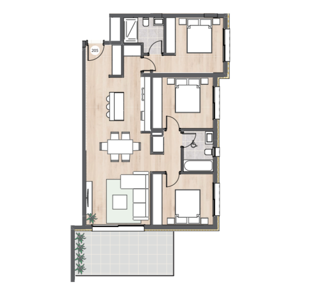 Каждая квартира в комплексе спроектирована с учетом максимального комфорта. В проекте предусмотрена гостиная и кухня открытой планировки, а также крытая веранда. Кроме того, имеется крытая парковка и индивидуальная кладовая.