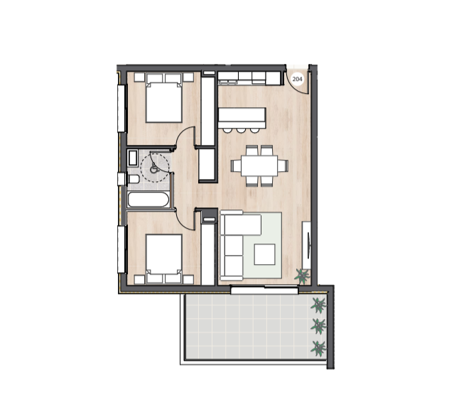 Каждая квартира в комплексе спроектирована с учетом максимального комфорта. В проекте предусмотрена гостиная и кухня открытой планировки, а также крытая веранда. Кроме того, имеется крытая парковка и индивидуальная кладовая.