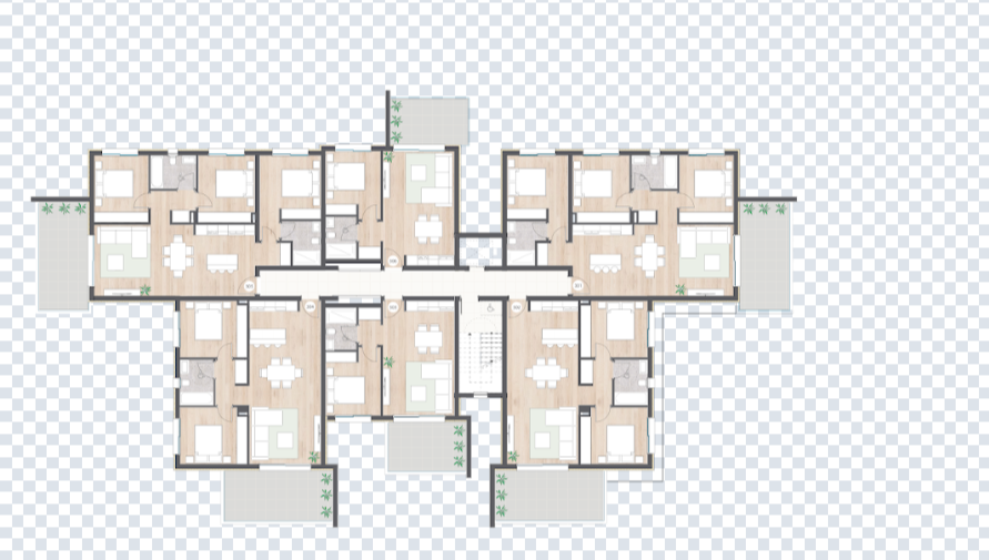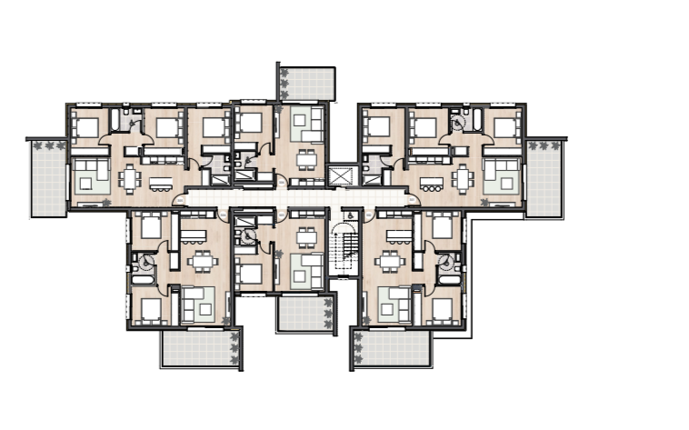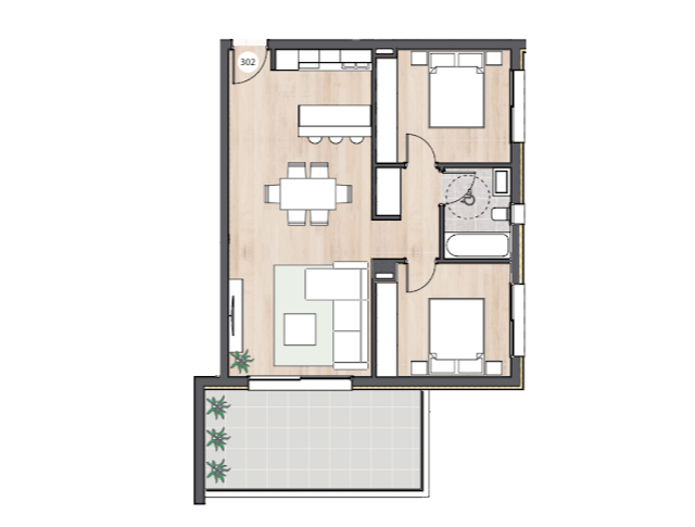 Каждая квартира в комплексе спроектирована с учетом максимального комфорта. В проекте предусмотрена гостиная и кухня открытой планировки, а также крытая веранда. Кроме того, имеется крытая парковка и индивидуальная кладовая.