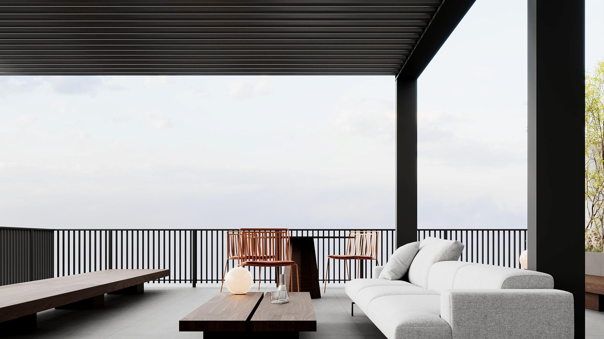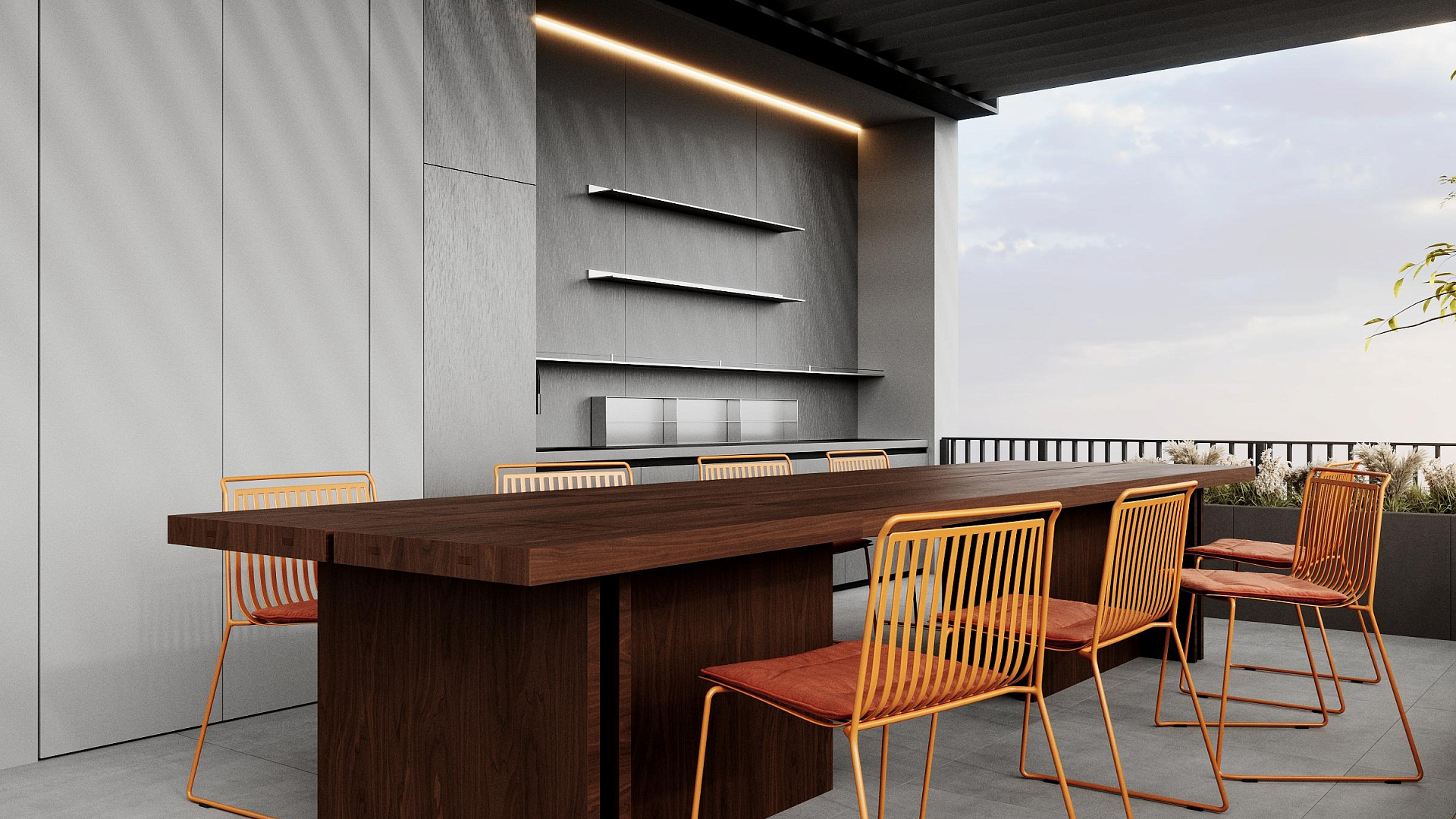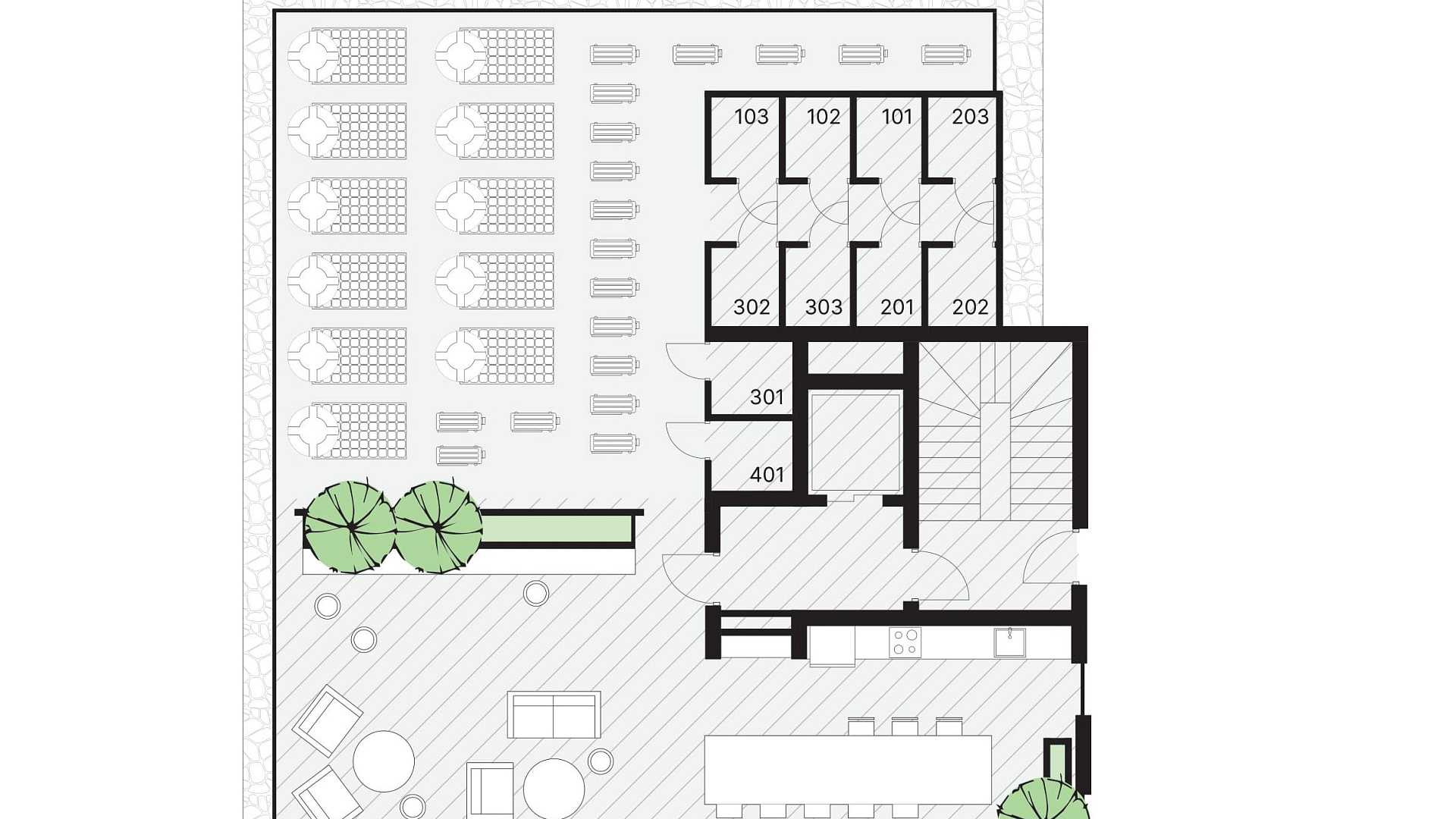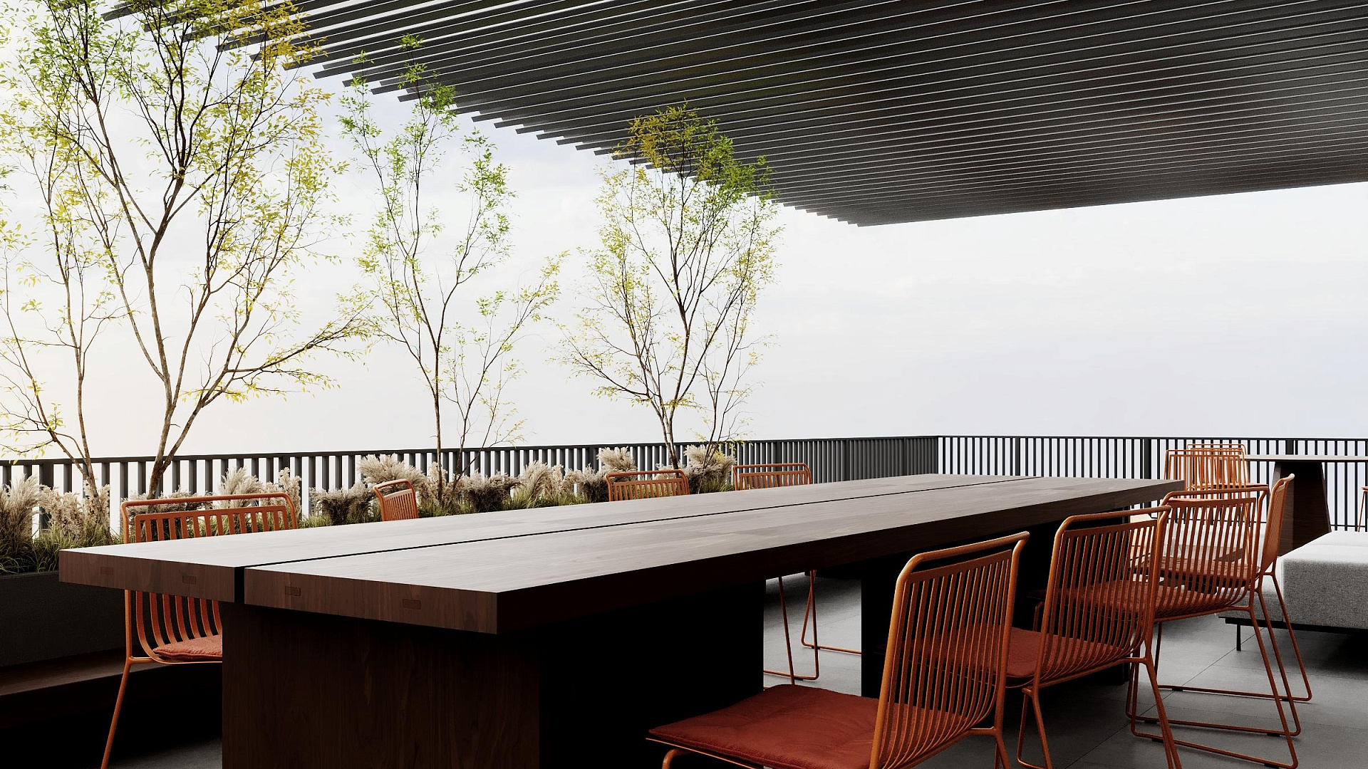 На верхнем этаже предусмотрено полностью крытое общее пространство, разделенное на две зоны: одна из них представляет собой тренажерный зал, а другая — социальную зону с зонами для приготовления пищи и отдыха.