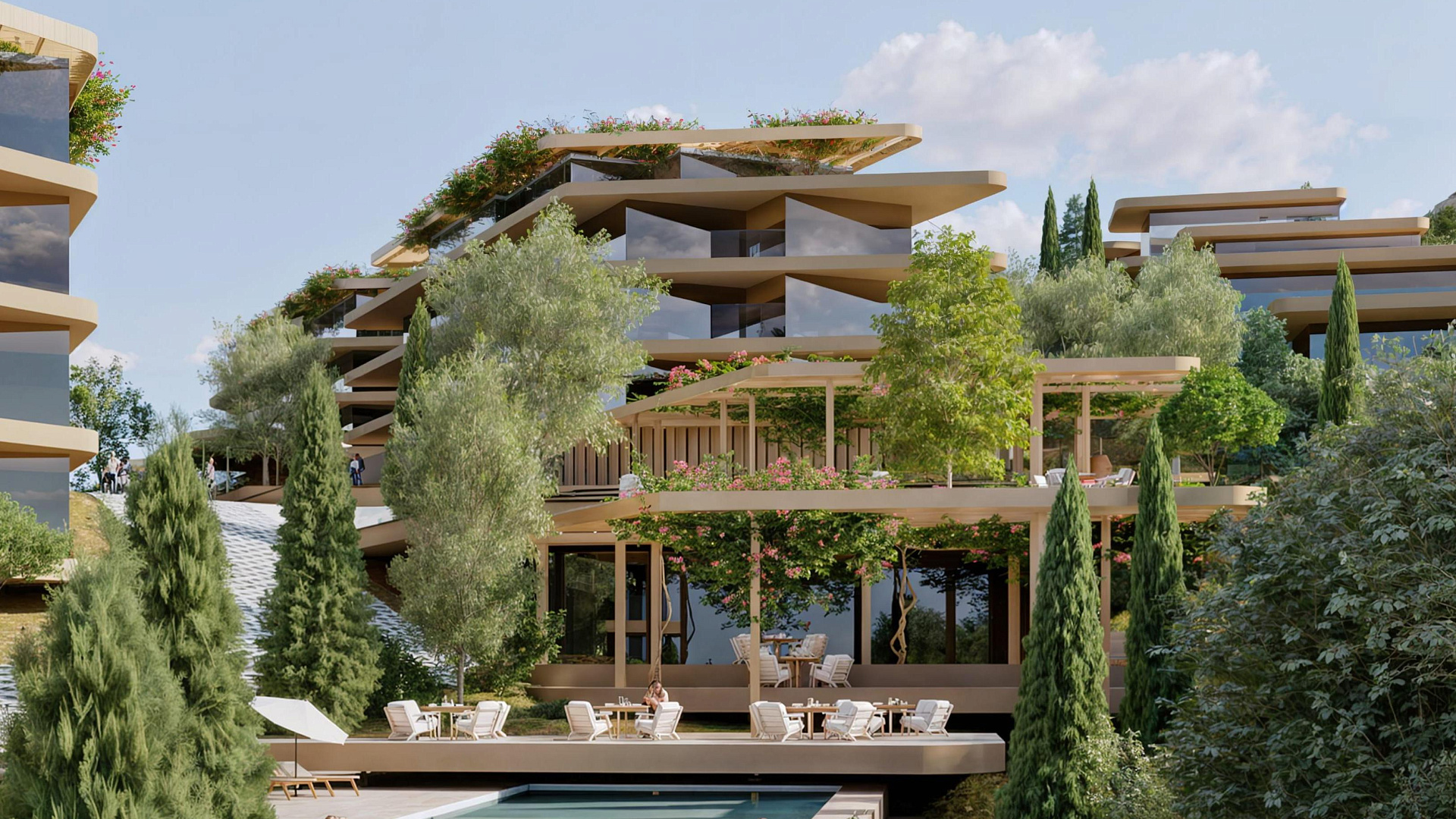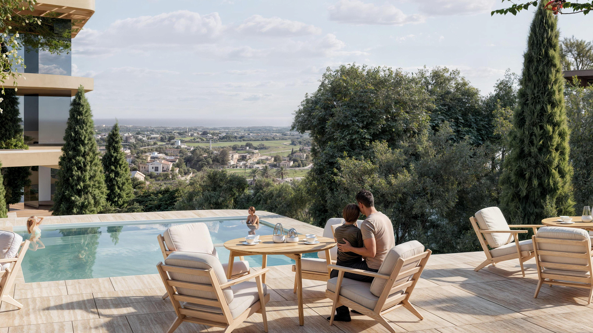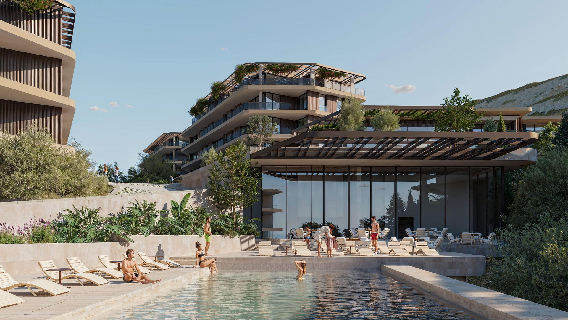 Каждая квартира в комплексе спроектирована с учетом максимального комфорта. В проекте предусмотрена гостиная и кухня открытой планировки, а также крытая веранда. Кроме того, имеется крытая парковка и индивидуальная кладовая. На территории комплекса есть бассейн.