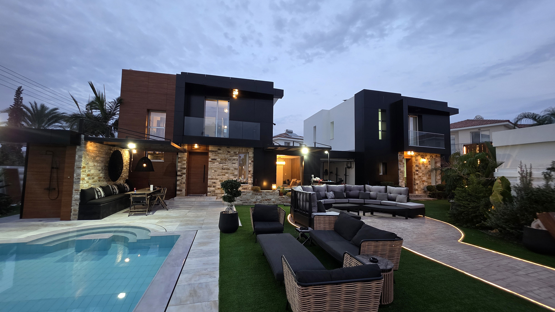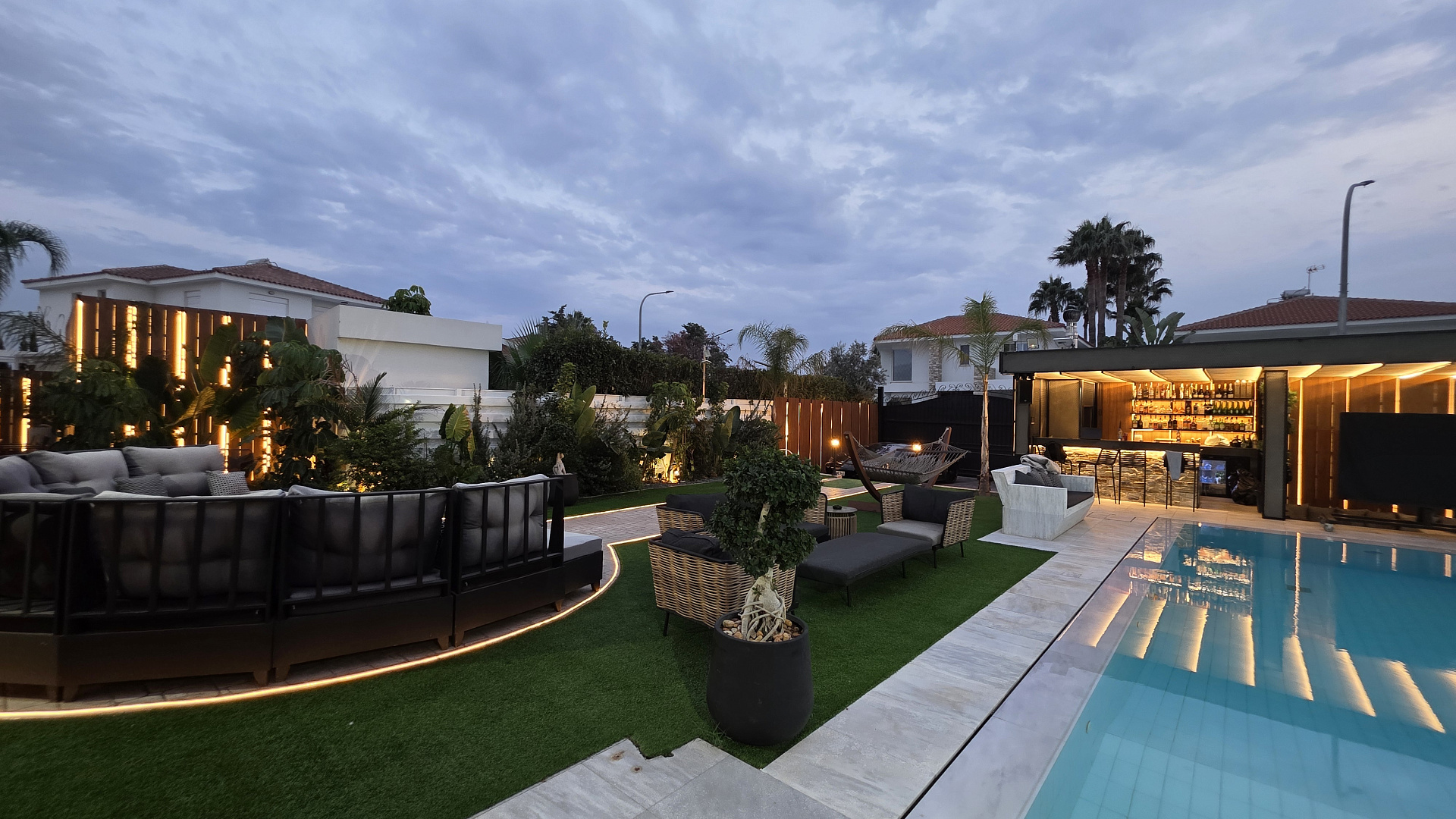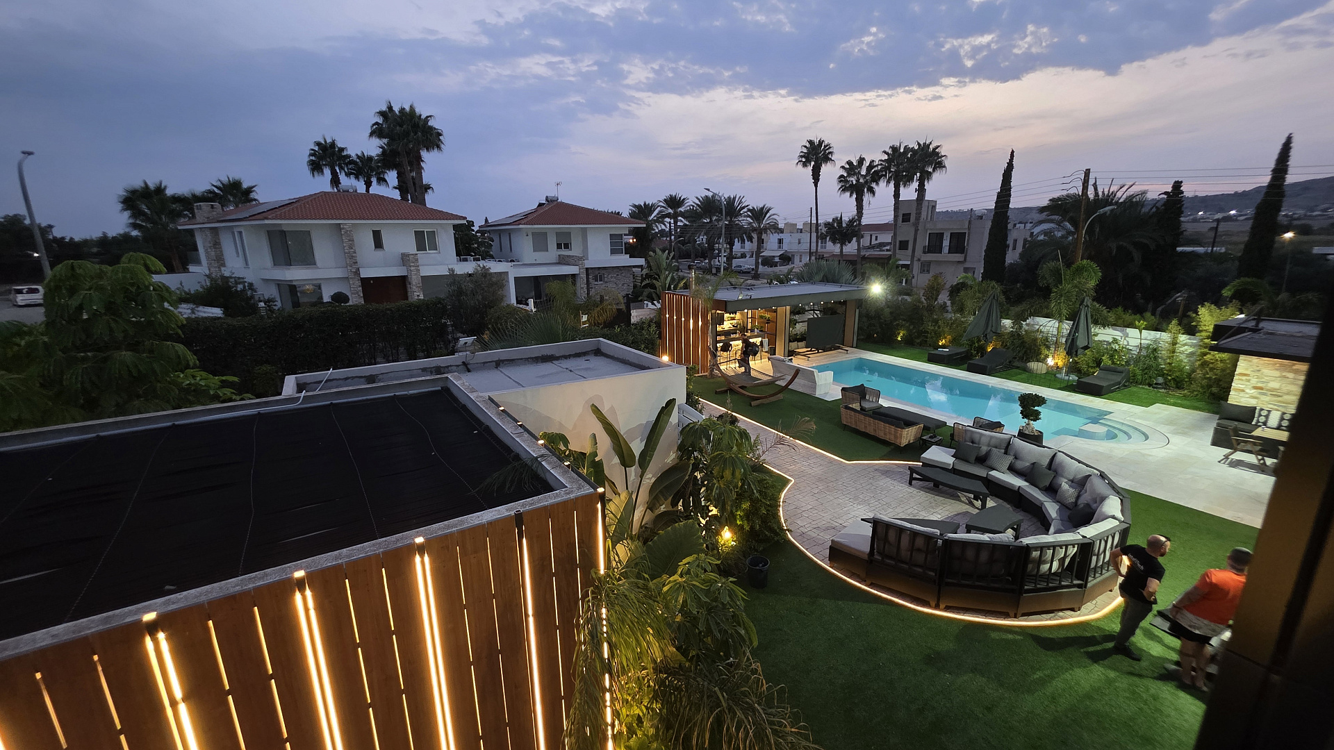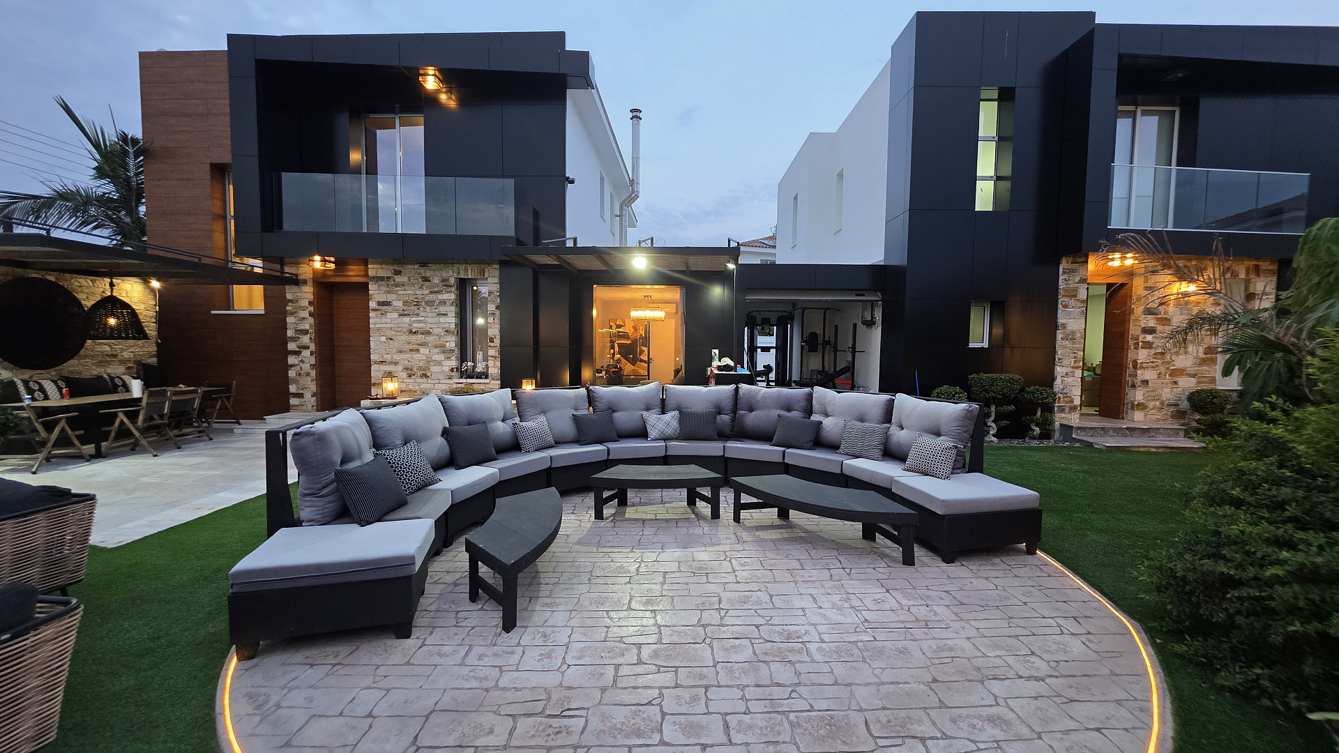 Виллы полностью меблированы роскошной мебелью Andreotti и оснащены техникой Neff и Samsung. Установлены премиальные аудиосистемы в помещениях и на улице, более шести телевизоров с диагональю 60–70 дюймов, а также интегрированные системы «умного дома», видеонаблюдения и сигнализации с ИИ-поддержкой. Управление охраной и воротами осуществляется через мобильное приложение.