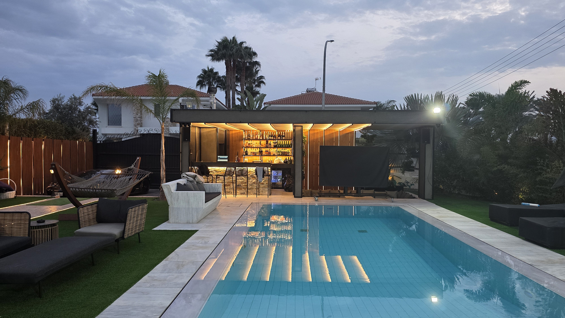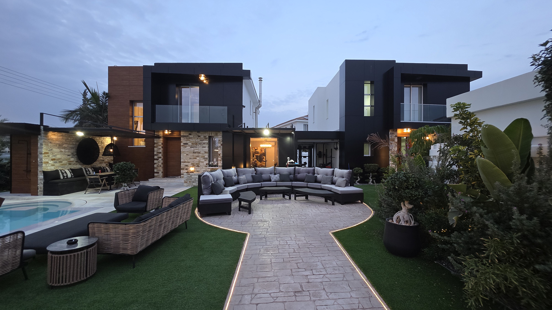 Поместье состоит из двух вилл, каждая из которых располагает просторными гостиными зонами, несколькими спальнями, ванными комнатами, полностью оборудованными кухнями, зонами отдыха и террасами. На территории расположены два бассейна (10 × 4 м и 6 × 3 м), тренажёрный зал, бар на открытом воздухе с холодильниками и кухней, а также уютная зона отдыха у костра. На участке предусмотрено две крытые парковки и дополнительное место для автомобилей снаружи.