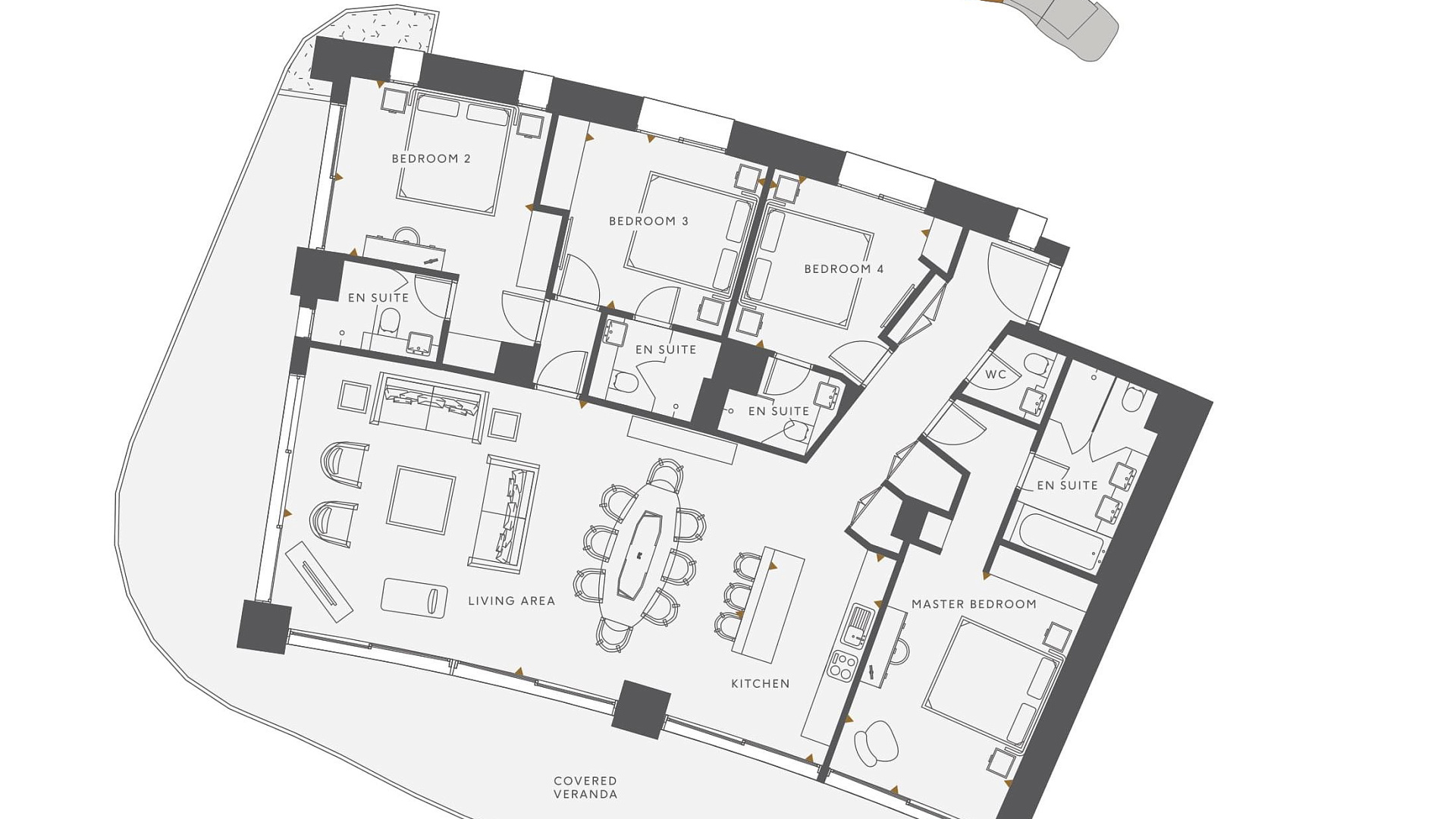 Пентхаус располагает четырьмя спальнями и четырьмя ванными комнатами, а также дополнительным гостевым туалетом. Продуманная планировка обеспечивает максимальный комфорт и функциональность. Есть крытая веранда площадью 66 м2. Для пентхауса также имеется парковочное место.