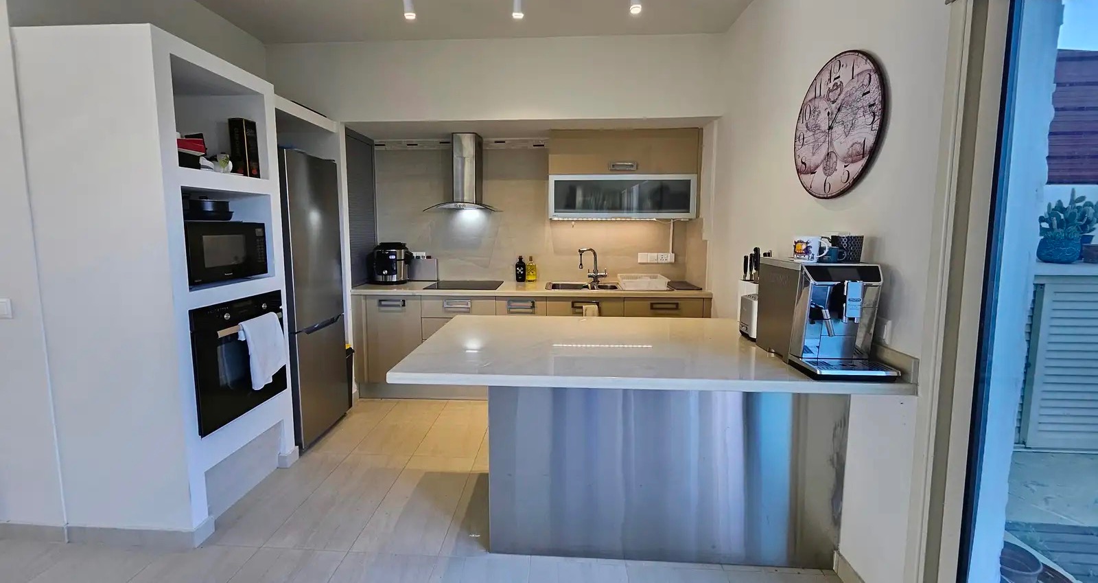 Продается трехспальный дом площадью 152 м² в районе Kiti, город Larnaca. Дом включает три спальни, три ванные комнаты, гостиную, кухню открытого типа, балкон, кладовую, а также крытый паркинг. Недвижимость полностью меблирована и оснащена системой кондиционирования воздуха во всех помещениях. В доме выполнен капитальный ремонт в 2024 году, установлены современные отделочные материалы и предусмотрена система центрального отопления (в стадии подготовки). На участке площадью 182 м² обустроен приватный сад и открытая терраса площадью 25 м², подходящая для отдыха и барбекю. Дом расположен в спокойном жилом районе, рядом с магазинами, школами, ресторанами и всего в нескольких минутах езды от центра Ларнаки, автомагистрали и аэропорта. Отдельным преимуществом является освобождение от НДС.