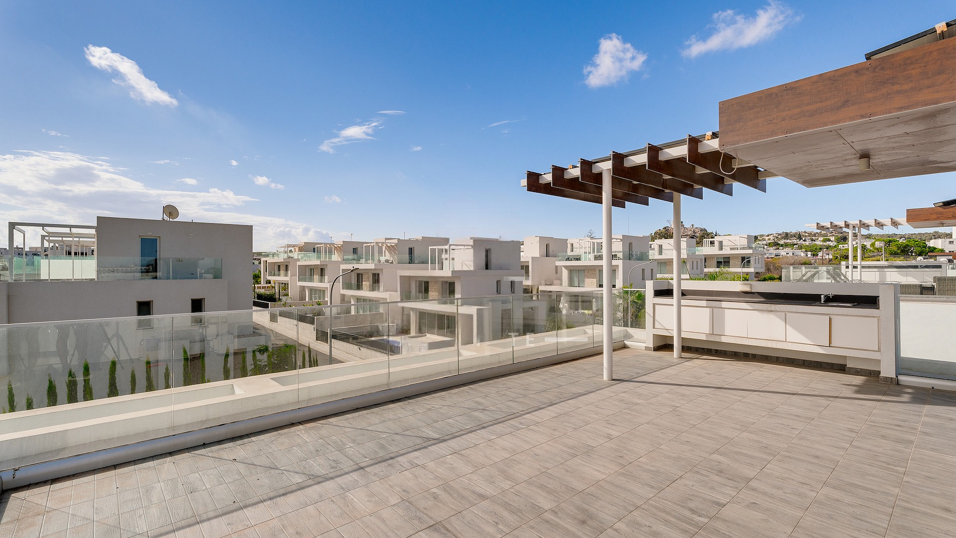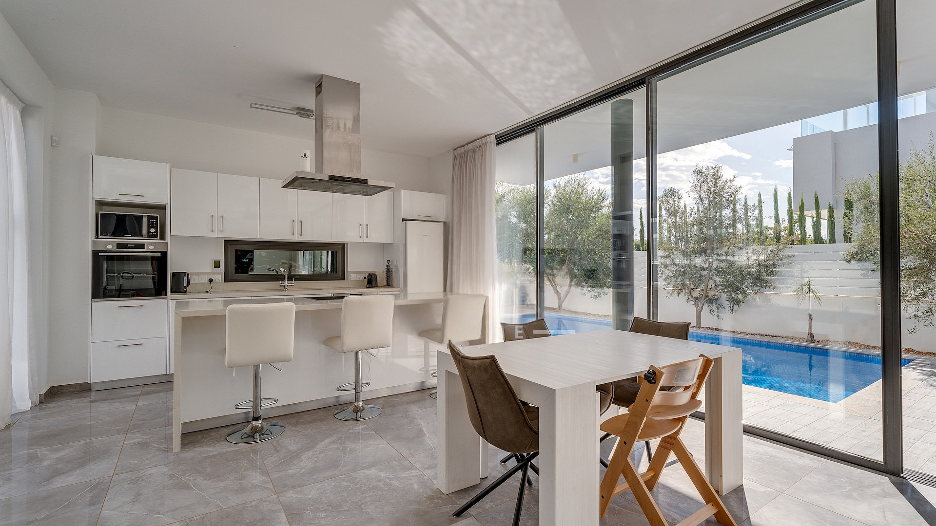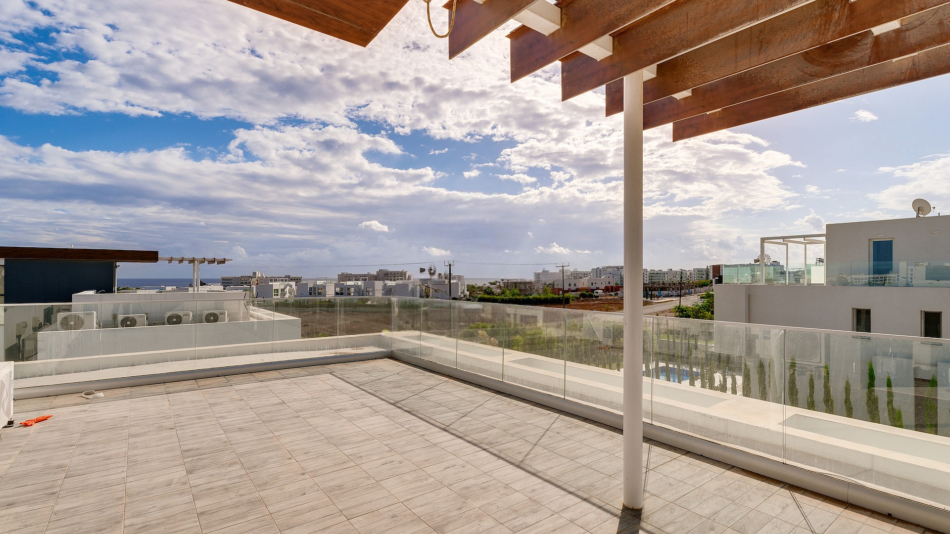 Продаётся трёхспальная вилла площадью 136 м² в районе Protaras, Famagusta. Резиденция включает три просторные спальни, две современные ванные комнаты, три санузла, кухню, совмещённую с обеденной зоной, светлую гостиную, внутреннюю лестницу, крытую веранду 35 м², открытую веранду 50 м², а также участок 260 м² с ухоженным садом и частным подогреваемым бассейном. На территории предусмотрен крытый гараж на два автомобиля с электрическими воротами. Вилла полностью меблирована, оснащена кухонной техникой и современными инженерными системами, включая 3.3 KW фотогальванические панели, солярный водонагреватель, кондиционирование (split units), систему «умный дом», сигнализацию, камеры наблюдения, систему контроля доступа, барбекю-зону и наружный душ. Вилла отличается панорамными видами на море, деревню, сельские ландшафты и открытые пространства, которые просматриваются благодаря большим окнам и продуманным внешним зонам. Объект имеет энергоэффективность класса A+. Недвижимость расположена в спокойном тупике (cul-de-sac), в районе с удобным выездом на шоссе и быстрым доступом к основным дорогам. До моря 500 м, до остановки общественного транспорта 600 м, магазины находятся в 400 м, курортная инфраструктура — в 600 м, школы — в 5 км, аэропорт — в 60 км.