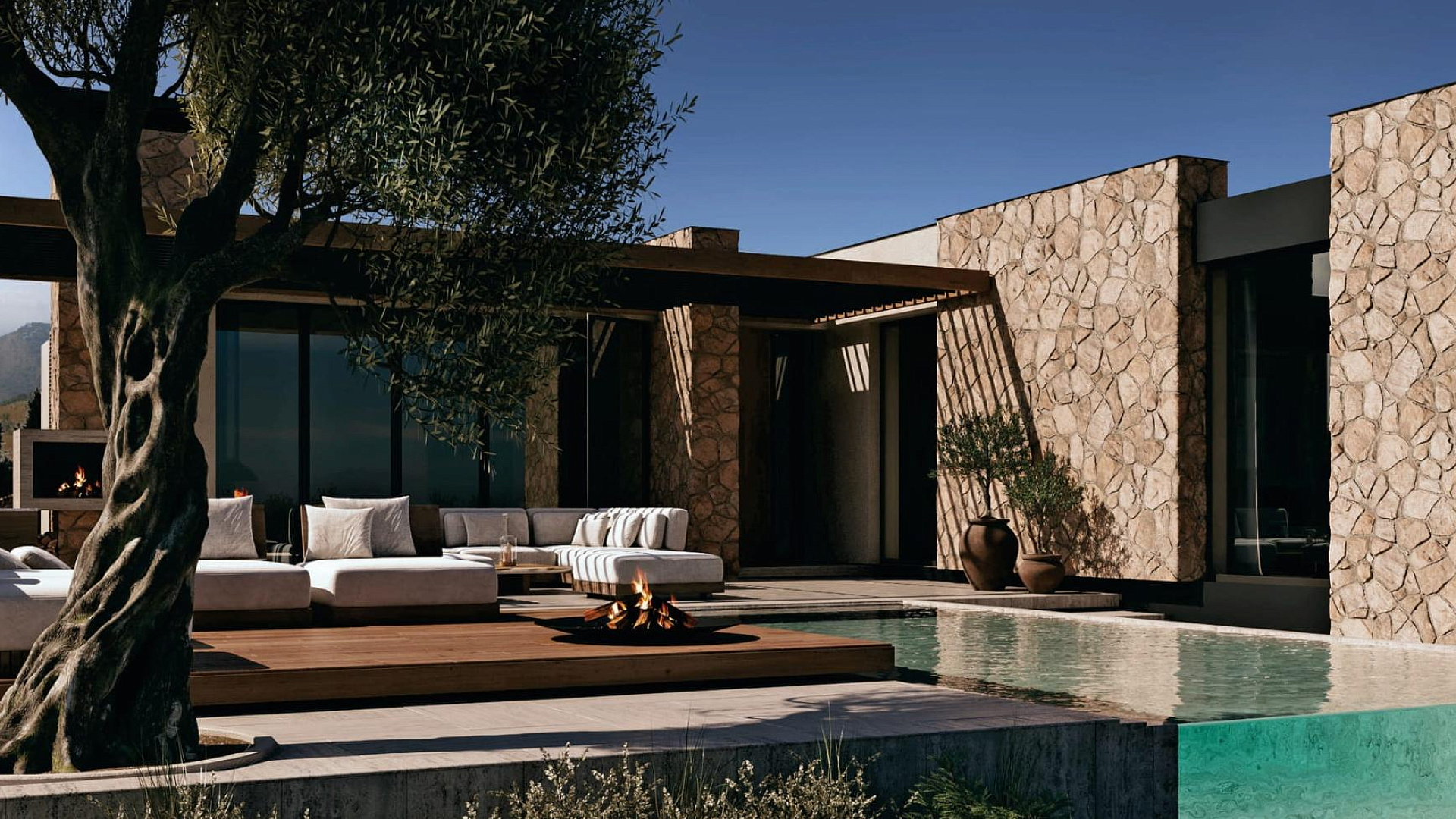 Вилла располагает тремя спальнями и двумя ванными комнатами, просторными крытыми верандами и садом на крыше. Также имеется парковка и кладовая. Есть собственный бассейн.