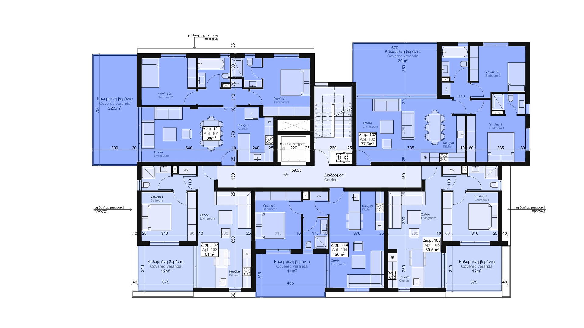 Каждая квартира в комплексе спроектирована с учетом максимального комфорта. В проекте предусмотрена гостиная и кухня открытой планировки, а также крытая веранда. Кроме того, имеется парковка и индивидуальная кладовая.