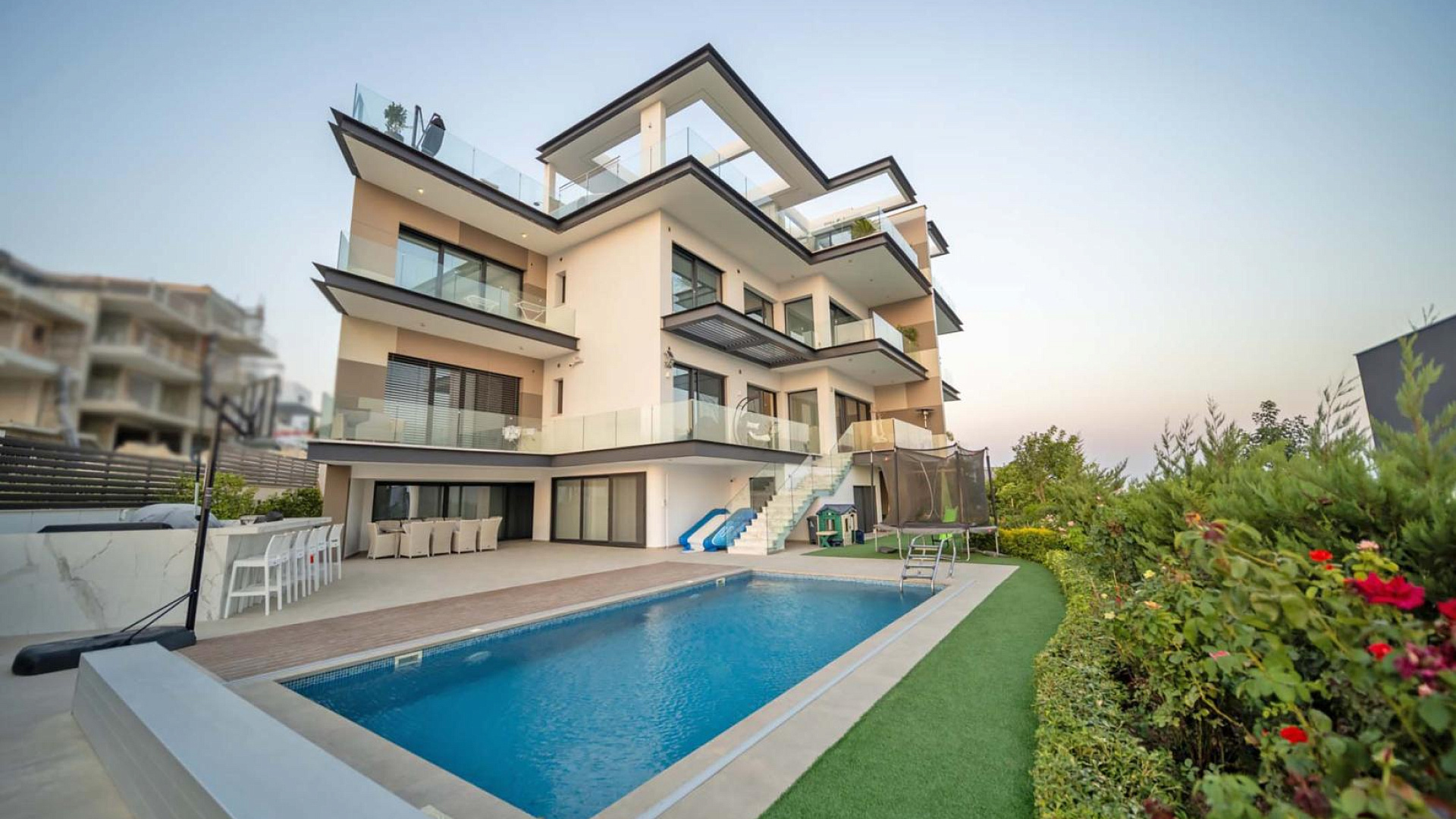 Продаётся пятиспальная двухуровневая квартира с частным бассейном и садом в районе Yermasoyia, Limassol, общей площадью 303 м²включая веранды, на участке 517 м². На участке расположены красиво оформленный сад, бассейн с детской защитной крышкой, наружная кухня, кладовое помещение, комната для оборудования, открытая парковка и дополнительное многофункциональное помещение. Первый уровень включает полностью оборудованную квартиру для няни с кухней и ванной комнатой, гостевой номер с собственной душевой и туалетом и прямой доступ к парковке. Второй уровень состоит из трёх спален с ванными комнатами, просторной кухни и гостиной, прачечной и открывает потрясающий вид на море. Квартира частично меблирована, оборудована офисным пространством, имеет три приватных парковочных места, тёплый пол, систему умного дома и камеры безопасности. Объект входит в закрытый комплекс всего из четырёх единиц, завершён в 2022 году и передаётся с Title Deeds. Эта двухуровневая квартира идеально подойдёт для тех, кто ищет комфортное и современное жильё в одном из самых престижных районов Limassol.
