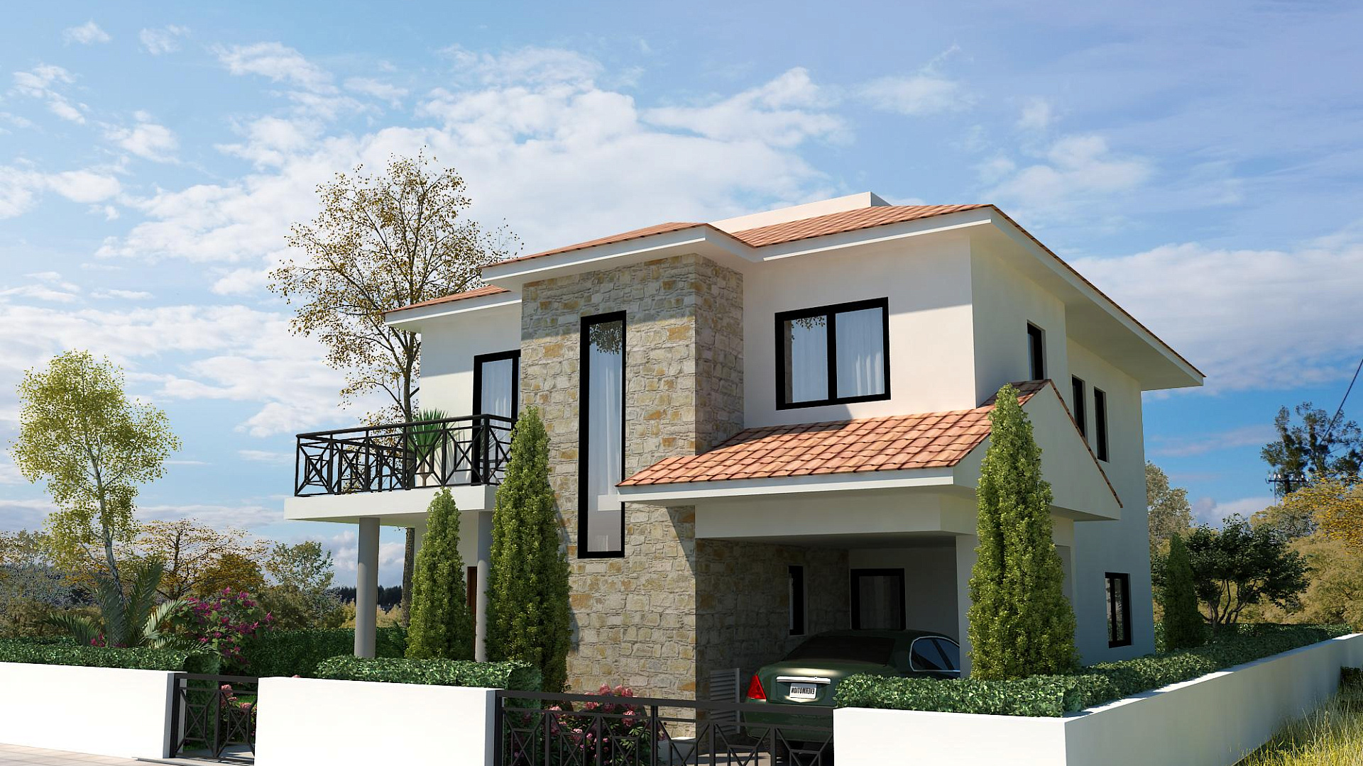 Дом построен из железобетонной конструкции с использованием современных строительных материалов и технологий. В отделке используются качественные керамические покрытия, ламинированный паркет в спальнях, мраморные элементы лестницы и современные интерьерные решения. Окна и раздвижные двери выполнены из алюминия с двойным остеклением, обеспечивающим тепло- и звукоизоляцию. Кухня оснащена современными кухонными шкафами с гранитной рабочей поверхностью, предусмотрены встроенные шкафы, качественная сантехника и солнечная система нагрева воды с резервуаром и системой водоснабжения под давлением. В доме предусмотрена подготовка для установки кондиционирования воздуха и электрического центрального отопления, а также камин с мраморной отделкой.