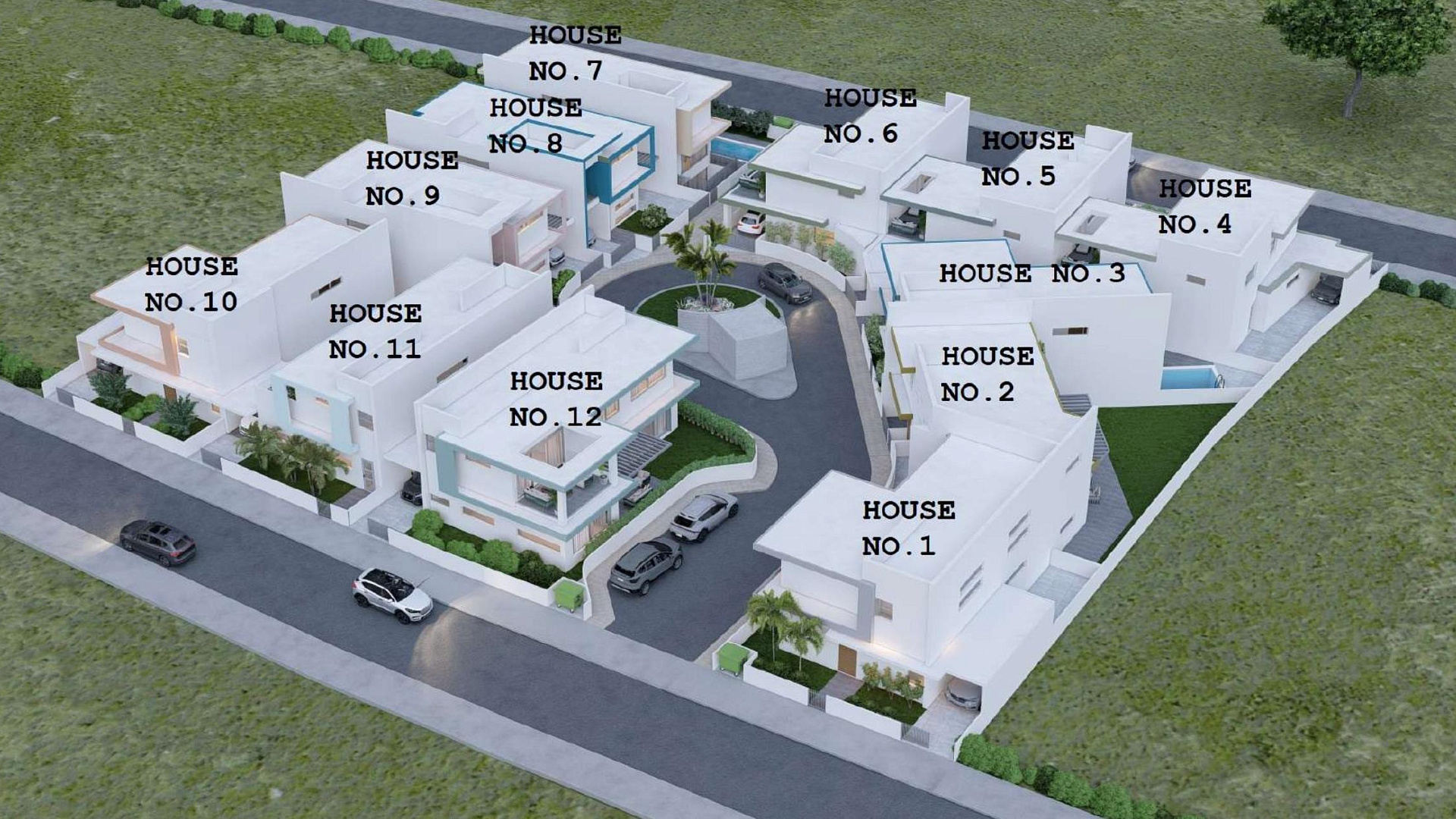 Каждый дом имеет просторную планировку с жилыми зонами открытого типа, современной кухней и частными открытыми пространствами, такими как сад или бассейн. Общая площадь земельного участка комплекса составляет 4238 м². Все дома двухэтажные, с тремя спальнями, собственными ванными комнатами и большими дворами. Шесть домов включают подвал, а семь домов оборудованы частными бассейнами.