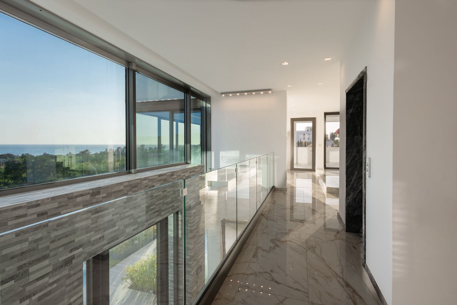 На вилле есть современный дизайнерский лифт, сауна, домашний кинотеатр/офис и помещение для персонала. Используемая система остекления позволяет использовать безрамные стеклянные углы, которые обеспечивают беспрепятственный обзор, сохраняя при этом тепловую и звукоизоляцию внутренних помещений. Потолки спален на верхнем этаже спроектированы так, чтобы придать им характер лофта, с переменной средней высотой 4 метра и полностью застекленными верхними окнами. Вилла оснащена фотоэлектрической системой мощностью 5 кВт, скрытым кондиционером и системой подогрева пола.