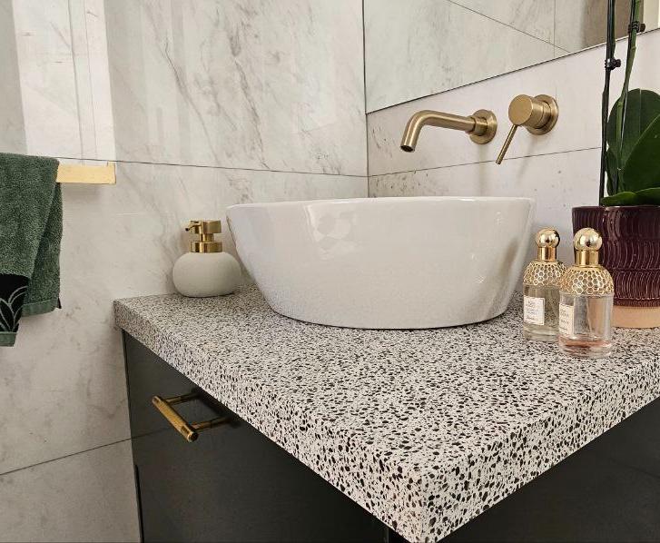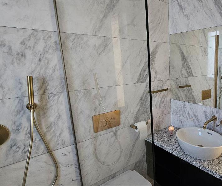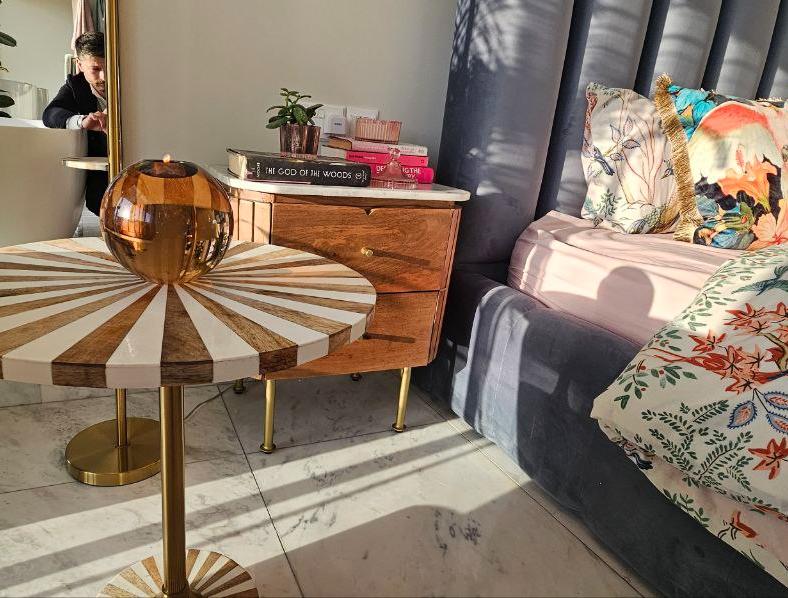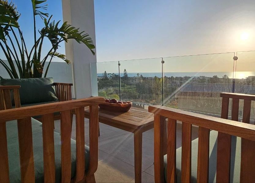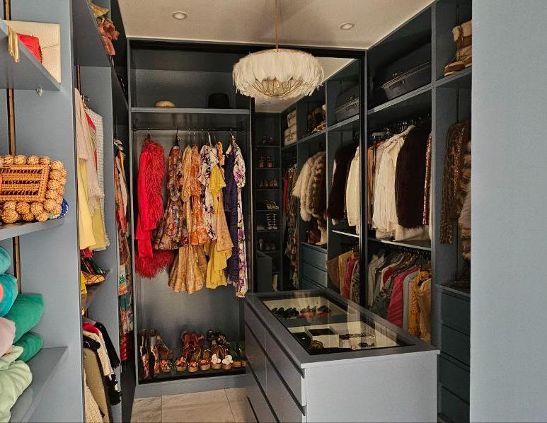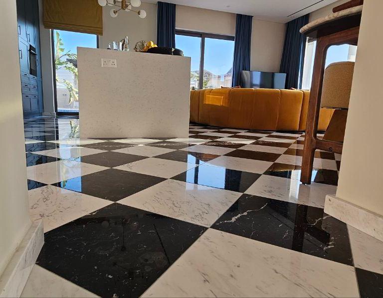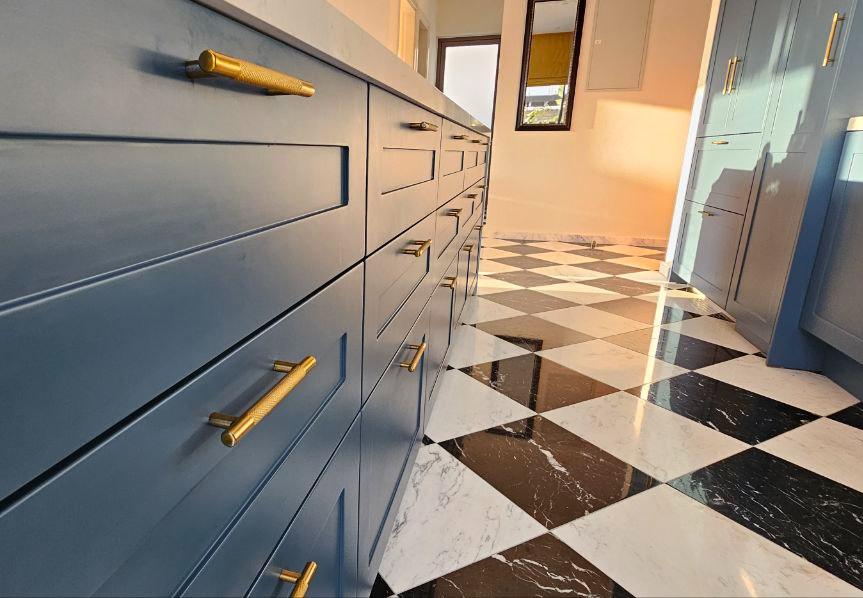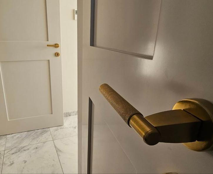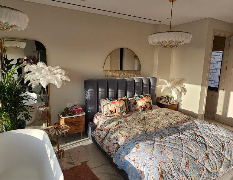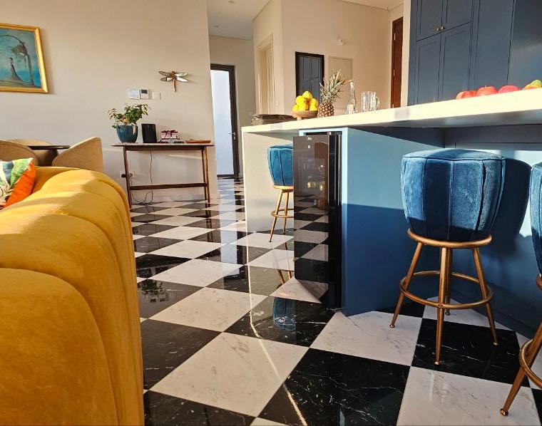 В главной спальне есть ванна, просторная душевая кабина с двойным тропическим душем и гардеробная в стиле бутика. Дизайнерская кухня выполнена в насыщенных глубоких синих тонах, дополнена скрытыми шкафами, двухдверным холодильником и винным холодильником. Вся резиденция отделана роскошными материалами, включая мраморные полы в шахматном порядке, гранитные столешницы в ванных комнатах и изысканную палитру глубоких синих, горчично-желтых и классических черных и белых оттенков.