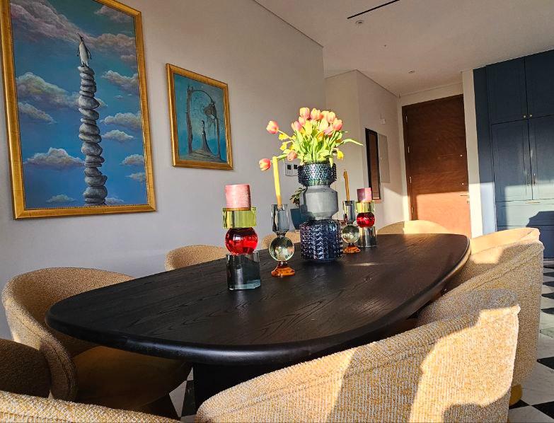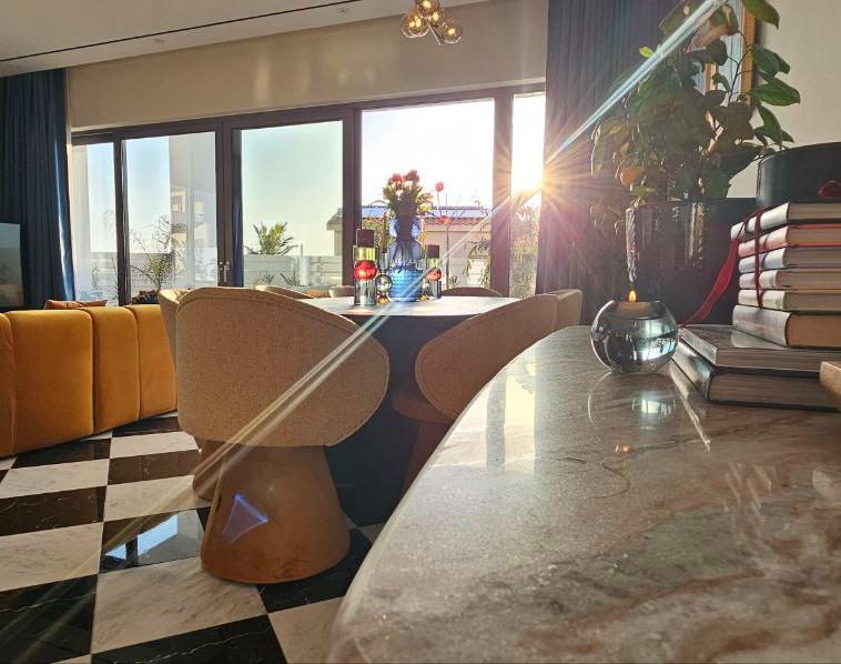 Общая площадь резиденции 224 м². Интерьеры выполнены в современном дизайне, включая изготовленную на заказ мебель из дерева и мрамора, утонченные золотые акценты, скульптурные световые инсталляции и оригинальные произведения современного искусства.