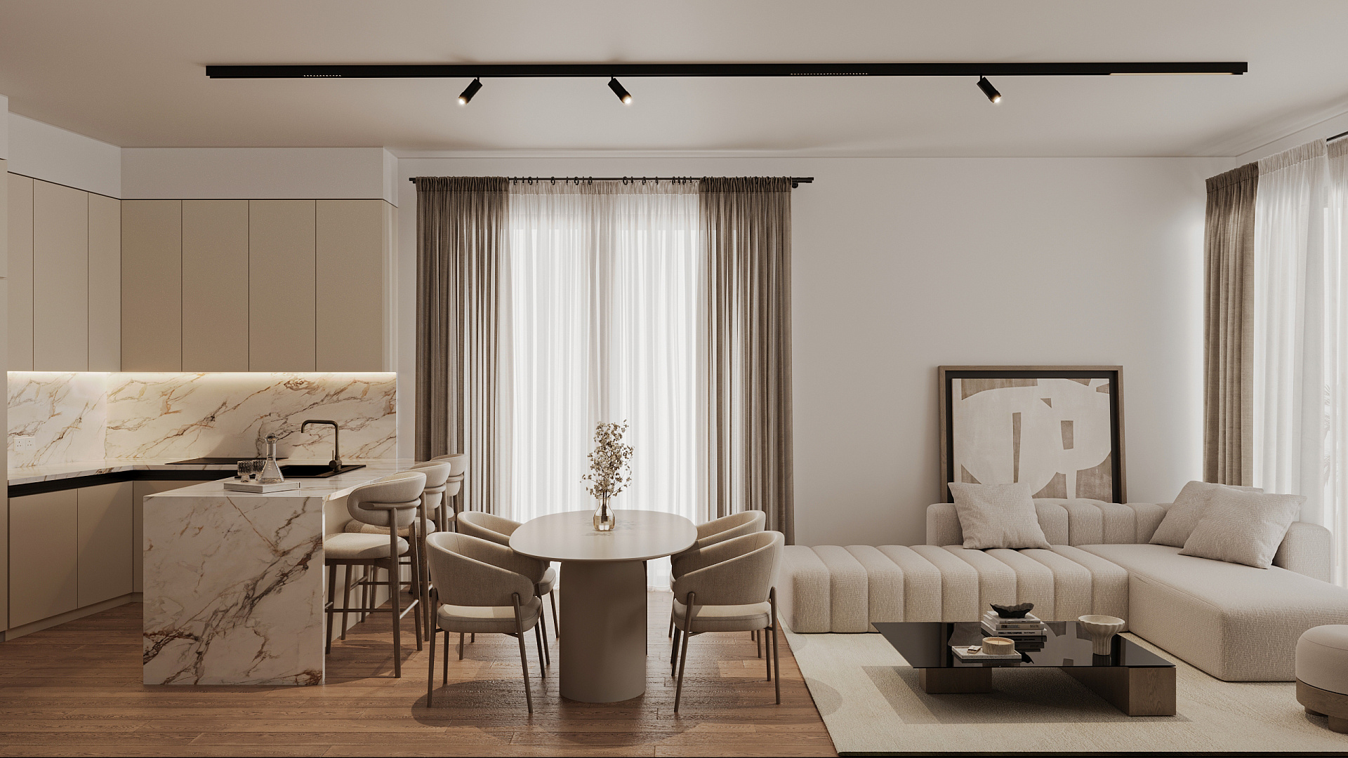 Квартира выполнена в современном стиле с просторной планировкой и высокими потолками (3 м), создающими ощущение пространства и света. Большие веранды обеспечивают гармоничное сочетание внутреннего и внешнего пространства, идеально подходя для отдыха.