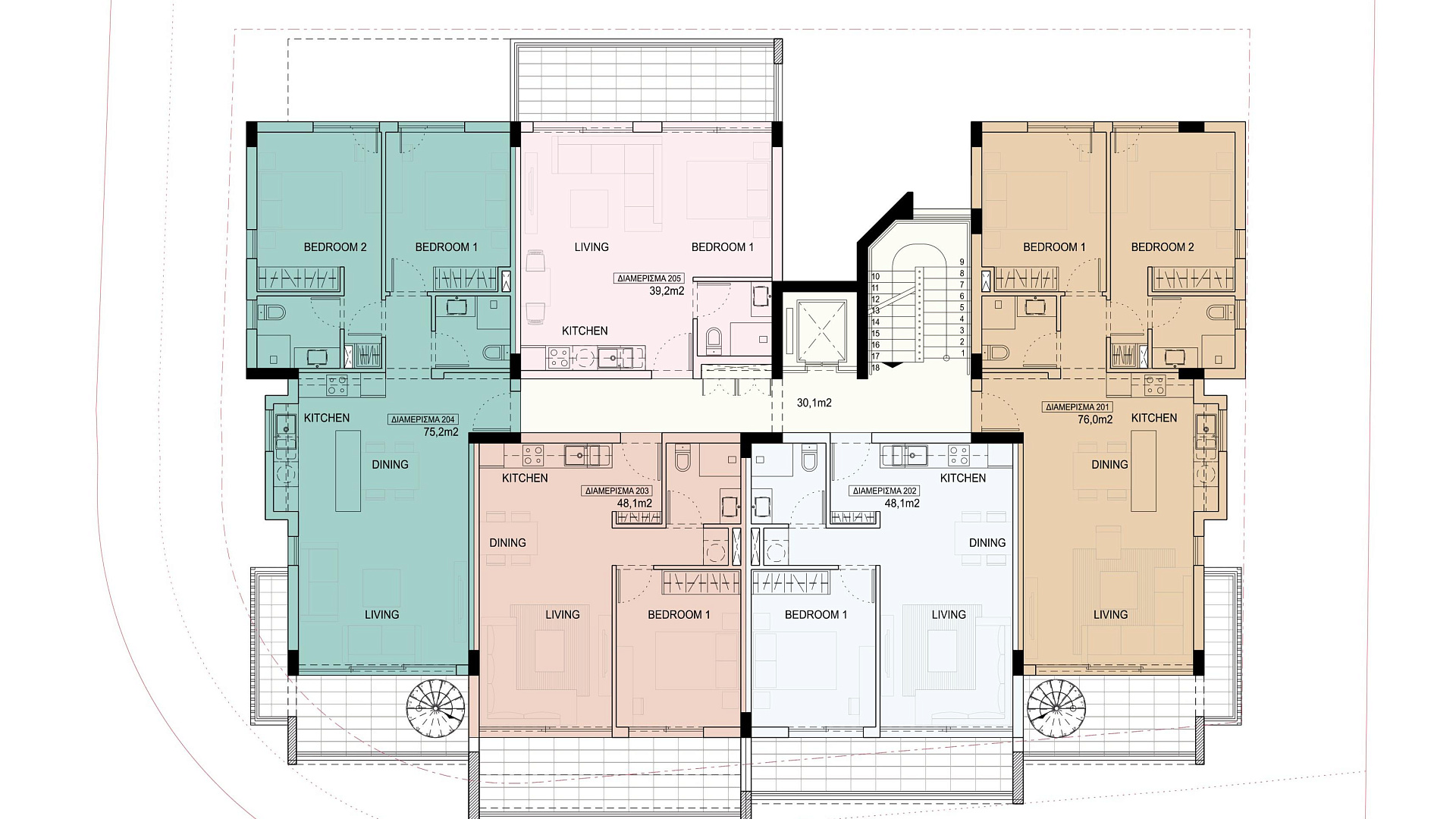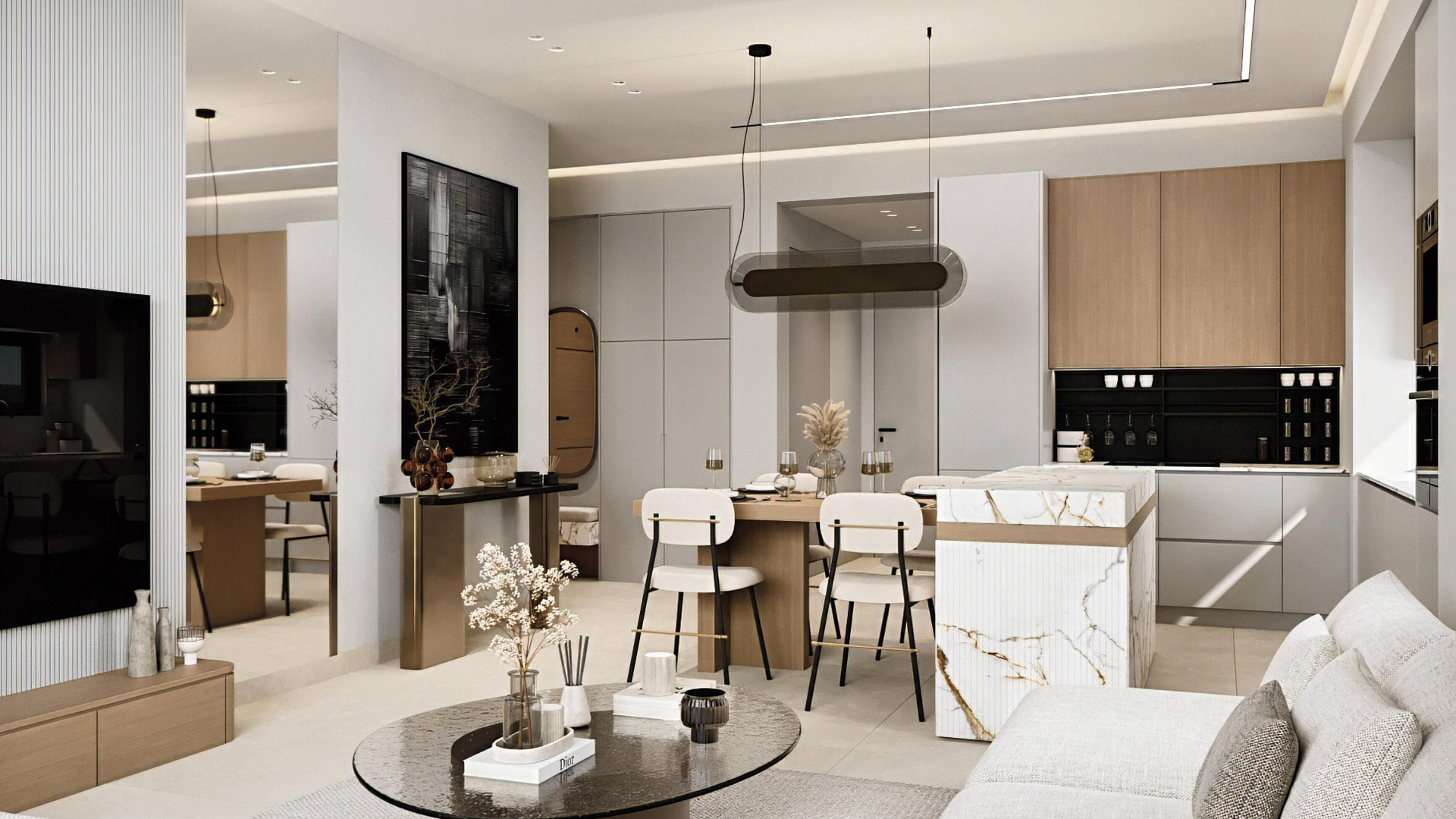 В каждой резиденции предусмотрены светлые интерьеры открытой планировки, отделка премиум-класса и просторные веранды. В некоторых апартаментах есть частные террасы на крыше с панорамным видом.