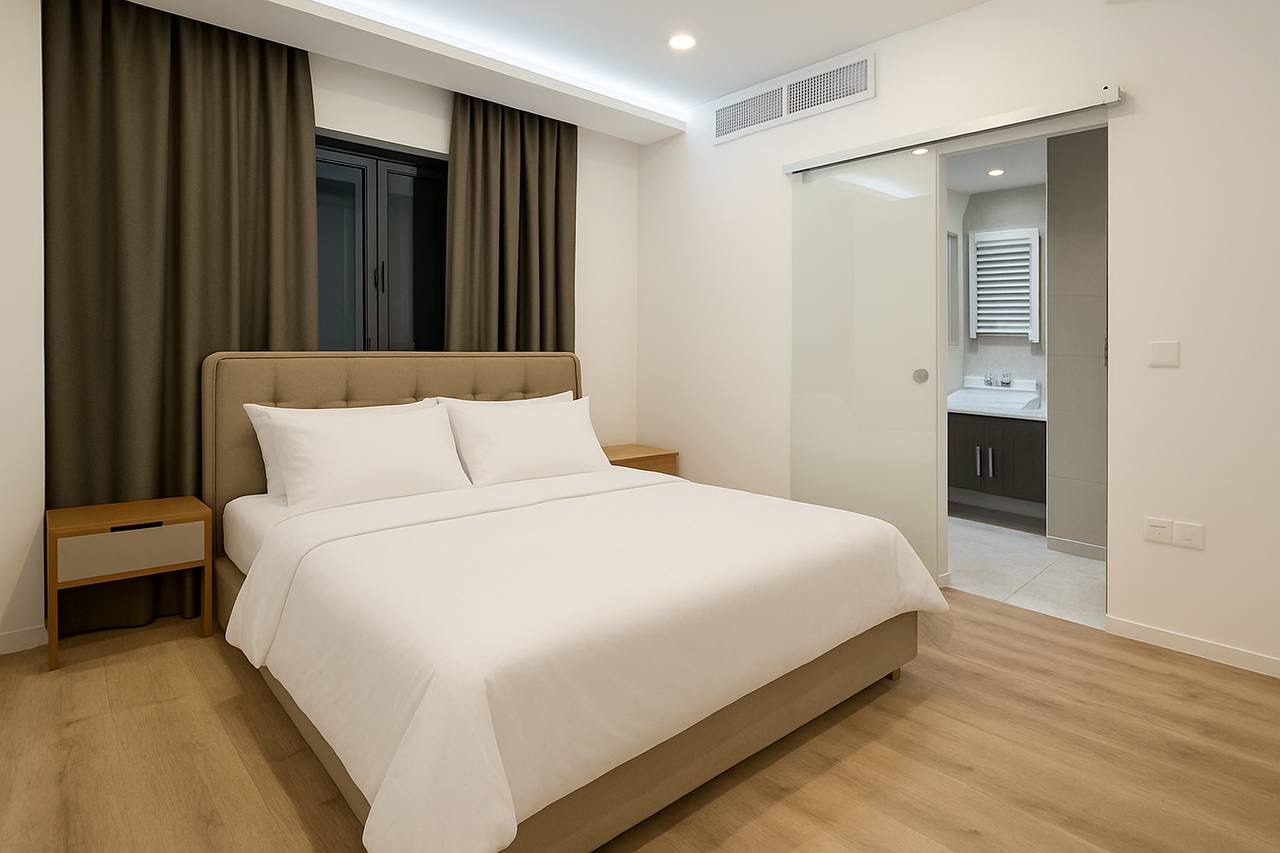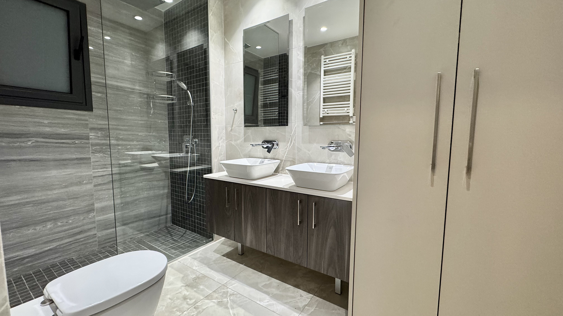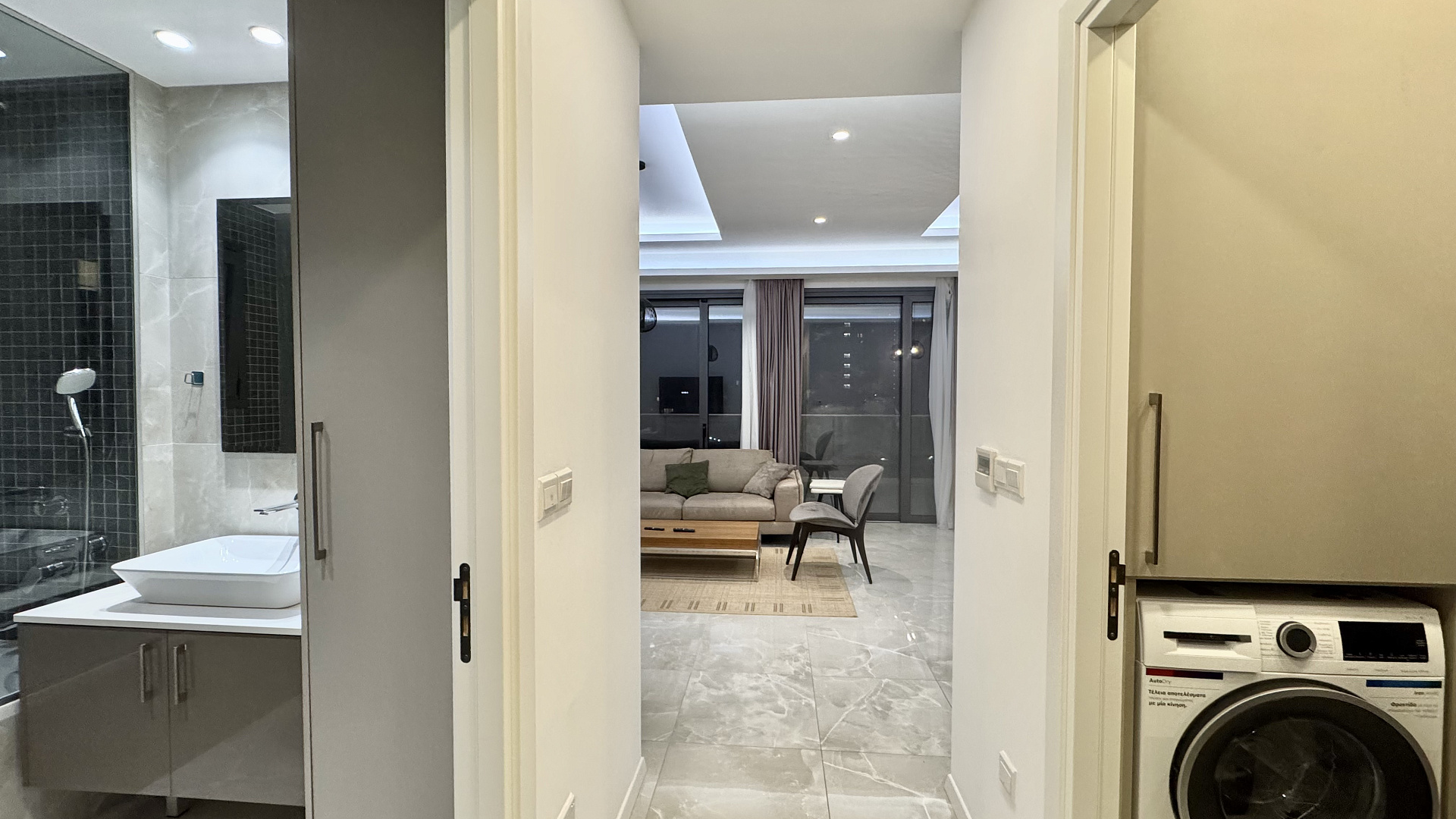 A three-bedroom apartment is for rent in a gated complex in Potamos Germasogeias, Limassol. The total area is 125 m², the apartment is fully furnished and features VRV air conditioning and underfloor heating. It includes two bathrooms, a living room, and an open-plan kitchen. The complex offers residents a swimming pool, gym, playground, storage room, and covered parking.