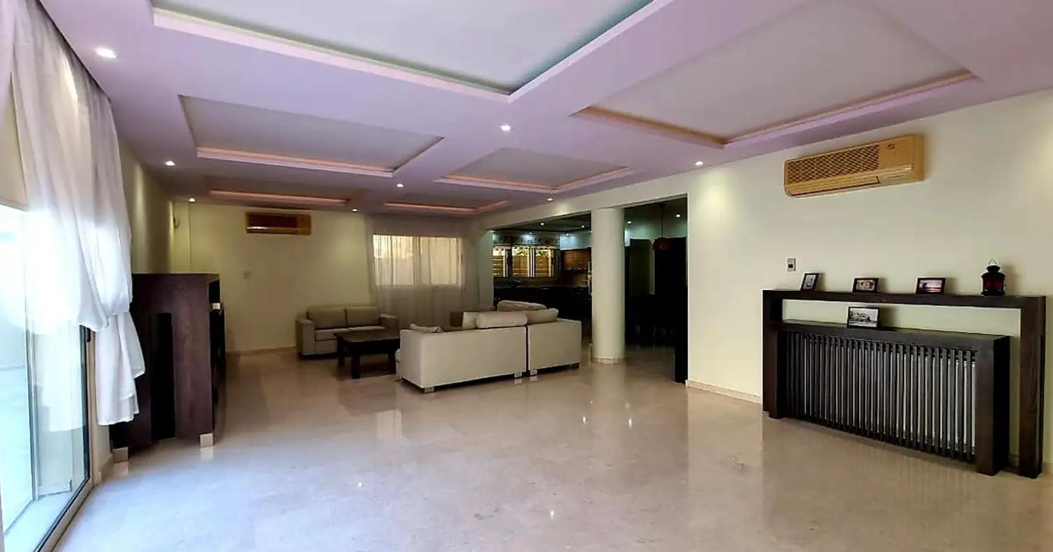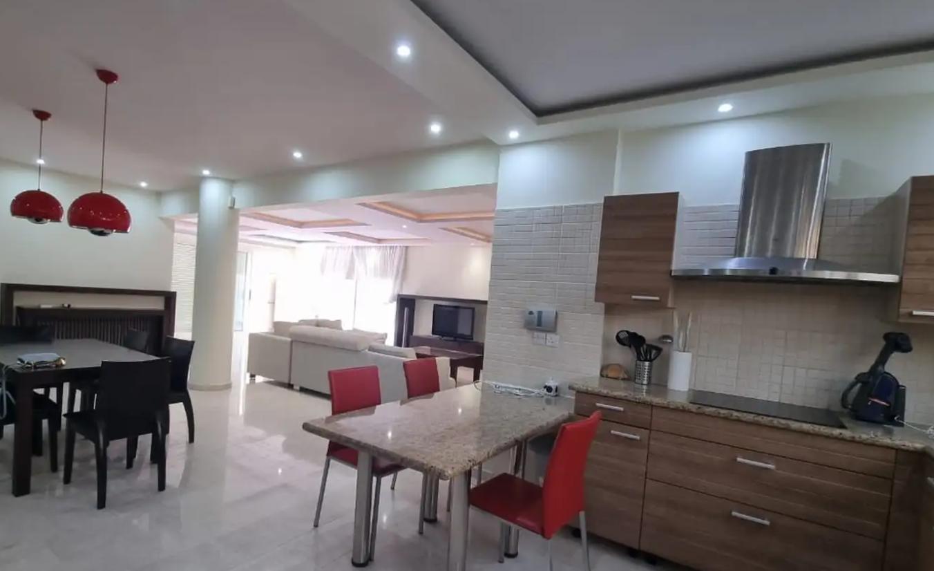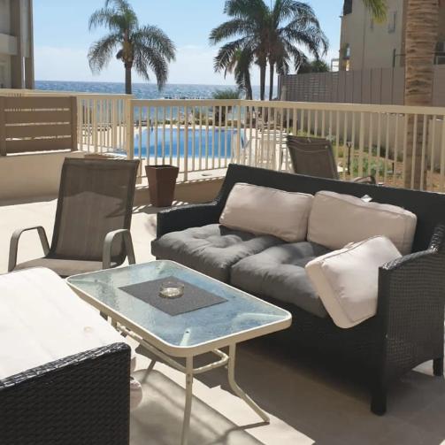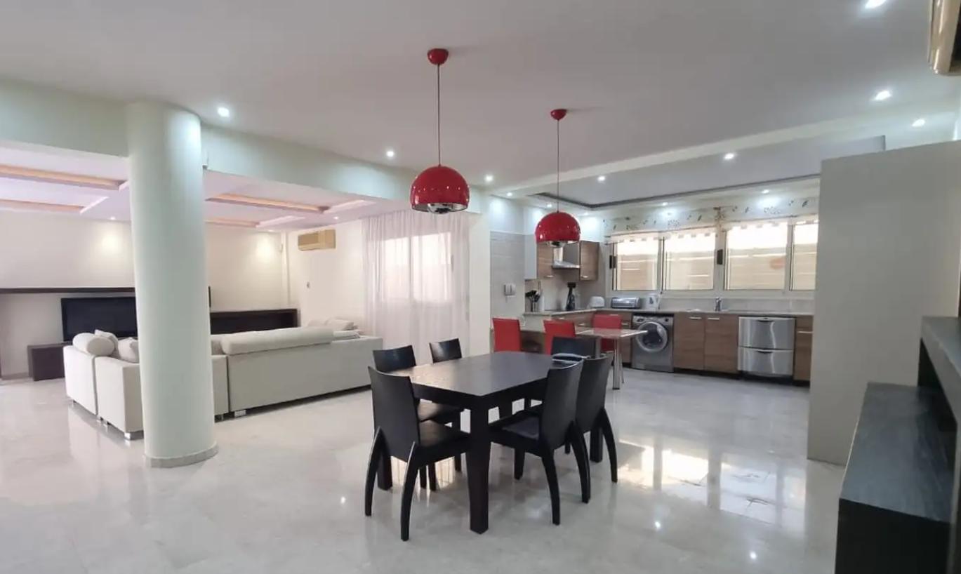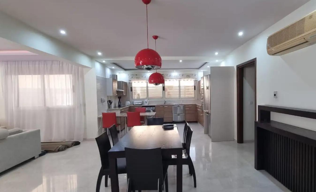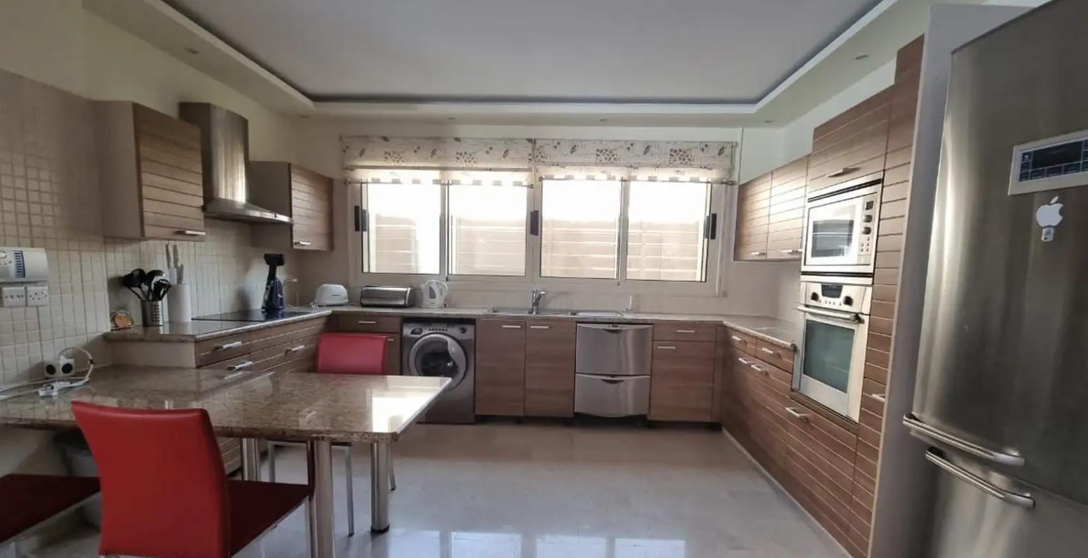 Three bedroom apartment for rent in Potamos Germasogeia Tourist Area, Limassol. The total area is 210 m2, located on the ground floor, fully furnished, with air conditioning in all rooms. The apartment has three bedrooms and three bathrooms. There is a communal swimming pool, garden, elevator and covered parking. A heating system is installed. The apartment is located on the first line and close to all amenities.