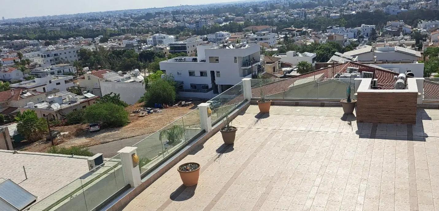 Two-bedroom penthouse for rent in Lakatameia area - Agios Nikolaos Nicosia .The interior area is 90 m2, located on the second floor. The penthouse has two bedrooms, two bathrooms and a large terrace of 140 m2. There is an elevator, a storage room and a covered parking space. Air conditioners are installed in all rooms.