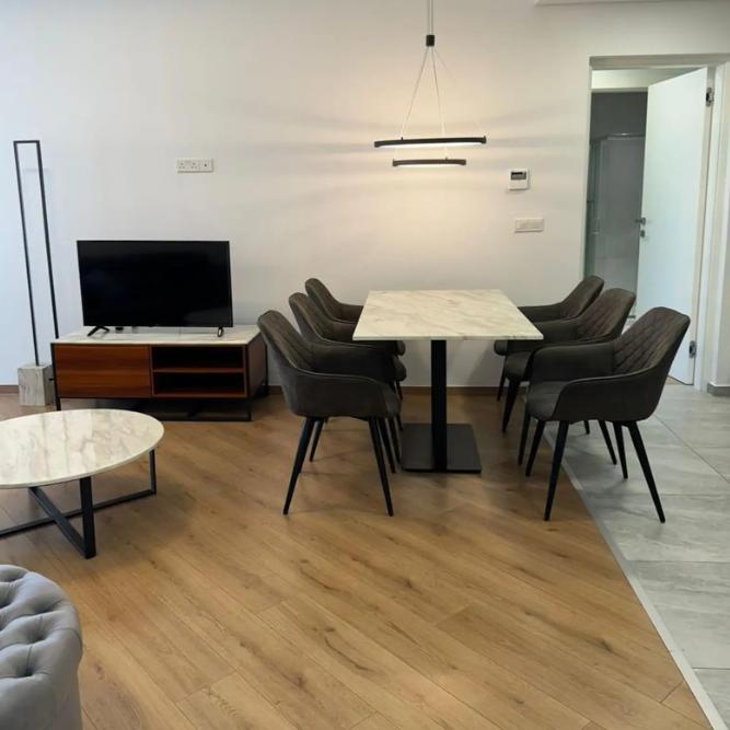 Two-bedroom apartment for rent in Kapsalos Limassol area of 93 m2 on the ground floor. The apartment is fully furnished and equipped with all necessary appliances, includes two bedrooms, two bathrooms (both en-suite), a kitchen and a living room. The complex has a storage room, a covered parking space and a guarded territory.