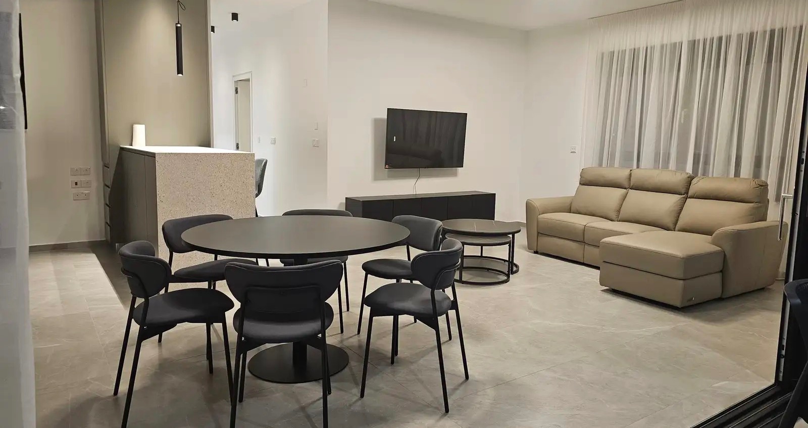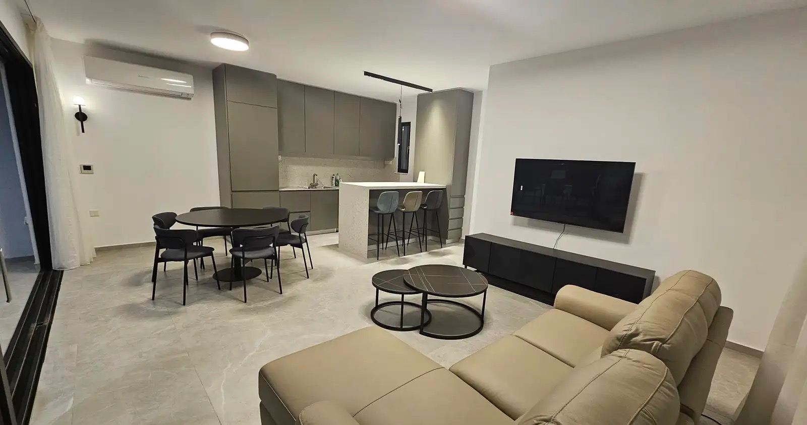 Modern 2 bedroom apartment of 115 m2 for rent in Kapsalos area, Limassol. The apartments include two spacious bedrooms, two bathrooms (bathtub and separate shower), an open kitchen with an island combined with a living room, a laundry room, a balcony and a pantry. The apartment is fully furnished and equipped with household appliances: washing machine and dryer, TV, air conditioning in all rooms. The building has a photovoltaic system. The property is located on a quiet residential street at the address, within walking distance of basic amenities and public transport. Apartment in a new building built in 2024, energy efficiency class A. There are no household expenses.