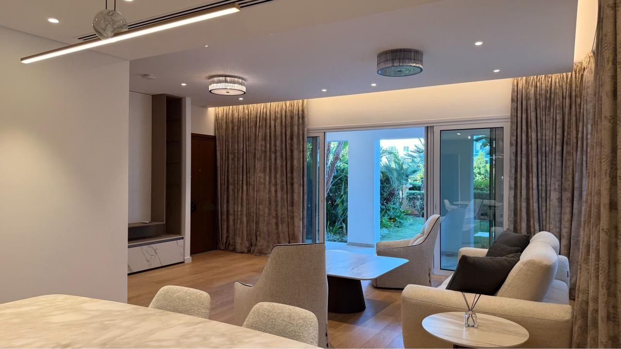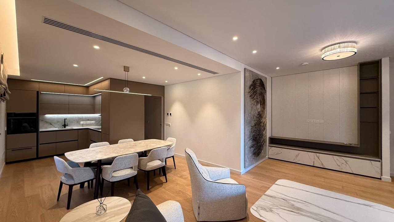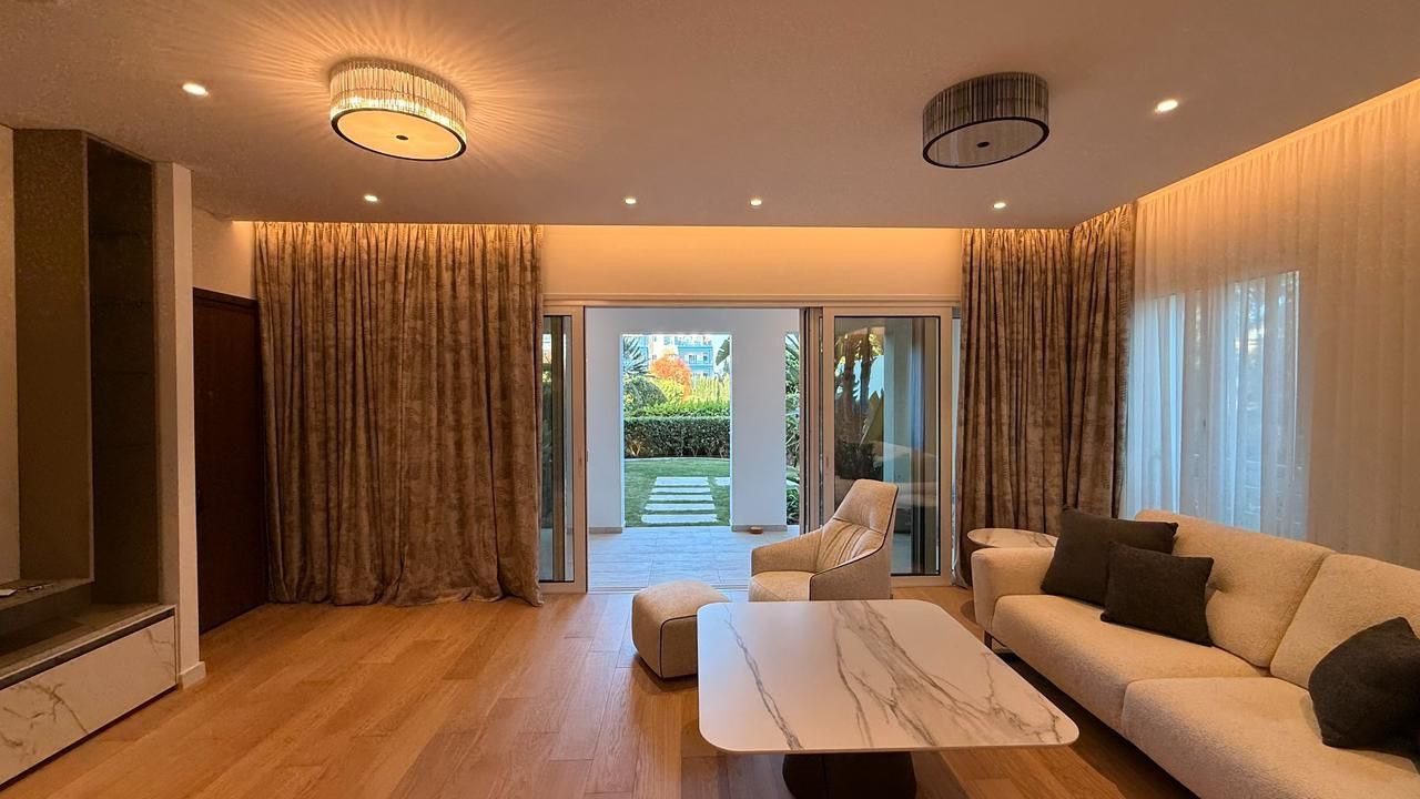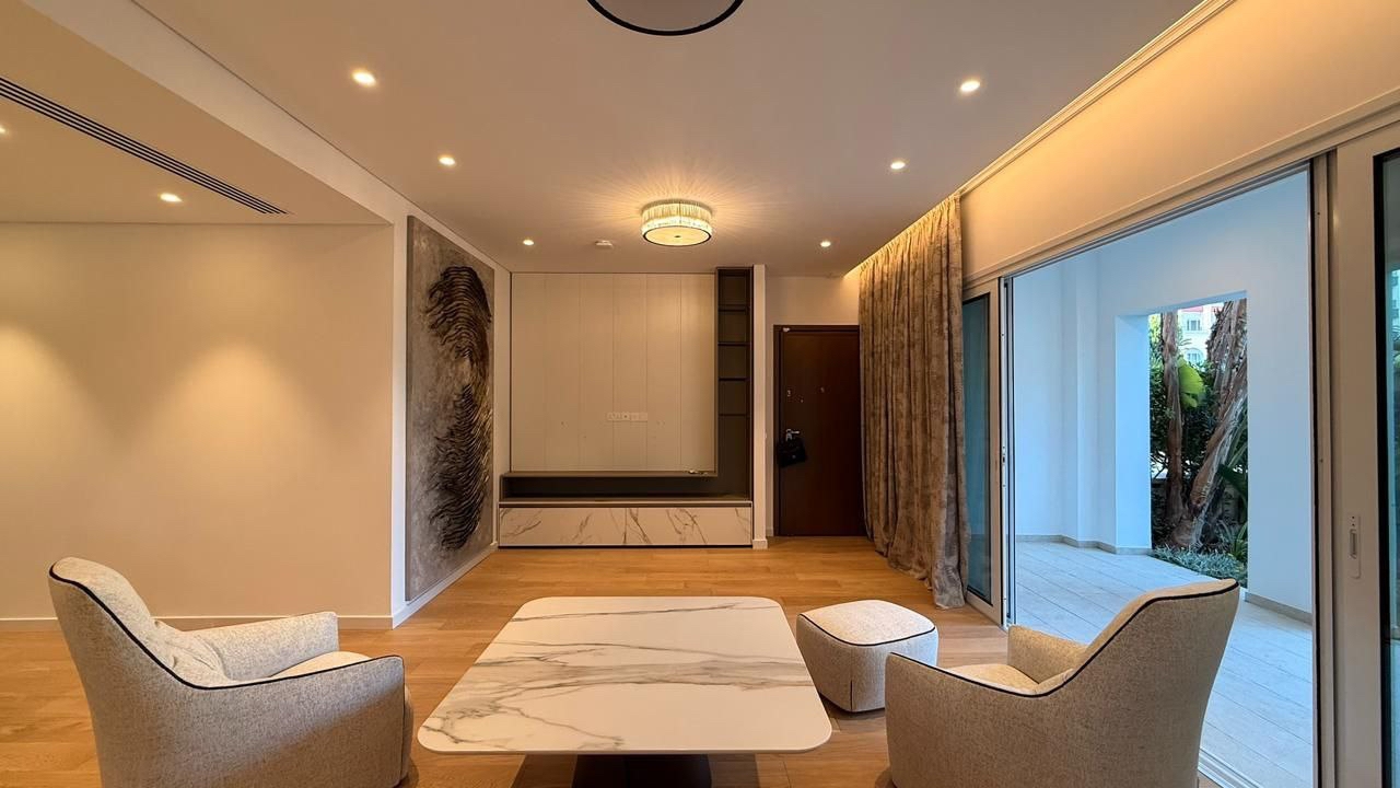 Two-bedroom apartment of 143 m2 for rent in Limassol Marina area, Limassol city. These luxury apartments are located on the ground floor of a private artificial island, just 50 m from the sandy beach, and have their own large garden of 313 m2. The apartment includes 2 spacious bedrooms (converted from a three-bedroom), 3 modern bathrooms, an open living room, a dining area and an open-plan kitchen opening onto a private garden.The apartments have been completely renovated from floor to ceiling, using modern materials and high—end finishes. The property is partially furnished and fully equipped with household appliances, including VRV air conditioning and underfloor heating around the perimeter. There is an underground parking space. The building was built in 2013, the facility is under long-term lease (Leasehold).