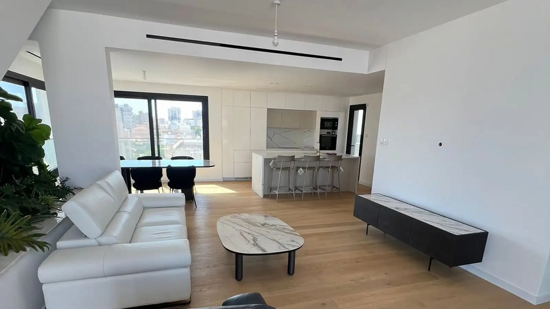 Three-bedroom penthouse with an area of 306 m2 for rent in the area of Agios Nektarios, Limassol city. The penthouse occupies the 4th and 5th floors and includes three bedrooms (including the master bedroom with a separate veranda), four bathrooms — two with a shower, one with a bathtub — and a guest toilet, a spacious living room, a kitchen, several verandas, a storage room of 5 m2, as well as an internal garden with automatic irrigation and lighting. The penthouse is fully furnished and equipped with household appliances: built-in Liebherr two-door refrigerator, oven, microwave, dishwasher and Bosch washing machine. The house has Mitsubishi underfloor heating, a central VRV air conditioning system (24,000 BTU), separate air conditioners in the bedrooms (9,000 and 12,000 BTU), mosquito nets and a 3.5 kW photovoltaic system. On the roof there is a private swimming pool, sauna, barbecue area, refrigerator, sink and garden with automatic irrigation. The house has natural wood parquet, Italian furniture: a king—size leather bed, sofas (3-seater and 1-seater with a folding seat), a coffee table, a dining table and chairs. Residents have at their disposal two covered parking spaces with automatic gates and the ability to charge electric vehicles, surveillance cameras and an alarm system. The building was built in the new year (2025) with an elevator, a well-maintained garden and a high energy efficiency class A.
