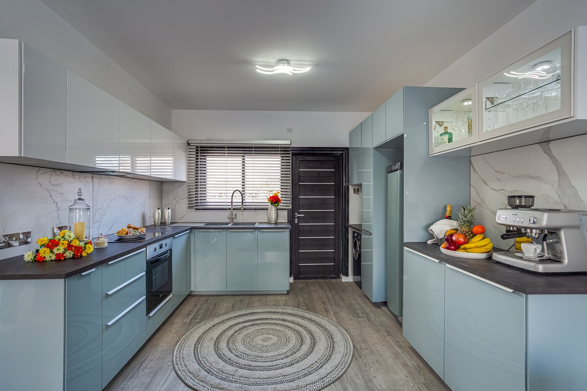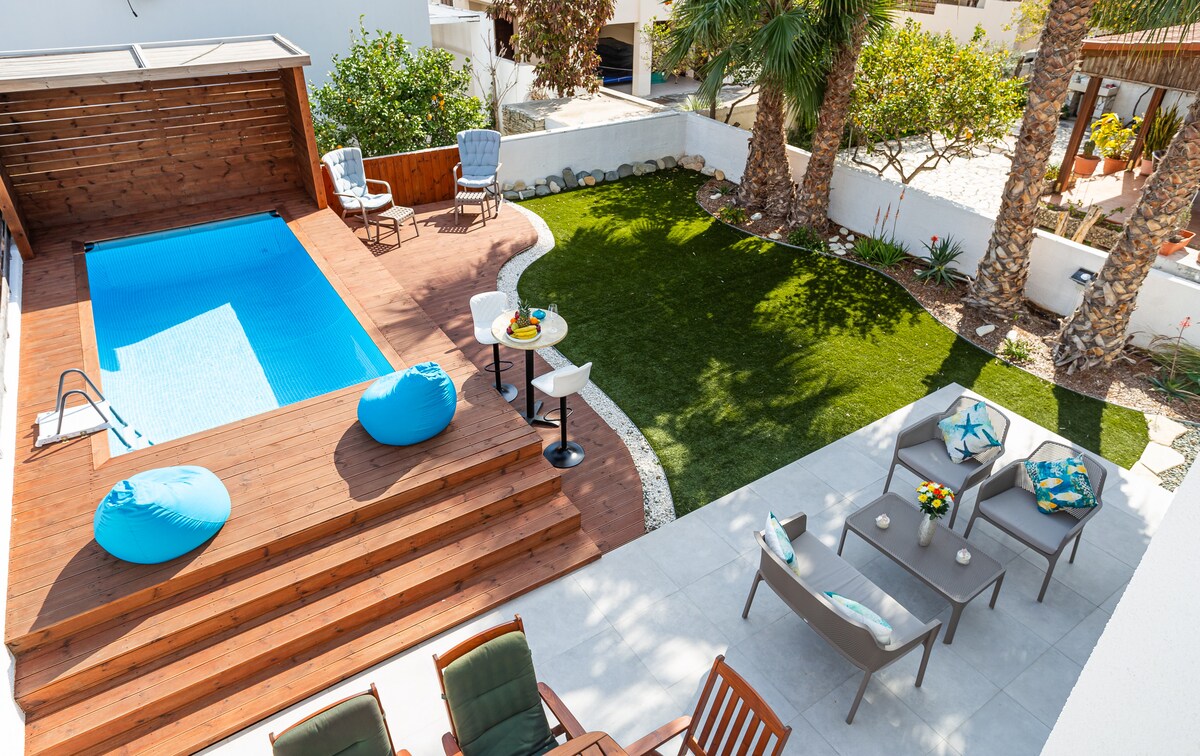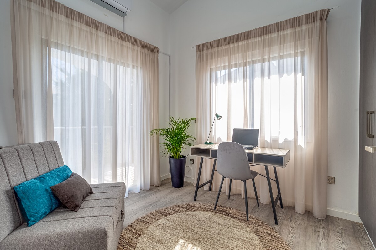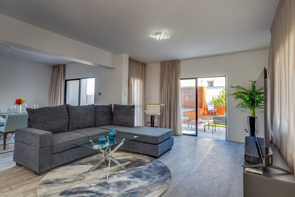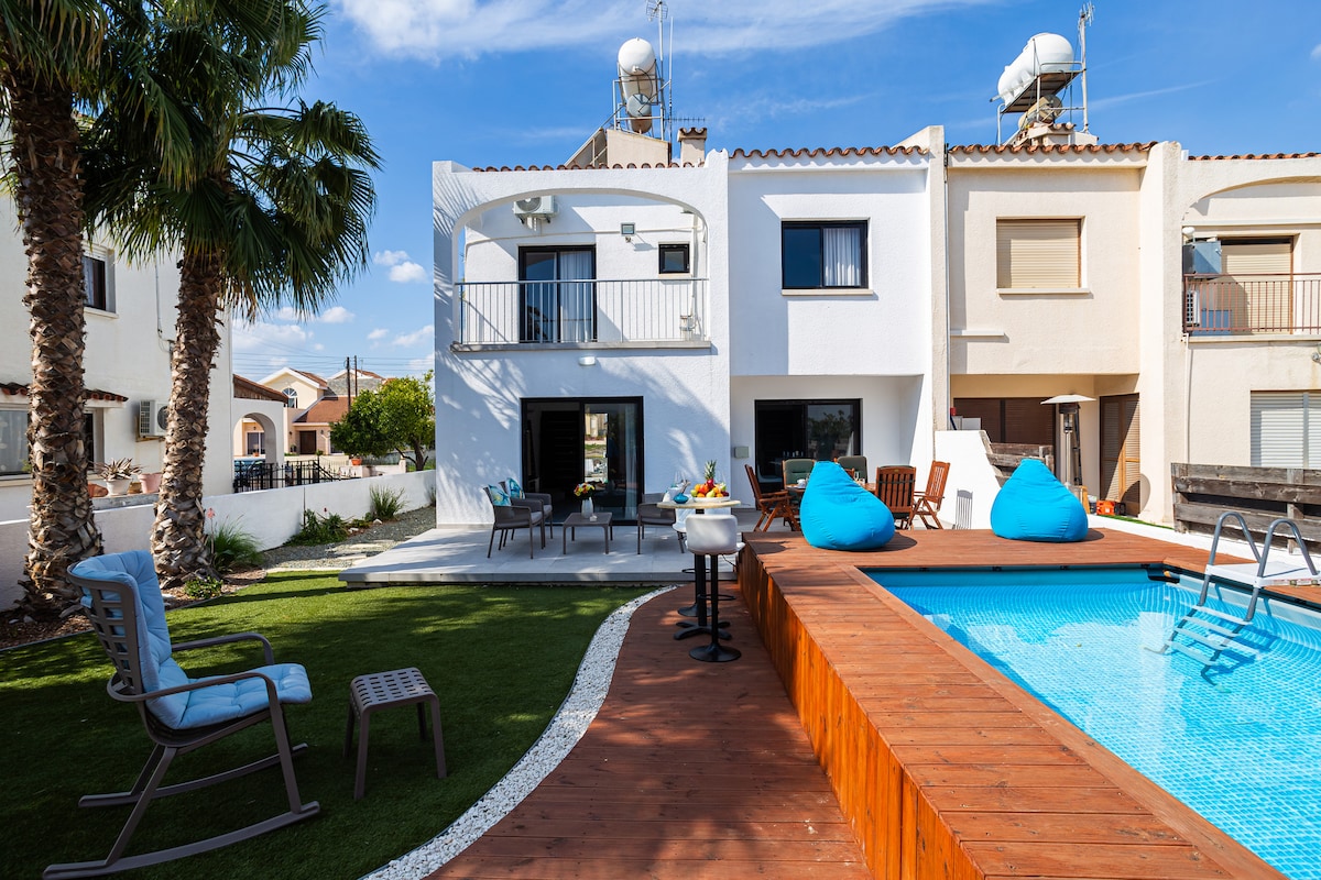 Two-level renovated villa of 150 m2 for rent in Livadia, Larnaca. This elegant residence includes three bedrooms (one of them with a private bathroom), two showers, a guest bathroom, a spacious living room with a fireplace, a kitchen equipped with an oven, stove, refrigerator, microwave, toaster, kettle and coffee machine, as well as balconies attached to each bedroom. The villa is furnished and equipped with all necessary household appliances: air conditioning in all rooms, washing machine, hairdryer, iron with ironing board, TV with Netflix and high-speed Wi-Fi. On the landscaped plot there is a private swimming pool with a wooden terrace, garden furniture, deck chairs and an outdoor dining area under the stars. The Larnaca Yacht Club and the coastal walking area are nearby.