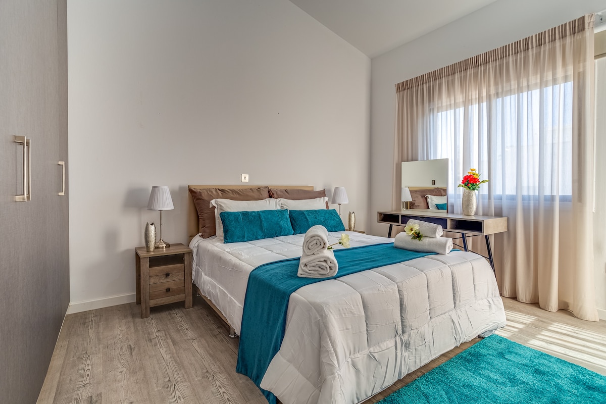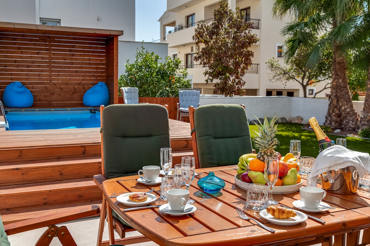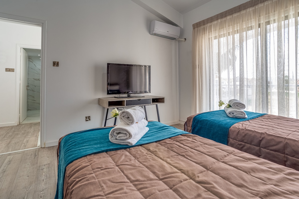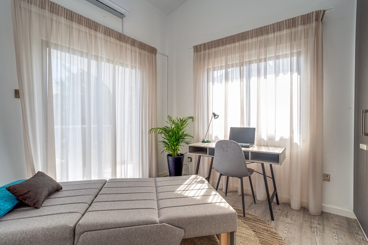 Two-level renovated villa of 150 m2 for rent in Livadia, Larnaca. This elegant residence includes three bedrooms (one of them with a private bathroom), two showers, a guest bathroom, a spacious living room with a fireplace, a kitchen equipped with an oven, stove, refrigerator, microwave, toaster, kettle and coffee machine, as well as balconies attached to each bedroom. The villa is furnished and equipped with all necessary household appliances: air conditioning in all rooms, washing machine, hairdryer, iron with ironing board, TV with Netflix and high-speed Wi-Fi. On the landscaped plot there is a private swimming pool with a wooden terrace, garden furniture, deck chairs and an outdoor dining area under the stars. The Larnaca Yacht Club and the coastal walking area are nearby.