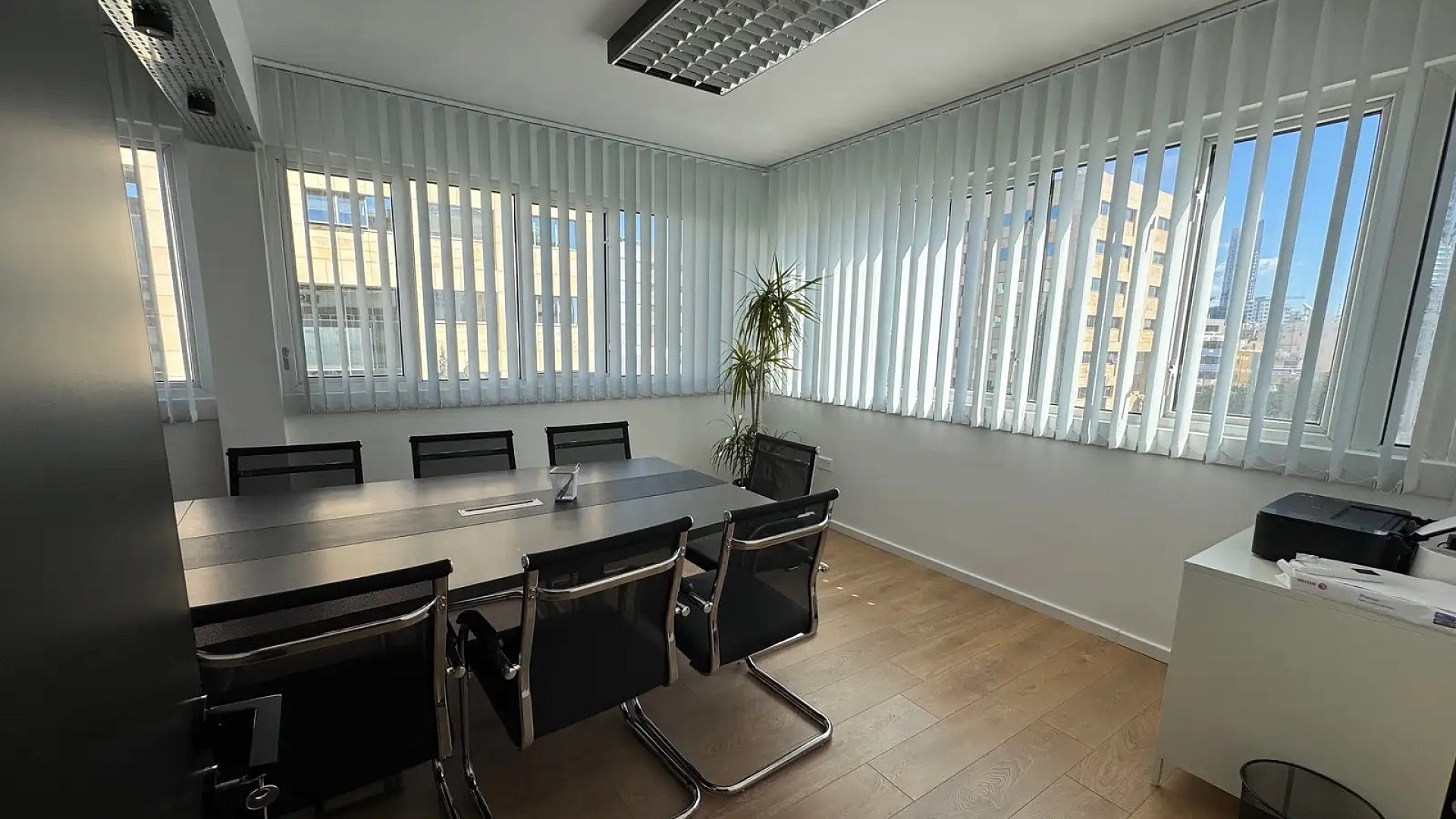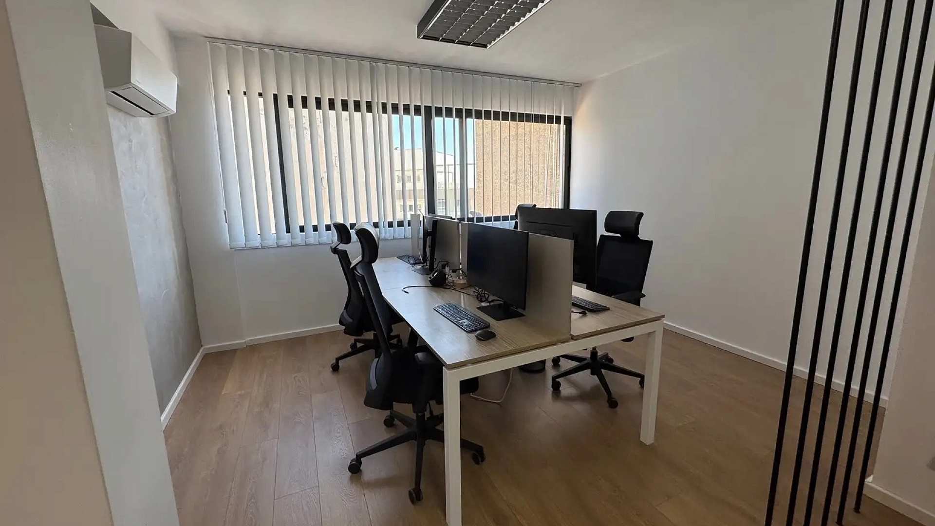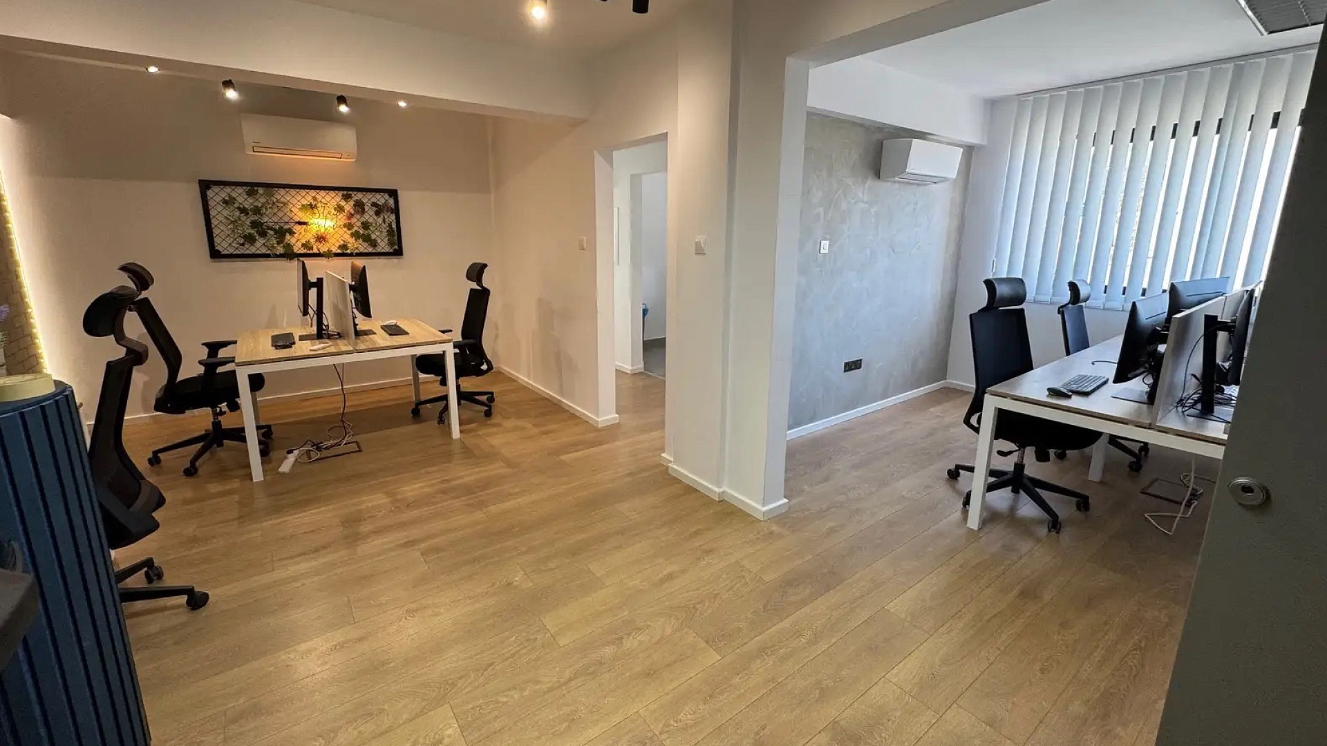 For rent two fully furnished offices with a total area of 120 m2 in Agia Zoni, Limassol. The offices are located in a modern building with an elevator, parking and an alarm system, and have a high energy efficiency class A. The first office (No. 301) with an area of 81 m2 can accommodate 8 employees and includes 8 spacious workstations with ergonomic chairs, 2 conference tables for 8-10 people, a separate kitchen and 1 bathroom. The second office (No. 302) with an area of 38 m2 accommodates 6 people, is equipped with 6 desks with chairs, a high table with stools, 3 cabinets, a kitchen and 1 bathroom. Both rooms are fully furnished and ready for use, decorated in a modern style with large windows and natural light, creating a comfortable working atmosphere. The offices are ideal for companies looking for a flexible professional space in the center of Limassol, close to urban infrastructure and major business areas.