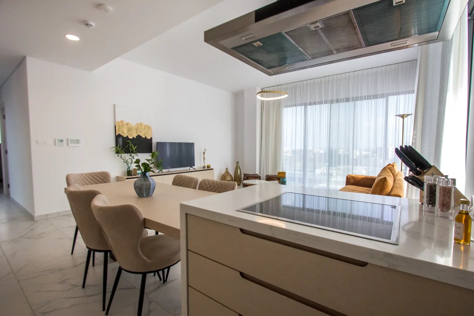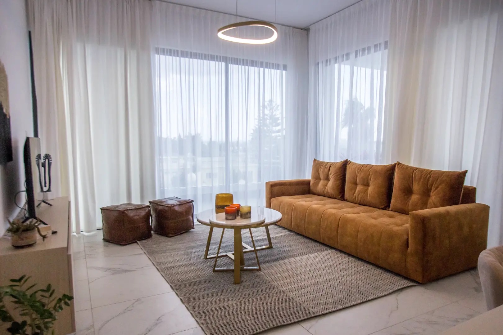Two-bedroom apartment of 110 m2 for rent in the area of Kato Paphos, Paphos city. The apartment includes two bedrooms, two bathrooms, a spacious living room, an open-plan kitchen and a private balcony. The property is fully furnished and equipped with modern appliances: Marshall speaker system, Nespresso coffee machine, Smart TV, air conditioners, heating, dishwasher, microwave, oven, refrigerator, hob with extractor hood, washing machine, vacuum cleaner, iron, kettle, hairdryer, as well as bed linen and towels. A security system and Wi-Fi are installed. Residents of the complex have access to an elevator, a communal swimming pool, parking, and a 24-hour entrance to the building. The apartments are located in the very center of Paphos — nearby there are cafes, shops, attractions and business centers, which makes the accommodation convenient for both leisure and long-term living. Additionally, a concierge service and professional cleaning are provided upon request. Pets are allowed.