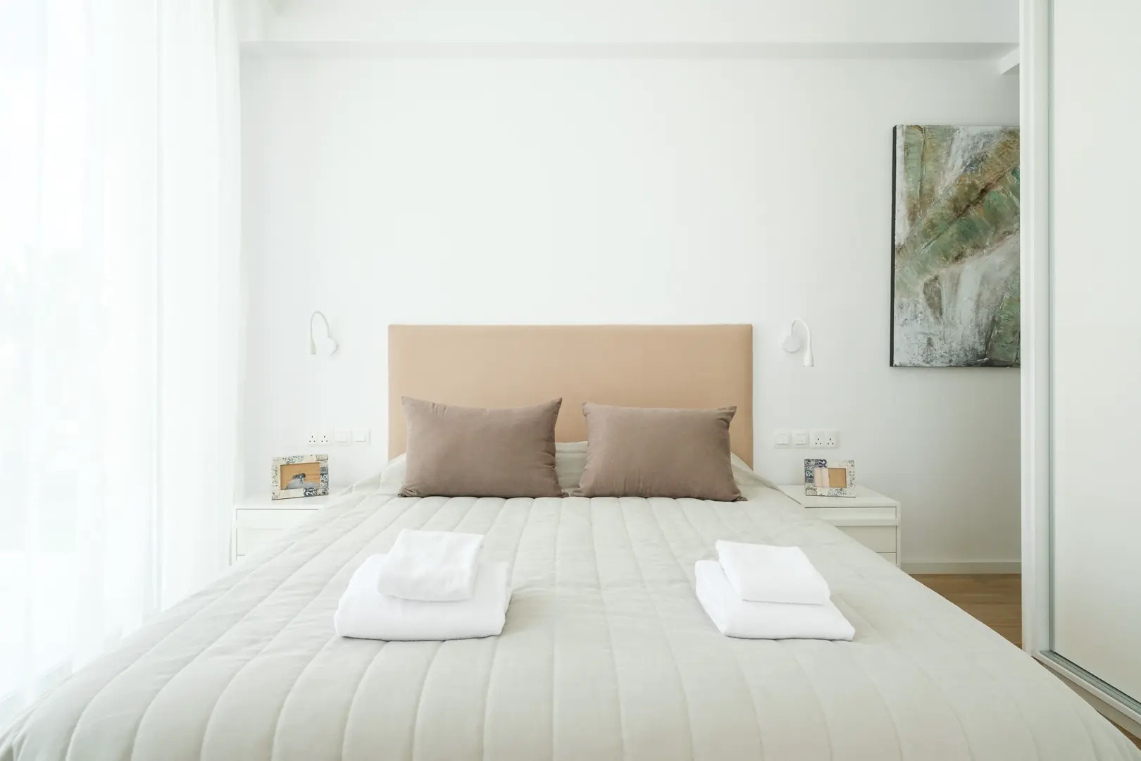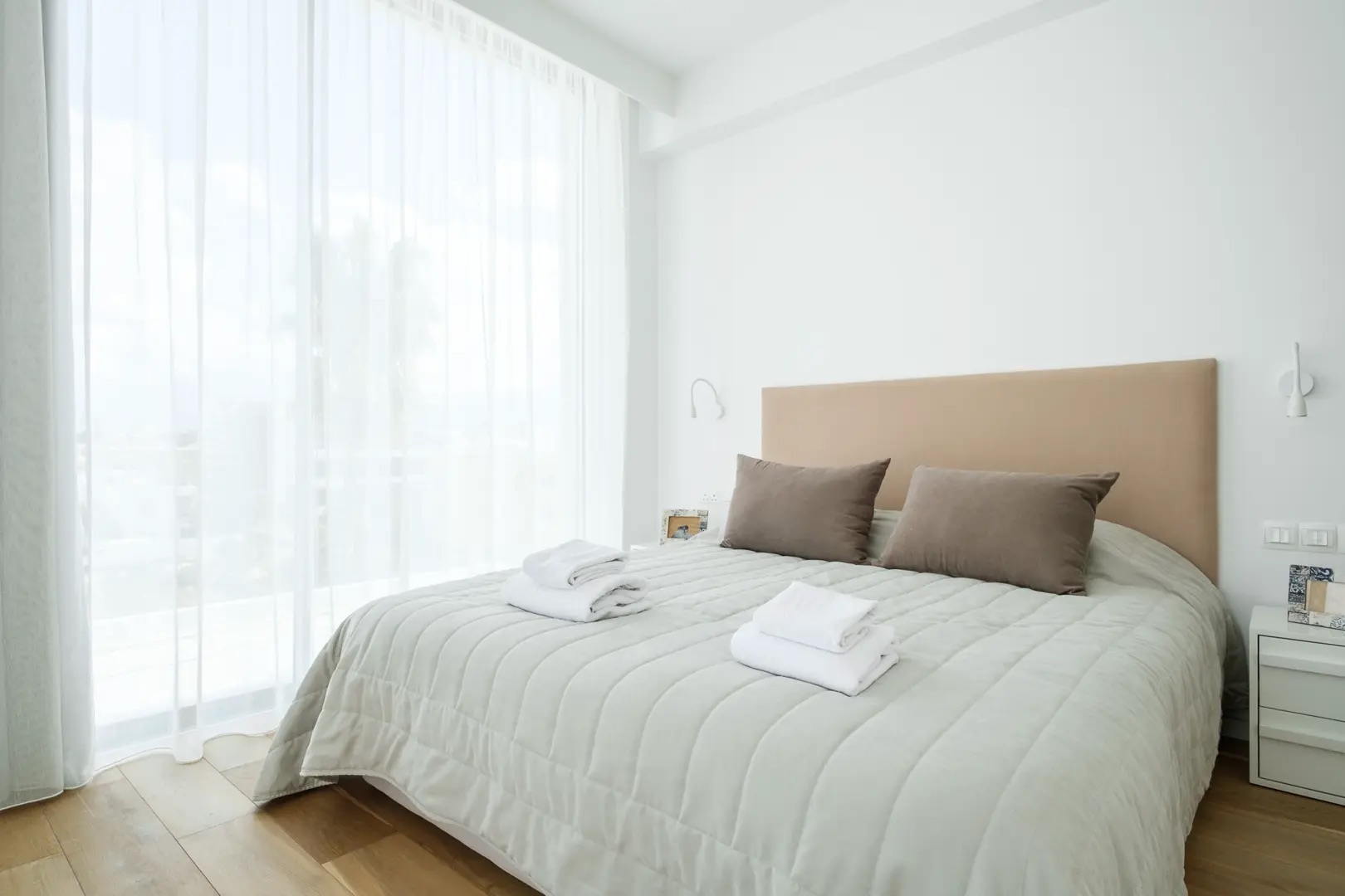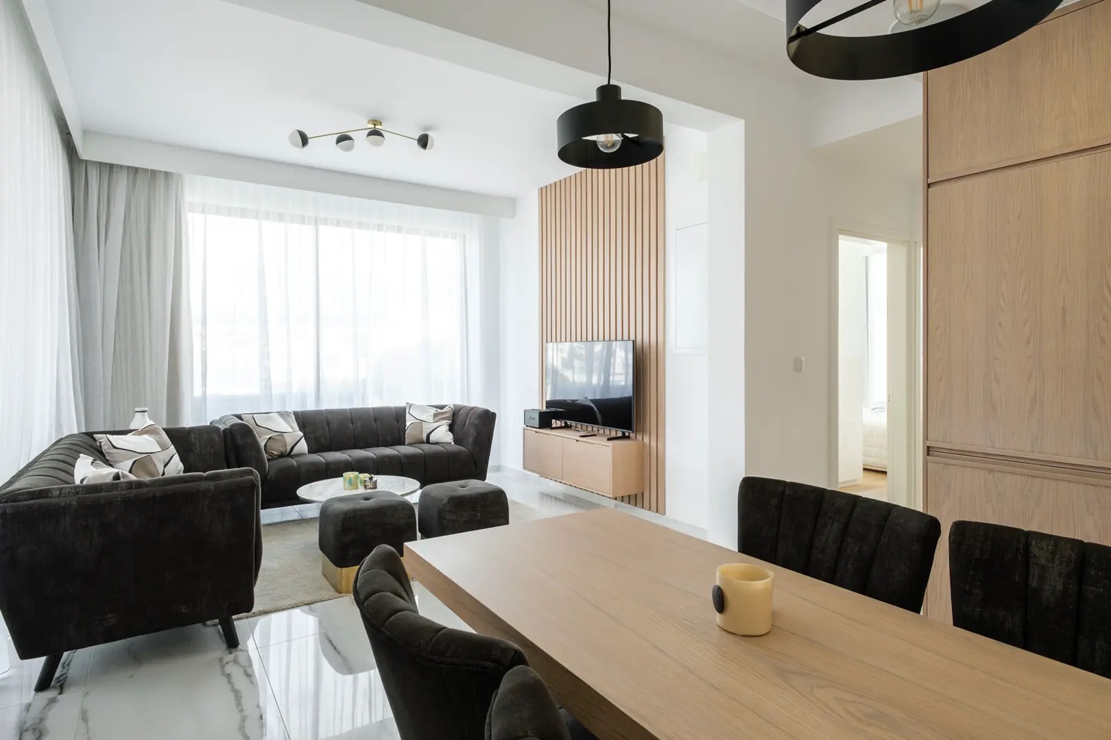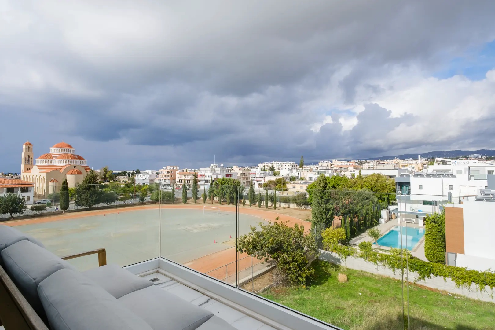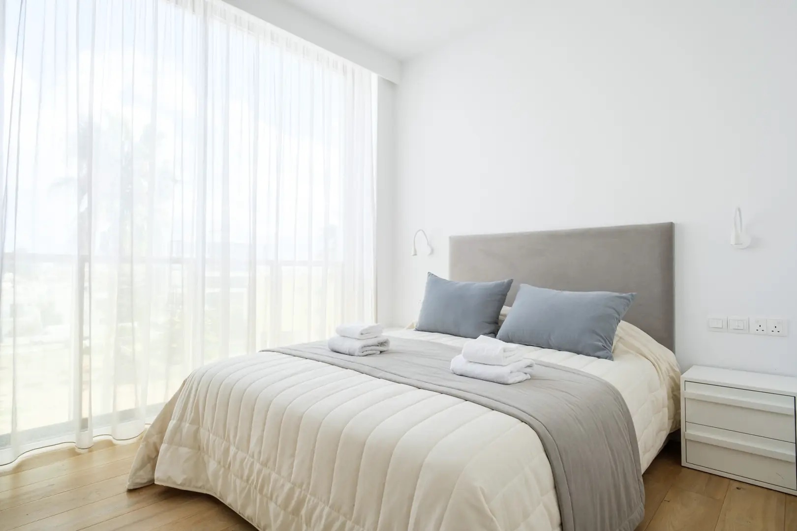 Two-bedroom apartment of 79 m2 for rent in the area of Kato Paphos, Paphos city. The apartments include two bedrooms, two bathrooms, a kitchen, a spacious living room and a private balcony with views of the city and the sea. There is also a separate utility room and a private parking space. The apartment is fully furnished and equipped with modern appliances: Smart TV, Marshall speaker, Nespresso coffee machine, dishwasher, refrigerator, oven, microwave, hob, extractor hood, electric kettle, hairdryer, washing machine and dryer, iron, vacuum cleaner, air conditioners, heating system, as well as personal hygiene products and bed linen underwear. High-speed Wi-Fi is connected and an alarm system is installed. The residential complex is equipped with an elevator, a communal swimming pool and parking, 24-hour access and a security system.