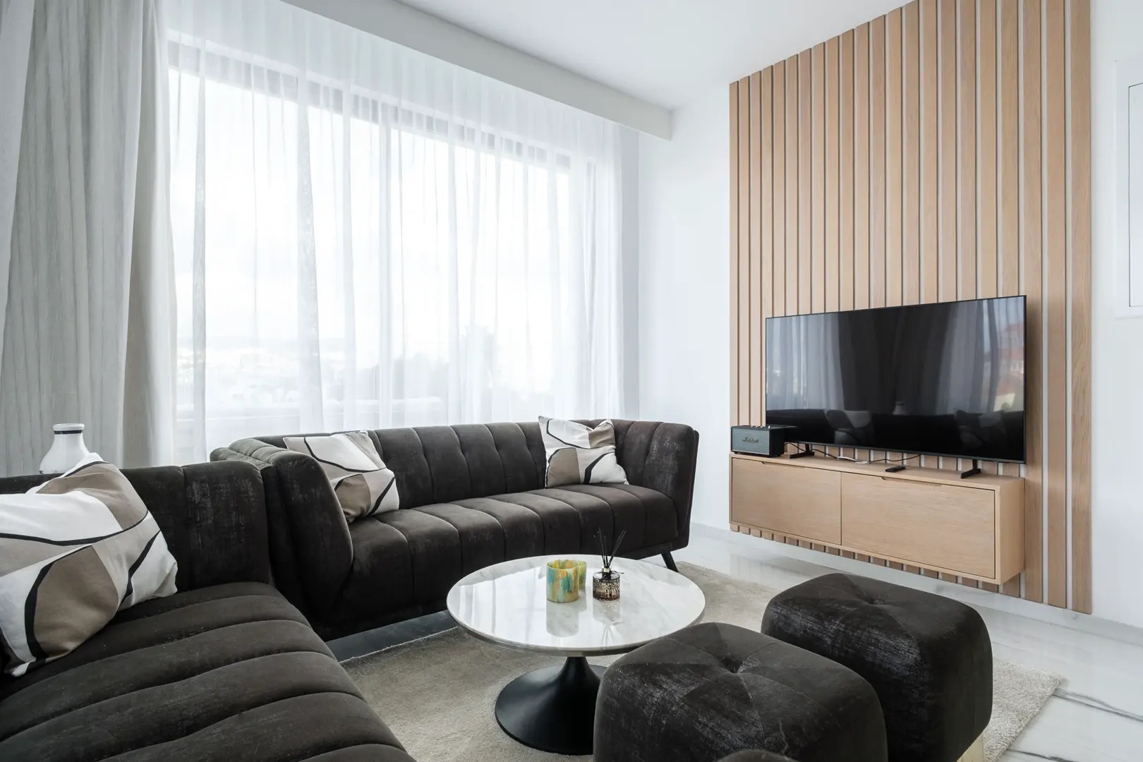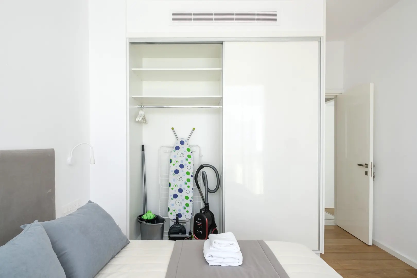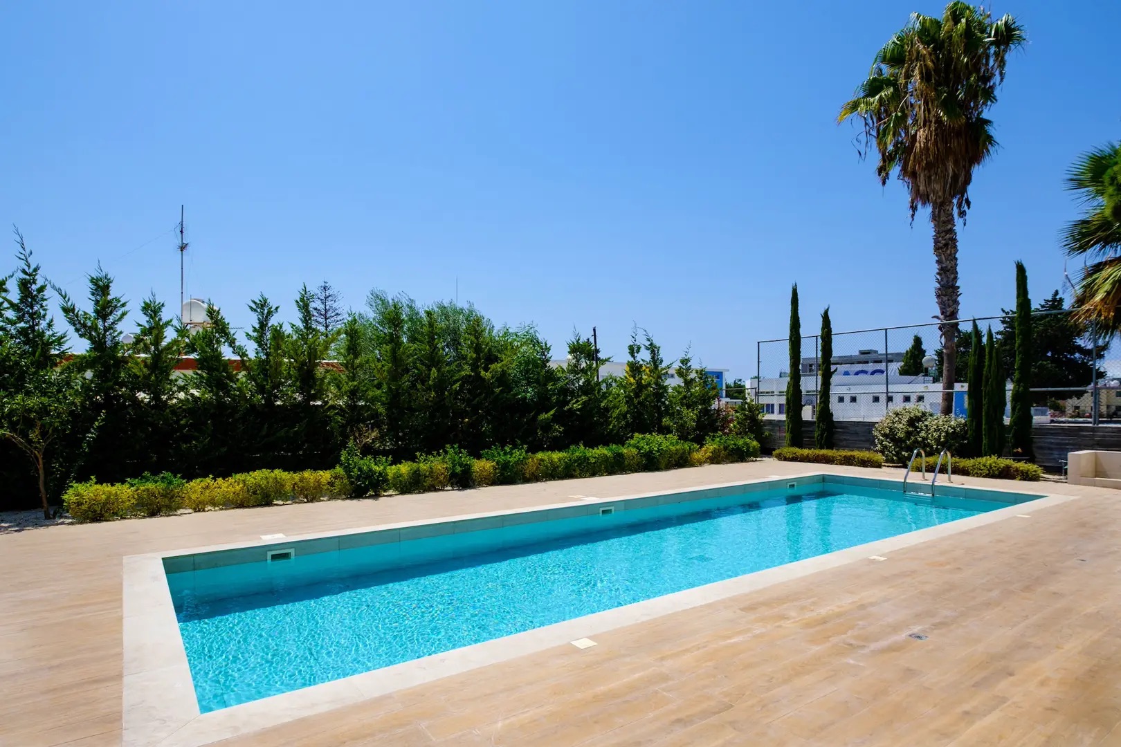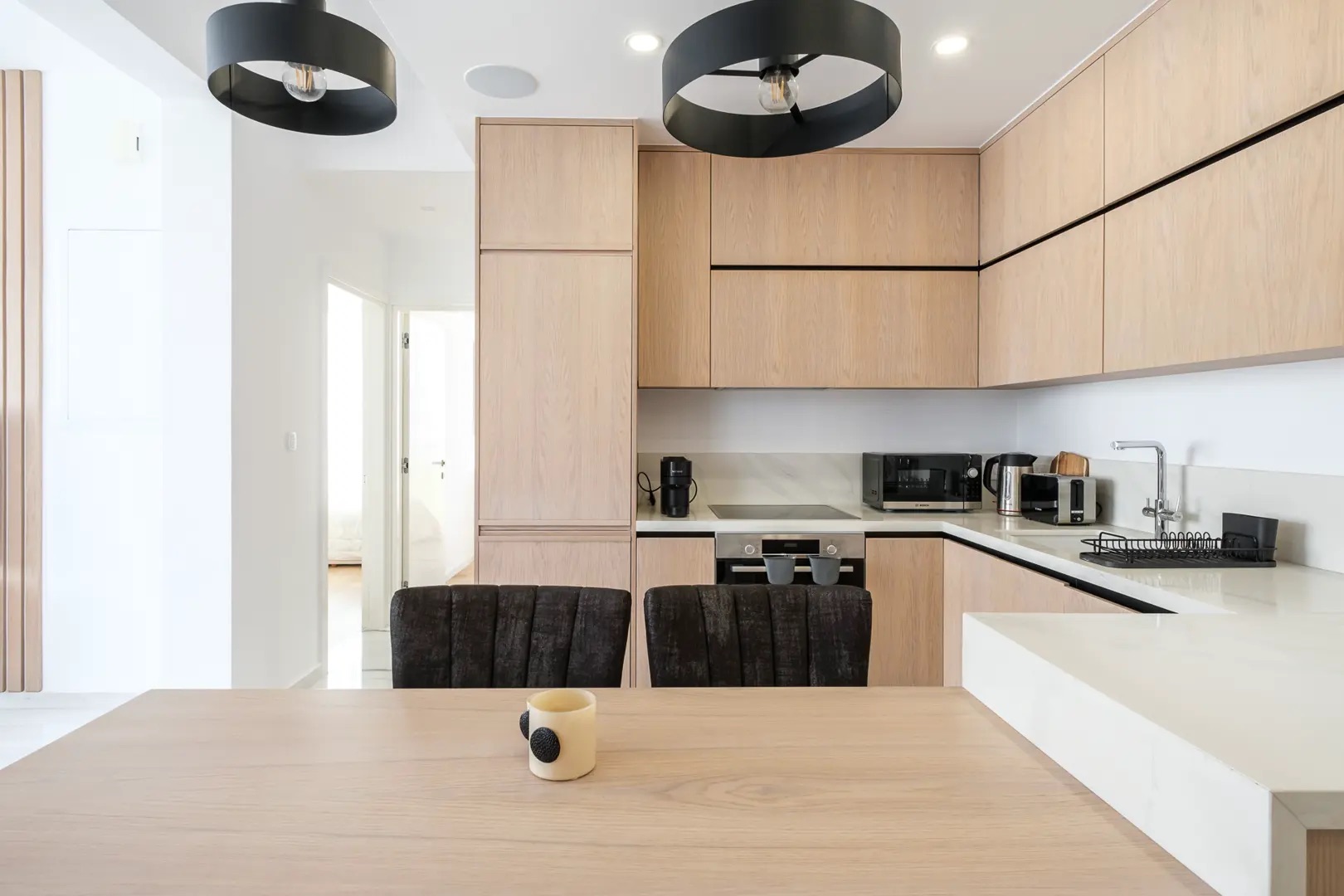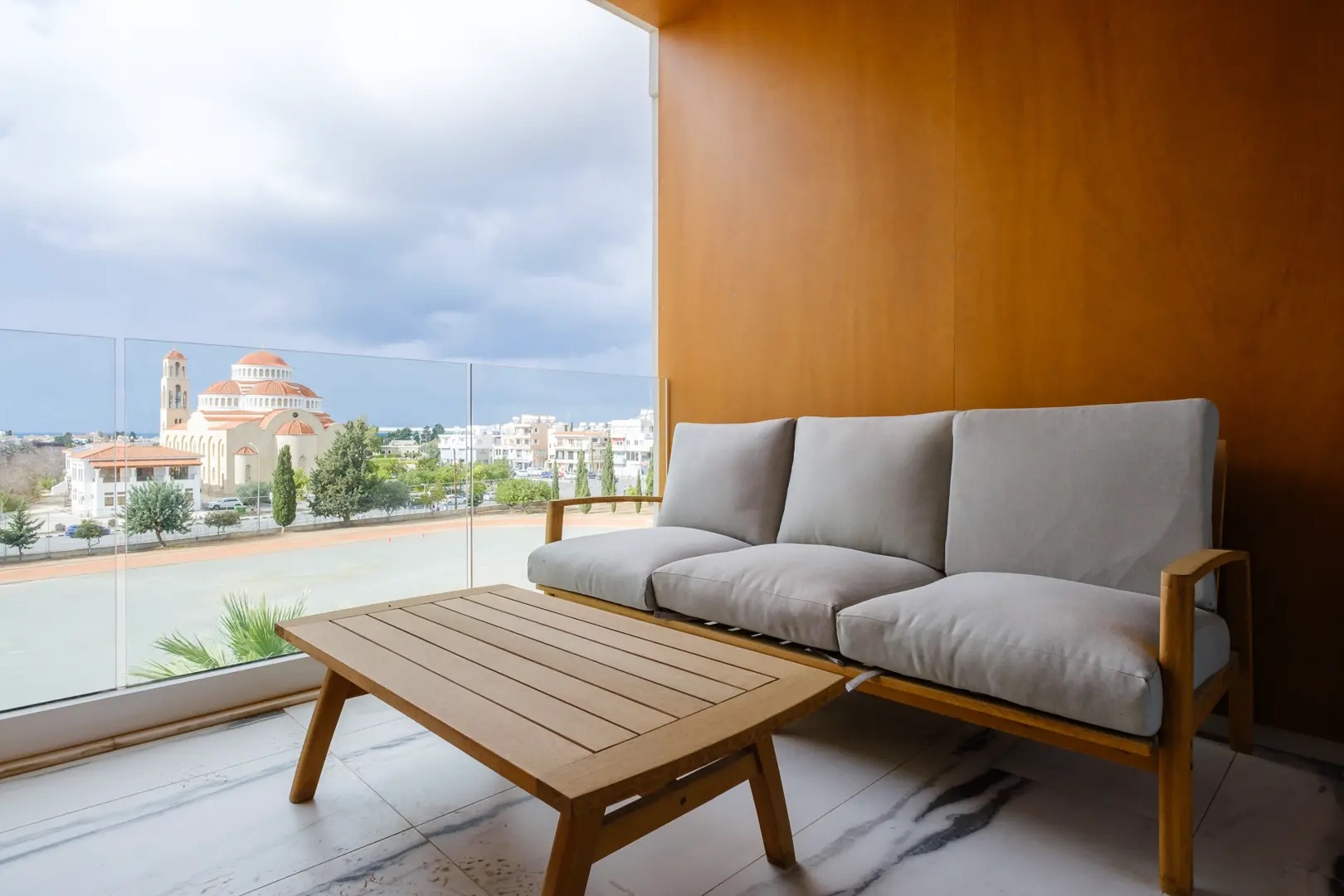 Two-bedroom apartment of 79 m2 for rent in the area of Kato Paphos, Paphos city. The apartments include two bedrooms, two bathrooms, a kitchen, a spacious living room and a private balcony with views of the city and the sea. There is also a separate utility room and a private parking space. The apartment is fully furnished and equipped with modern appliances: Smart TV, Marshall speaker, Nespresso coffee machine, dishwasher, refrigerator, oven, microwave, hob, extractor hood, electric kettle, hairdryer, washing machine and dryer, iron, vacuum cleaner, air conditioners, heating system, as well as personal hygiene products and bed linen underwear. High-speed Wi-Fi is connected and an alarm system is installed. The residential complex is equipped with an elevator, a communal swimming pool and parking, 24-hour access and a security system.