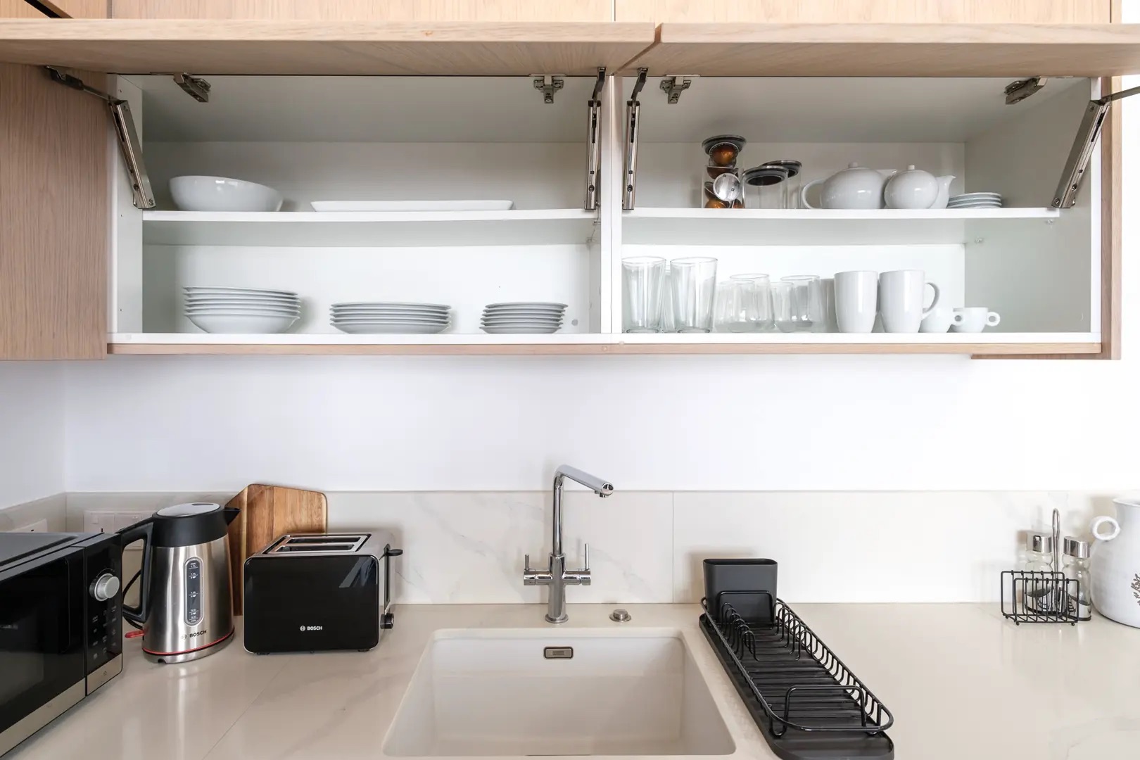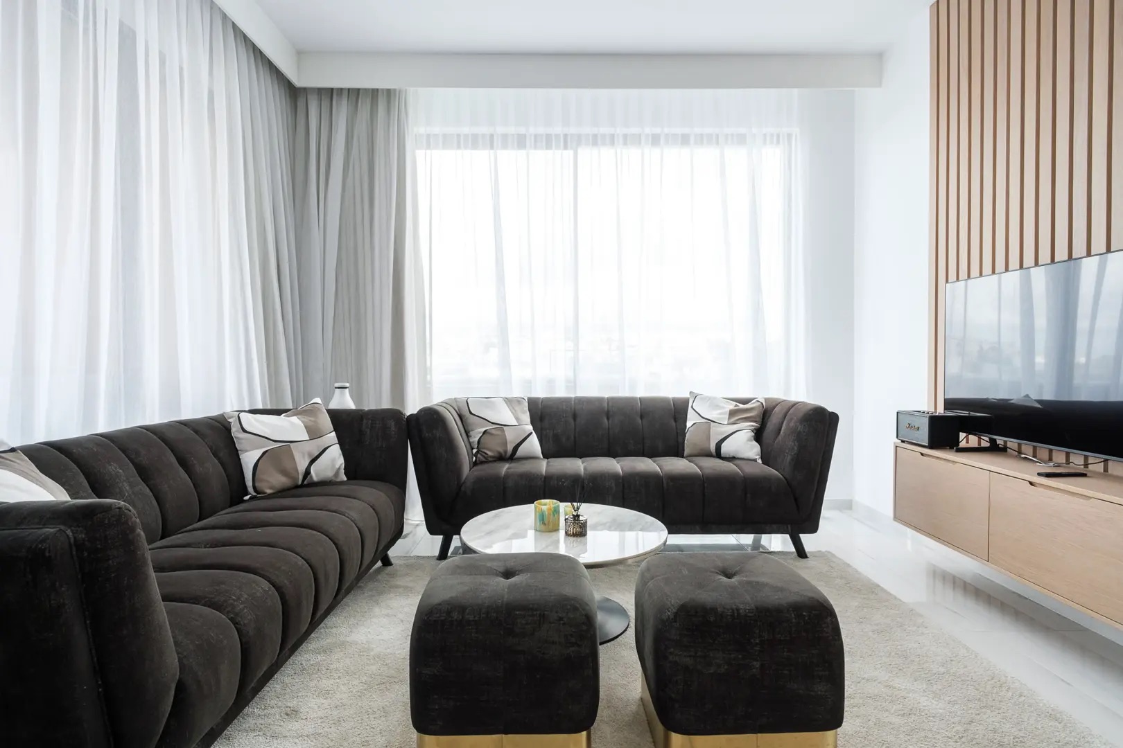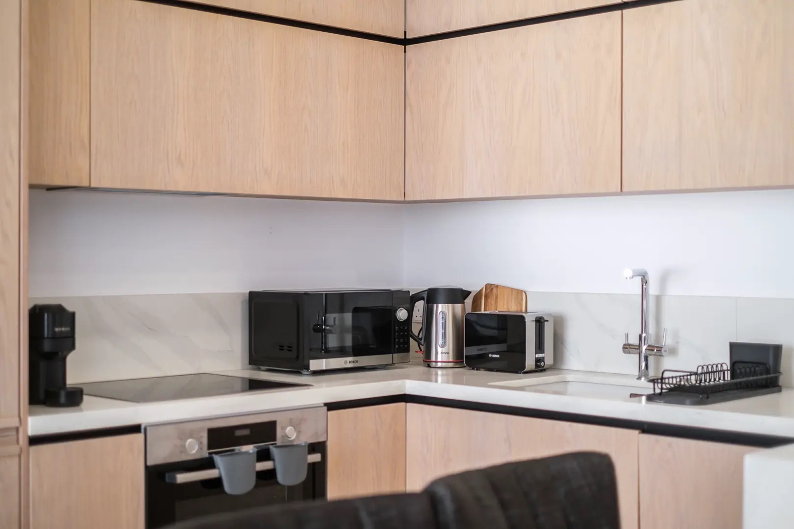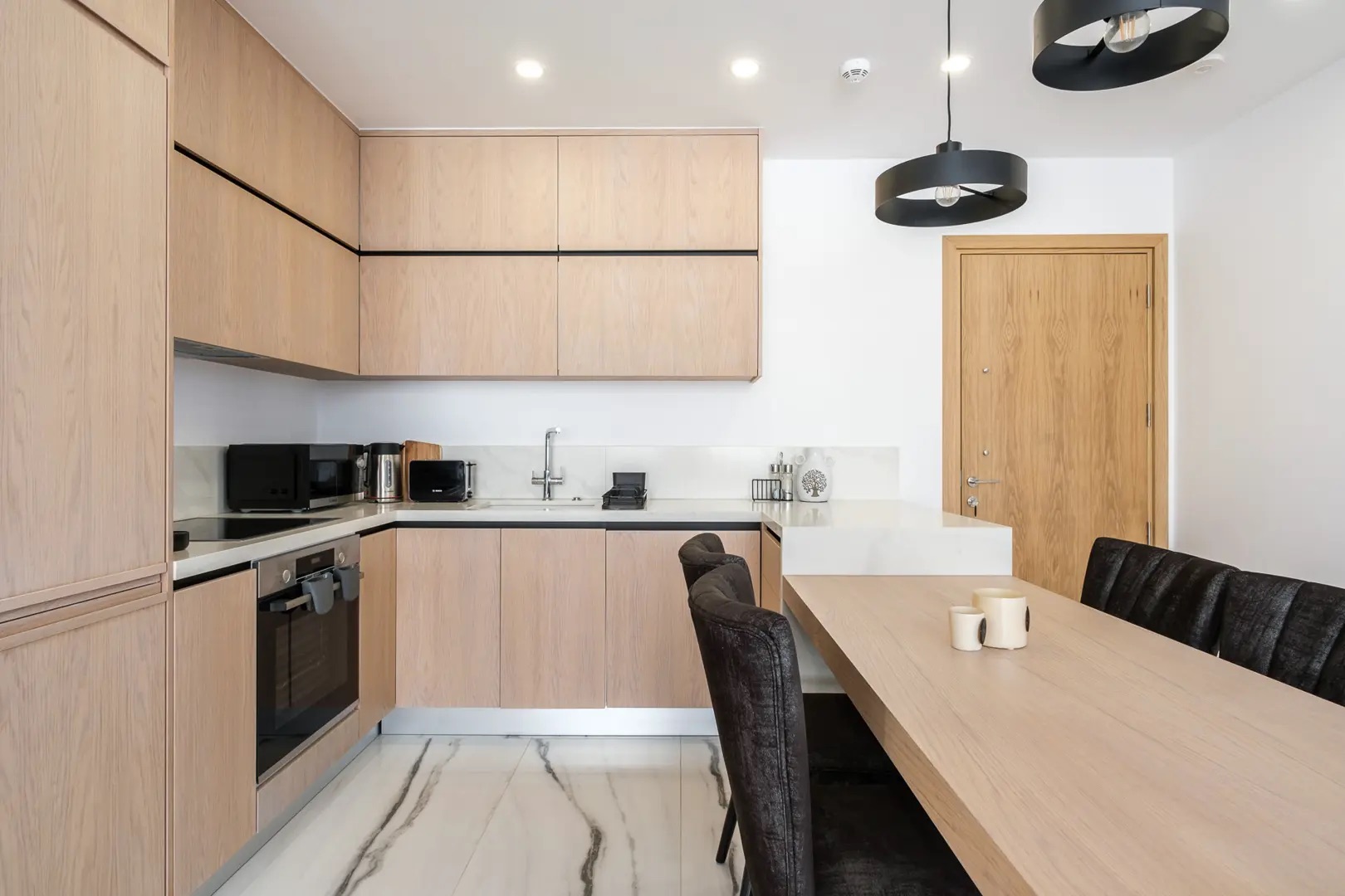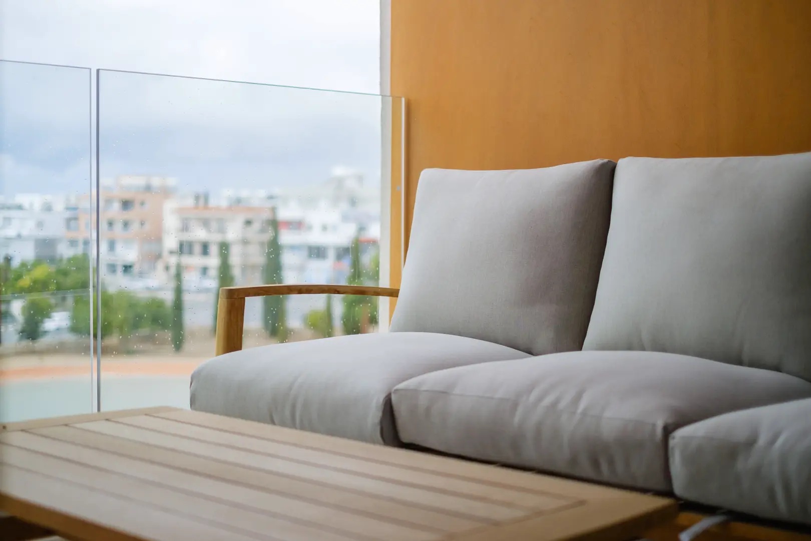 Two-bedroom apartment of 79 m2 for rent in the area of Kato Paphos, Paphos city. The apartments include two bedrooms, two bathrooms, a kitchen, a spacious living room and a private balcony with views of the city and the sea. There is also a separate utility room and a private parking space. The apartment is fully furnished and equipped with modern appliances: Smart TV, Marshall speaker, Nespresso coffee machine, dishwasher, refrigerator, oven, microwave, hob, extractor hood, electric kettle, hairdryer, washing machine and dryer, iron, vacuum cleaner, air conditioners, heating system, as well as personal hygiene products and bed linen underwear. High-speed Wi-Fi is connected and an alarm system is installed. The residential complex is equipped with an elevator, a communal swimming pool and parking, 24-hour access and a security system.
