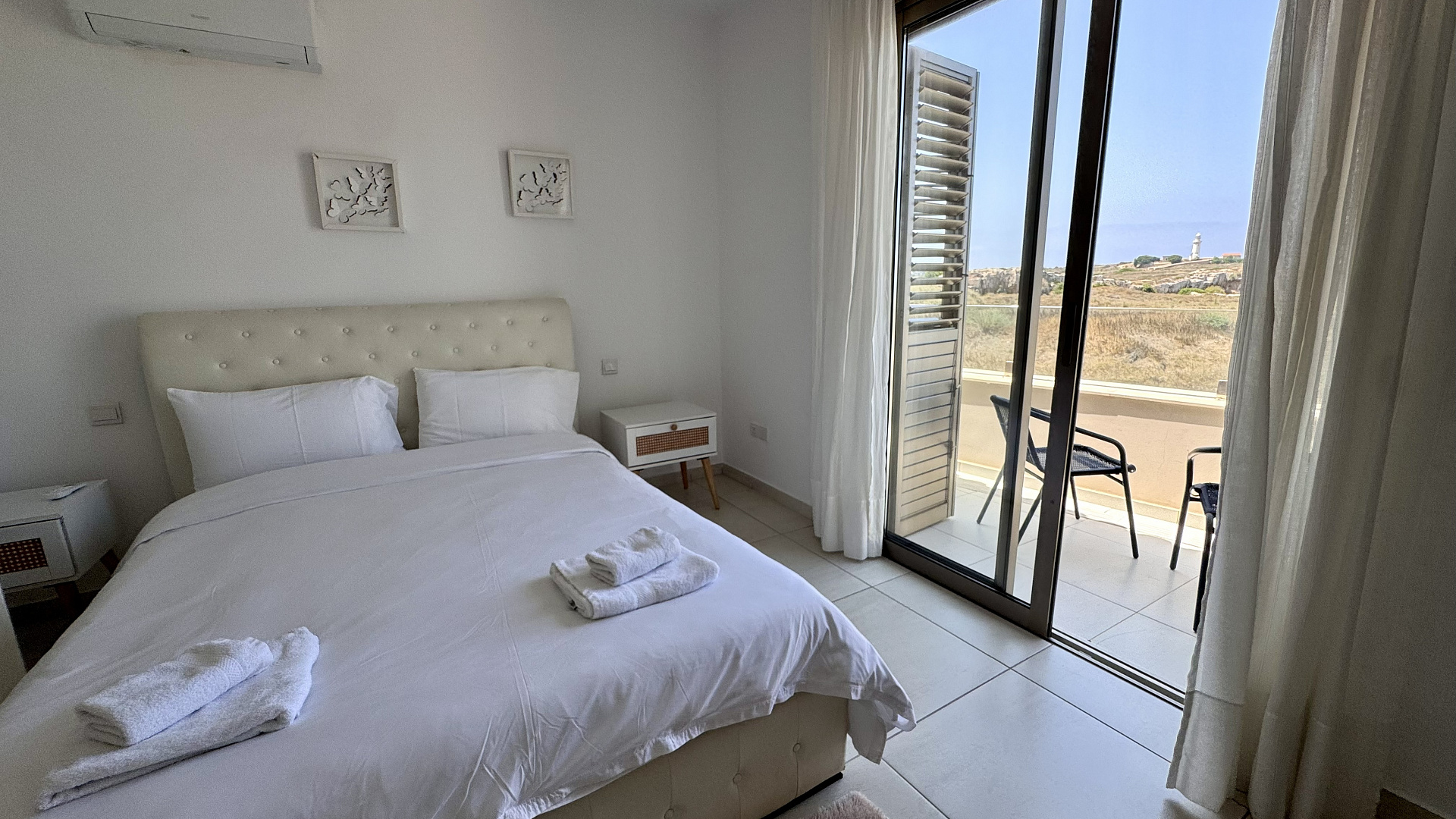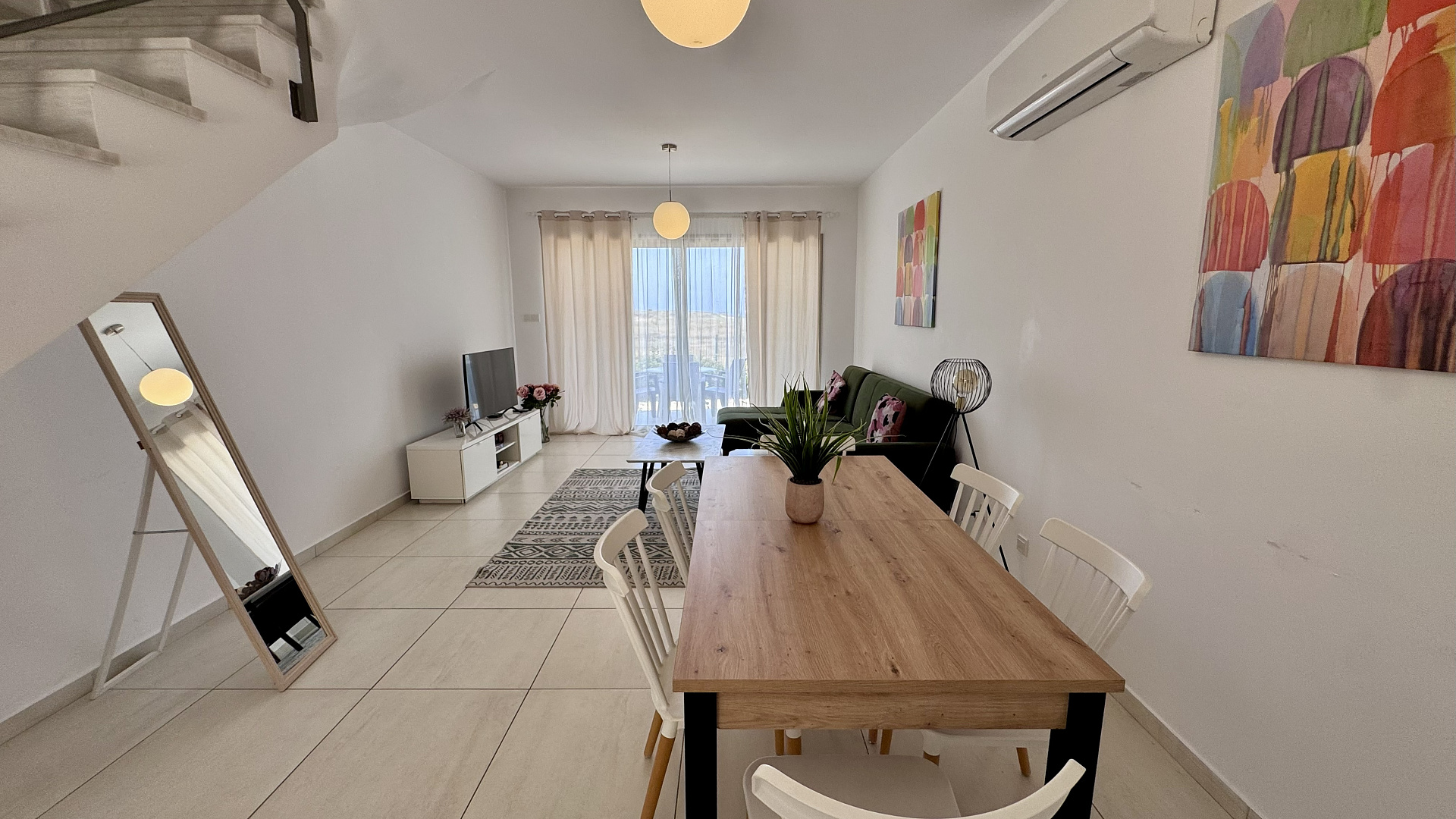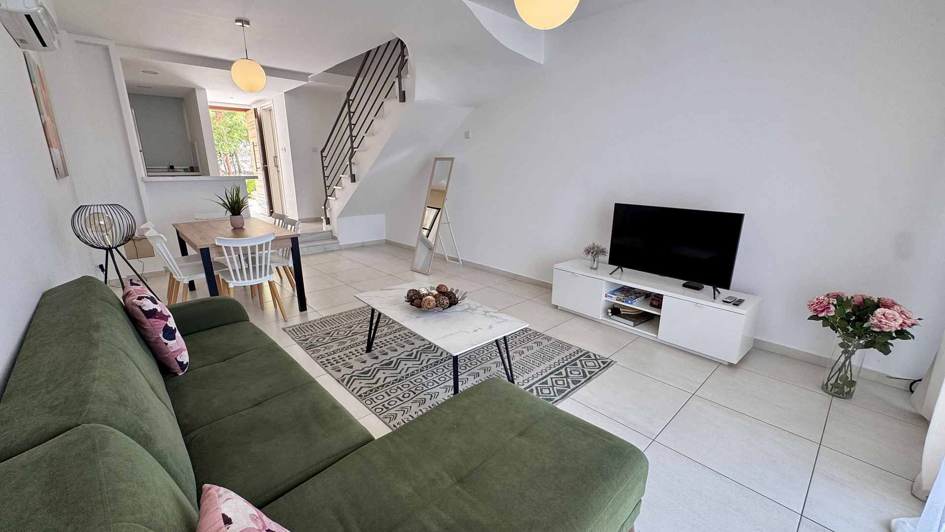 Two-bedroom townhouse for rent in a residential complex. The total area is 111m2. The house has two bathrooms: one in the bedroom with a bathtub, one with a shower, and a guest toilet on the ground floor. The townhouse is fully furnished, has Parking, access to the gym and swimming pool, the complex is closed. The windows overlook the sea and the lighthouse.