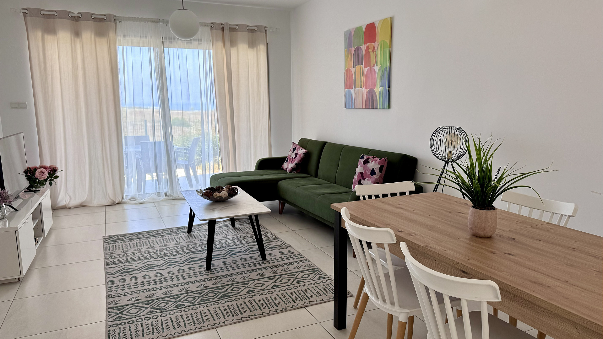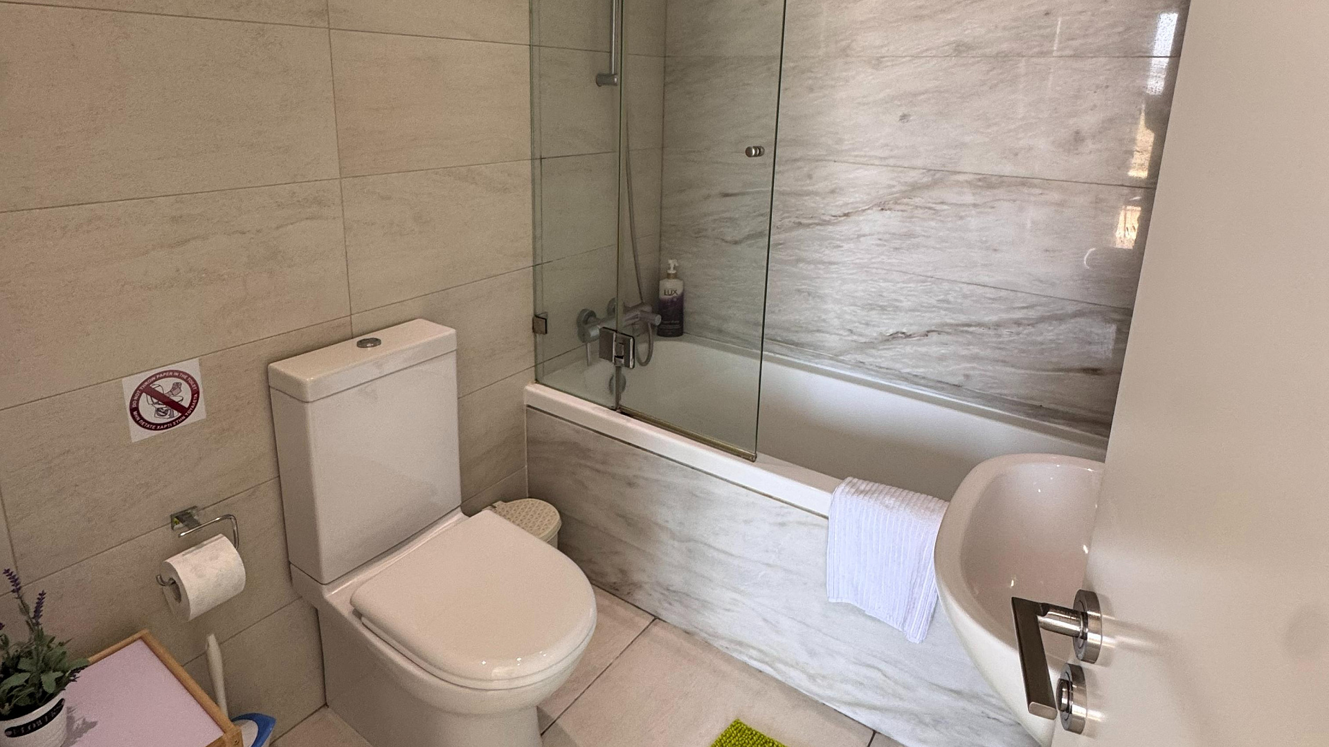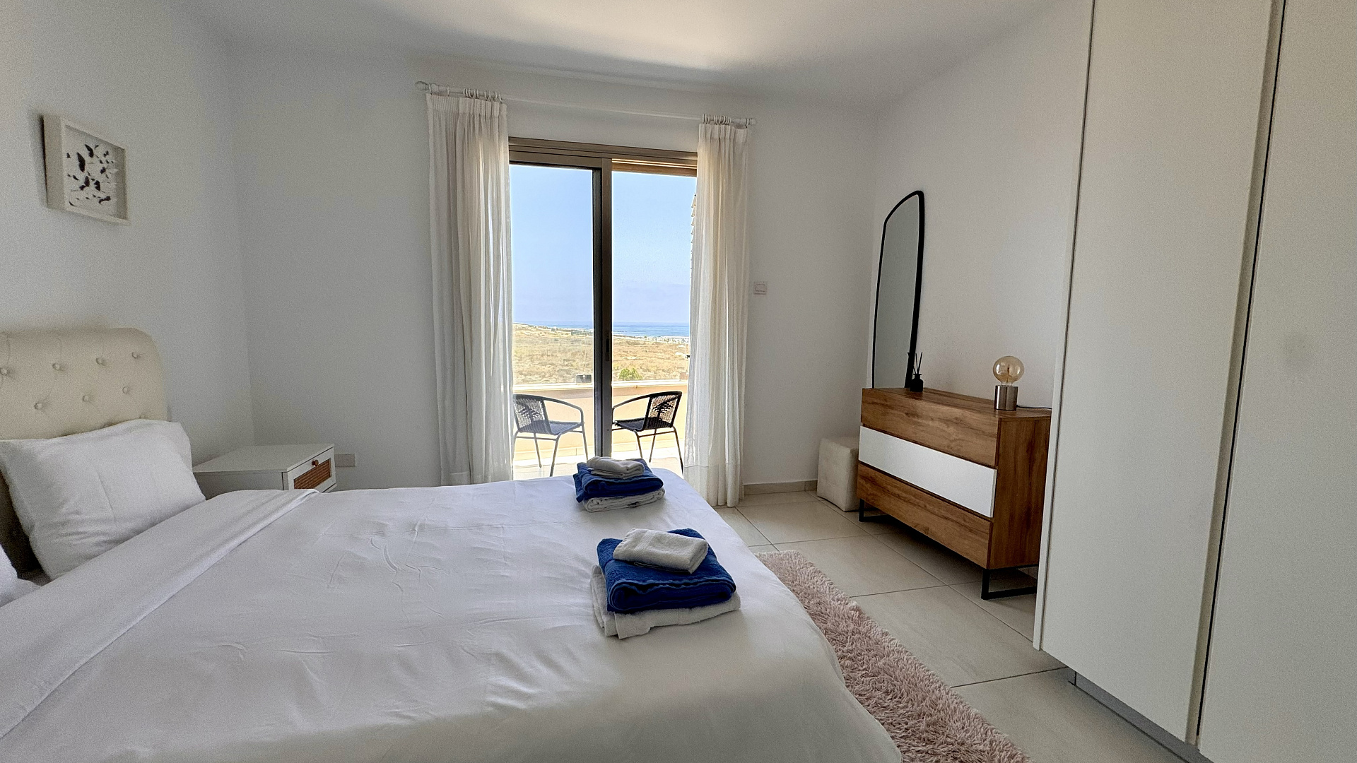 Two-bedroom townhouse for rent in a residential complex. The total area is 111m2. The house has two bathrooms: one in the bedroom with a bathtub, one with a shower, and a guest toilet on the ground floor. The townhouse is fully furnished, has Parking, access to the gym and swimming pool, the complex is closed. The windows overlook the sea and the lighthouse.