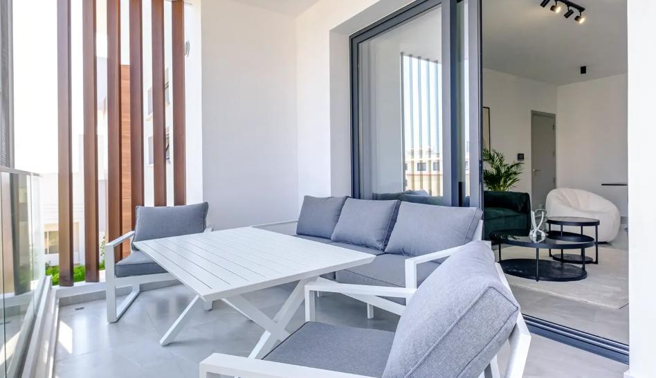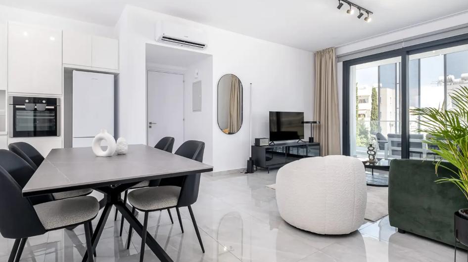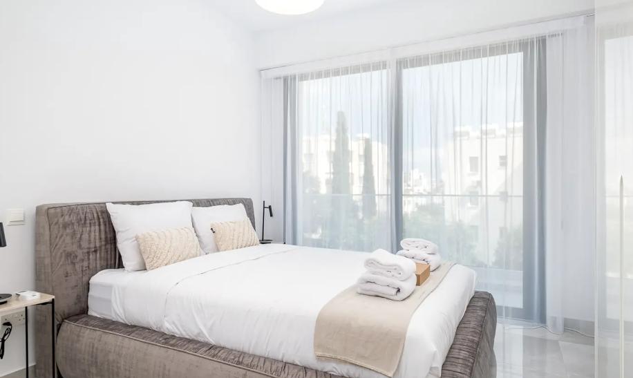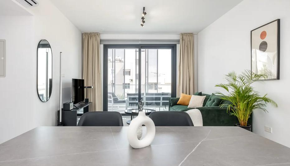 Two-bedroom apartment of 75 m2 for rent in the area of Town Center Paphos, Paphos city. The apartment includes two bedrooms, one bathroom, a kitchen, a spacious living room and a private balcony. The property is fully furnished and equipped with modern appliances: Marshall speaker system, Smart TV, dishwasher, oven, hob, extractor hood, microwave, refrigerator, Nespresso coffee machine, kettle, iron, hairdryer, vacuum cleaner and washing machine. The apartments also have air conditioning, Wi-Fi internet and a safe entrance door. The complex is equipped with an elevator, communal pool, solarium and covered parking; access 24/7.