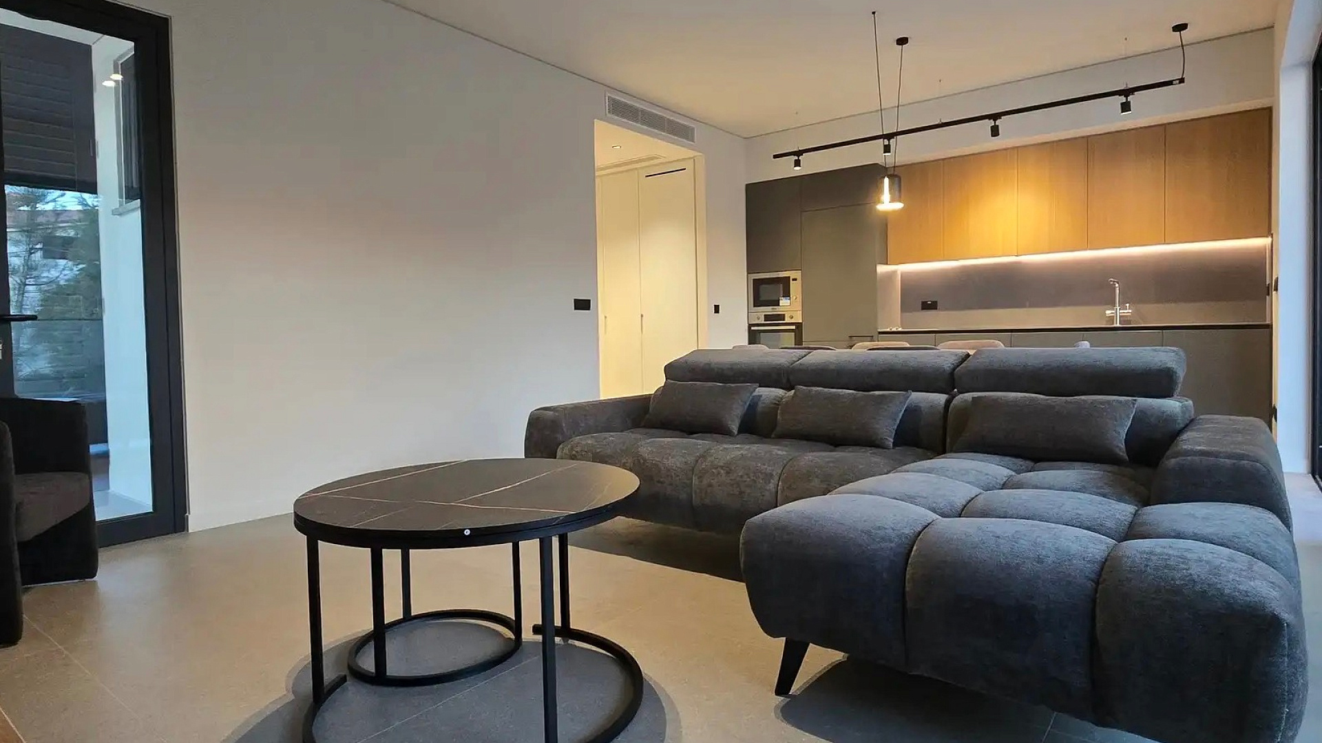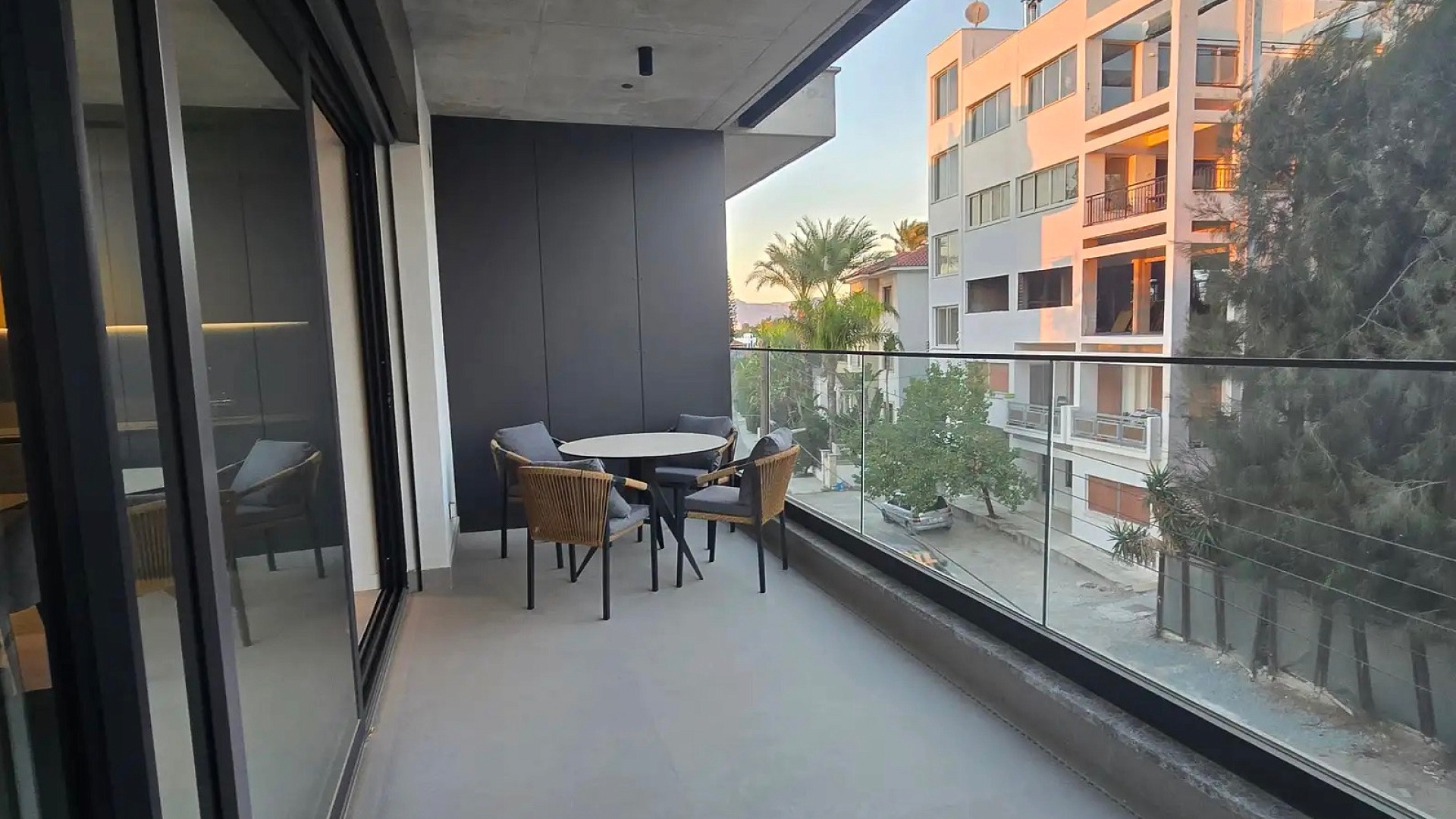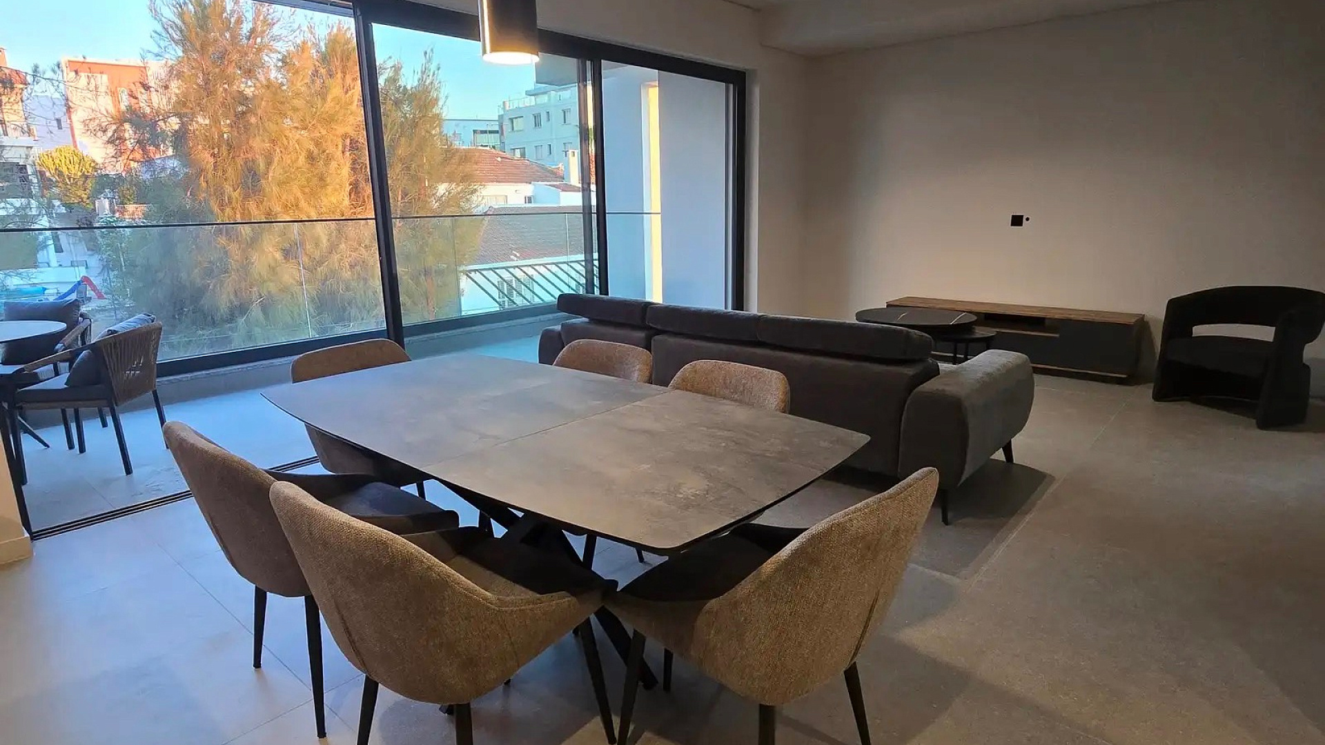 Two-bedroom apartment of 87 m2 for rent in Strovolos – Chryseleousa, Nicosia. The apartment is located on the second floor of a modern building built in 2025 and includes a living room combined with a kitchen and dining area, two bedrooms, two bathrooms, as well as a spacious front balcony of 17 m2 and a side balcony of 3 m2. The apartment is fully furnished and equipped with new appliances: refrigerator with freezer, induction hob, oven, microwave, dishwasher and washer dryer. Air conditioning is installed in all rooms, underfloor heating, double glazing and electric shutters. The complex has an elevator, access control system, covered parking with electronic key access and a spacious storage room. The property is located in a convenient location with quick access to the main roads Athalassas and Strovolou, just a 10-minute drive from the center of Nicosia and the highway to Larnaca/Limassol. Bakeries, pharmacies, cafes, restaurants, gyms, El Greco Medical Center, Makario Hospital, The English School and The Junior School, Pernera Elementary School, Agios Dimitrios and Pedieos Linear Park parks are within walking distance.