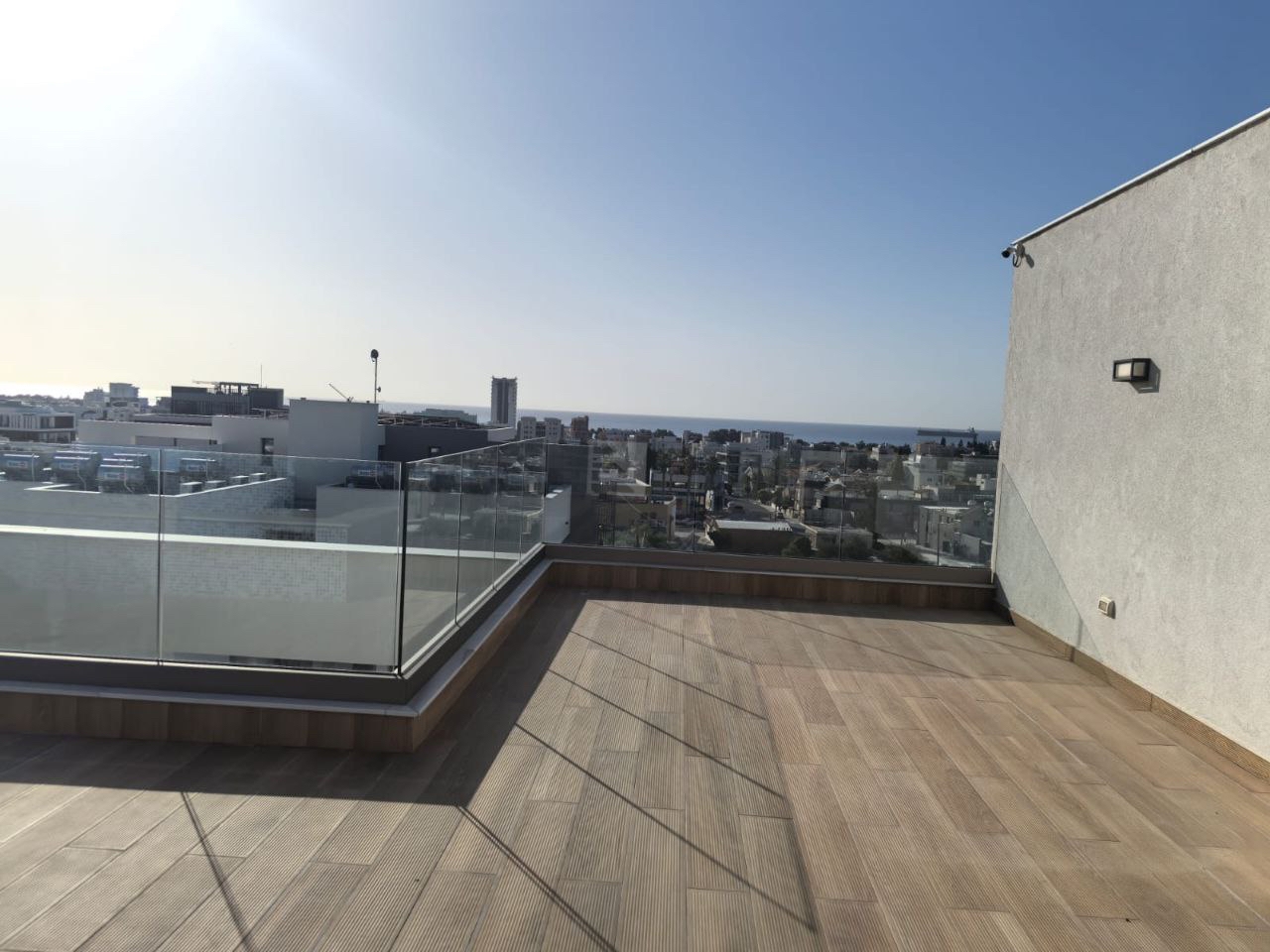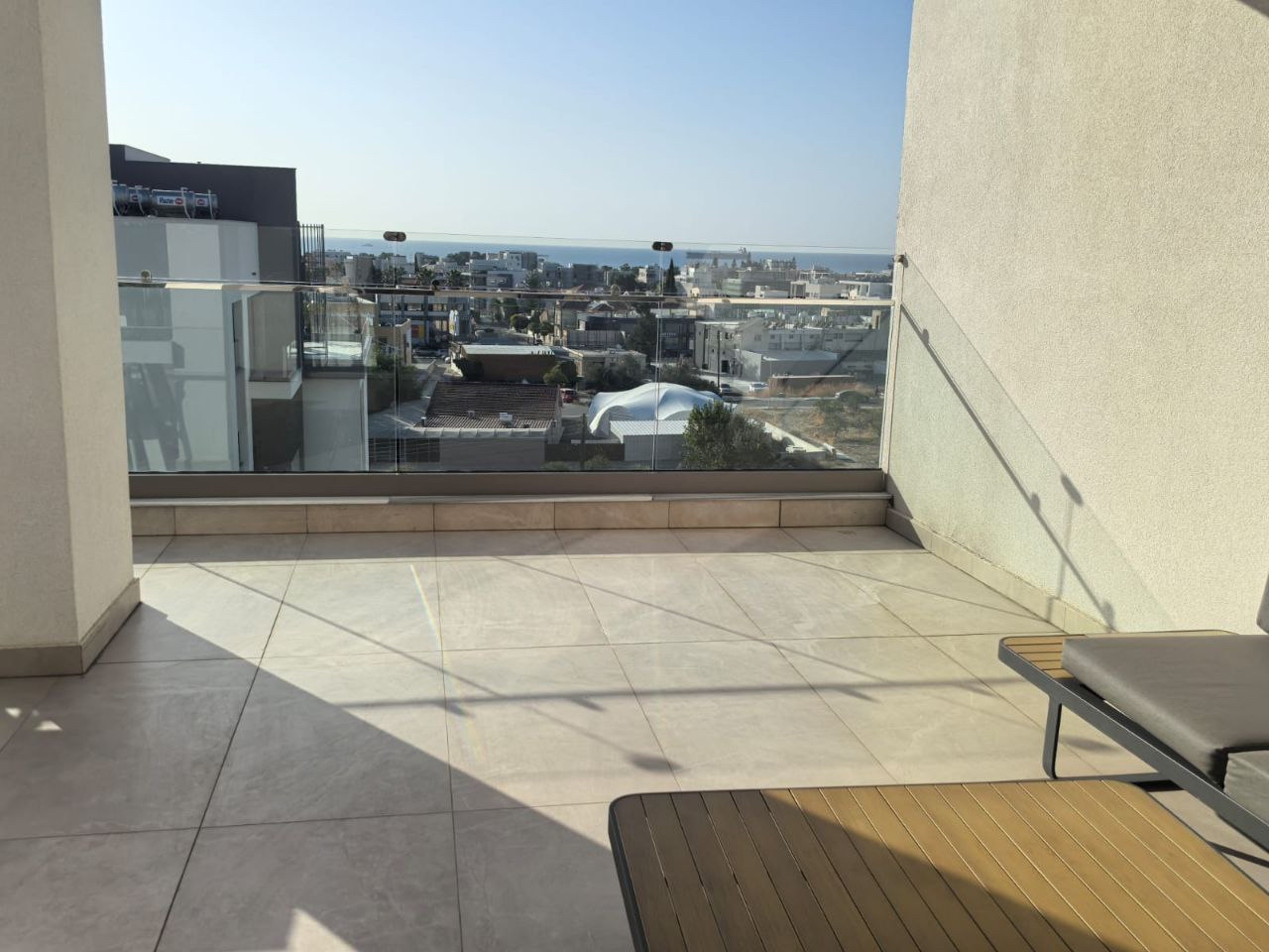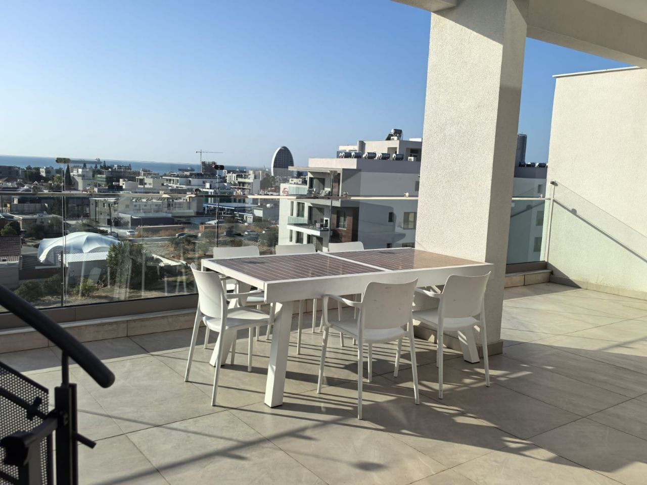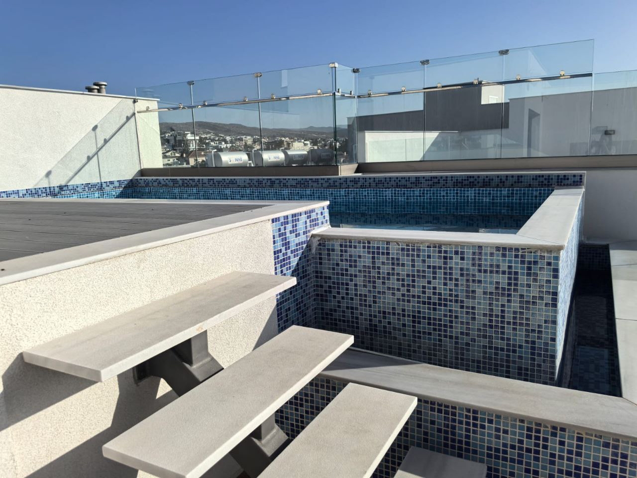 Three-bedroom penthouse of 143 m2 for rent in Germasogeia Columbia, Limassol. The penthouse includes three bedrooms and an additional room, one bathroom, a kitchen, a living room, a covered veranda of 31 m2, a storage room of 34 m2, two covered parking spaces, and an outdoor roof terrace of 124 m2. The total covered area is 231 m2, the total area is 23 m2. The property is equipped with underfloor heating, VRV air conditioning, a private rooftop pool and a gym. The penthouse is located just a 3-minute walk from all necessary amenities.