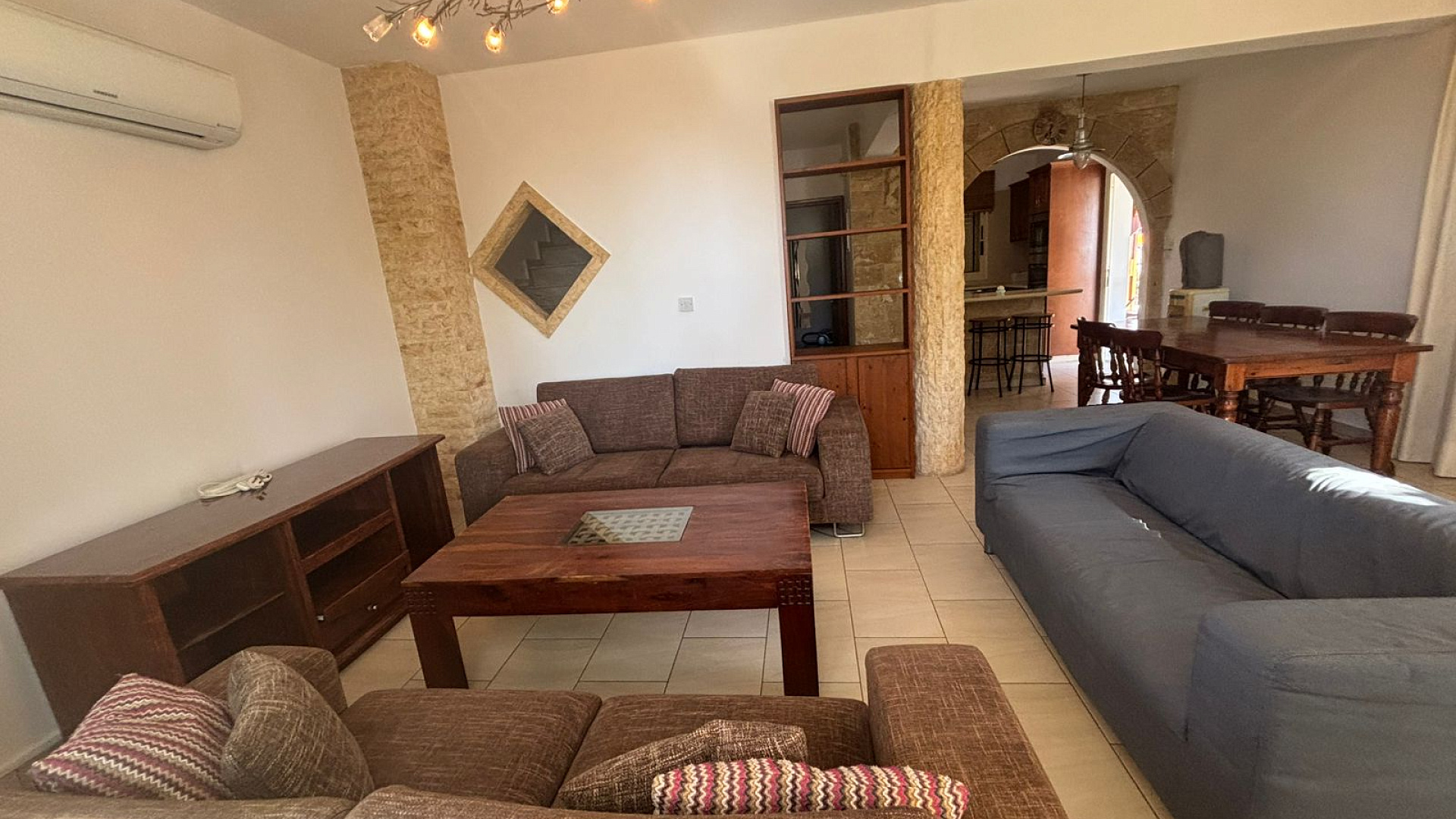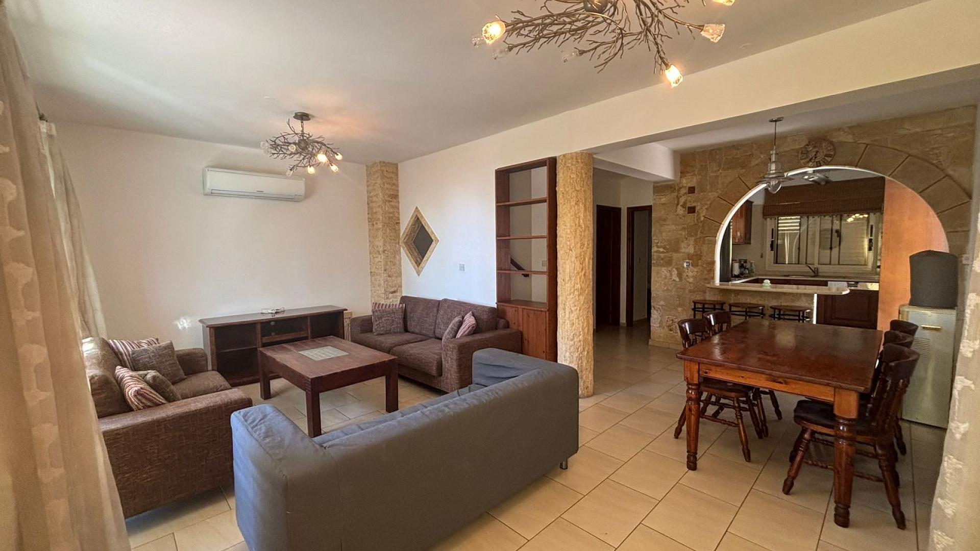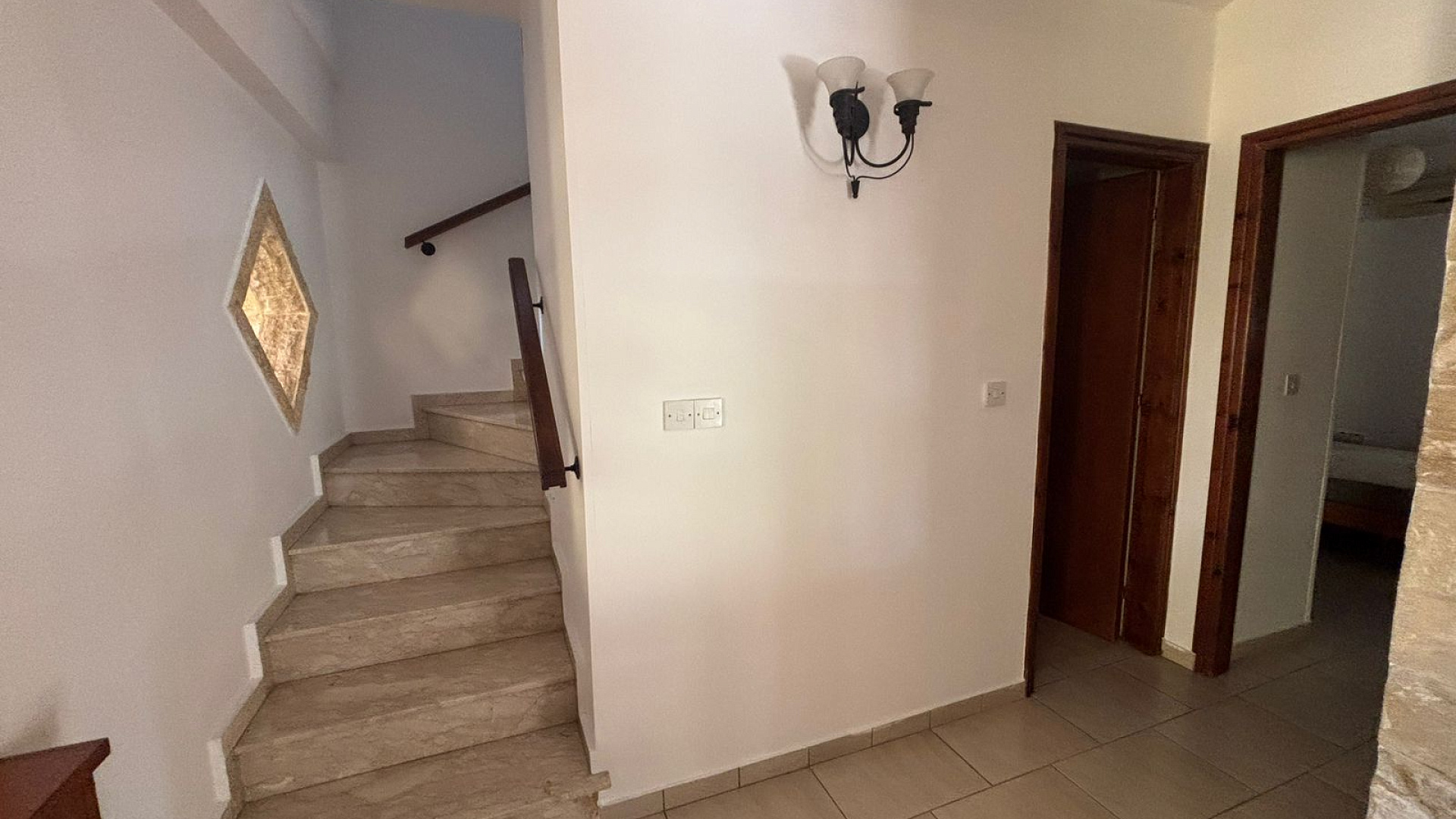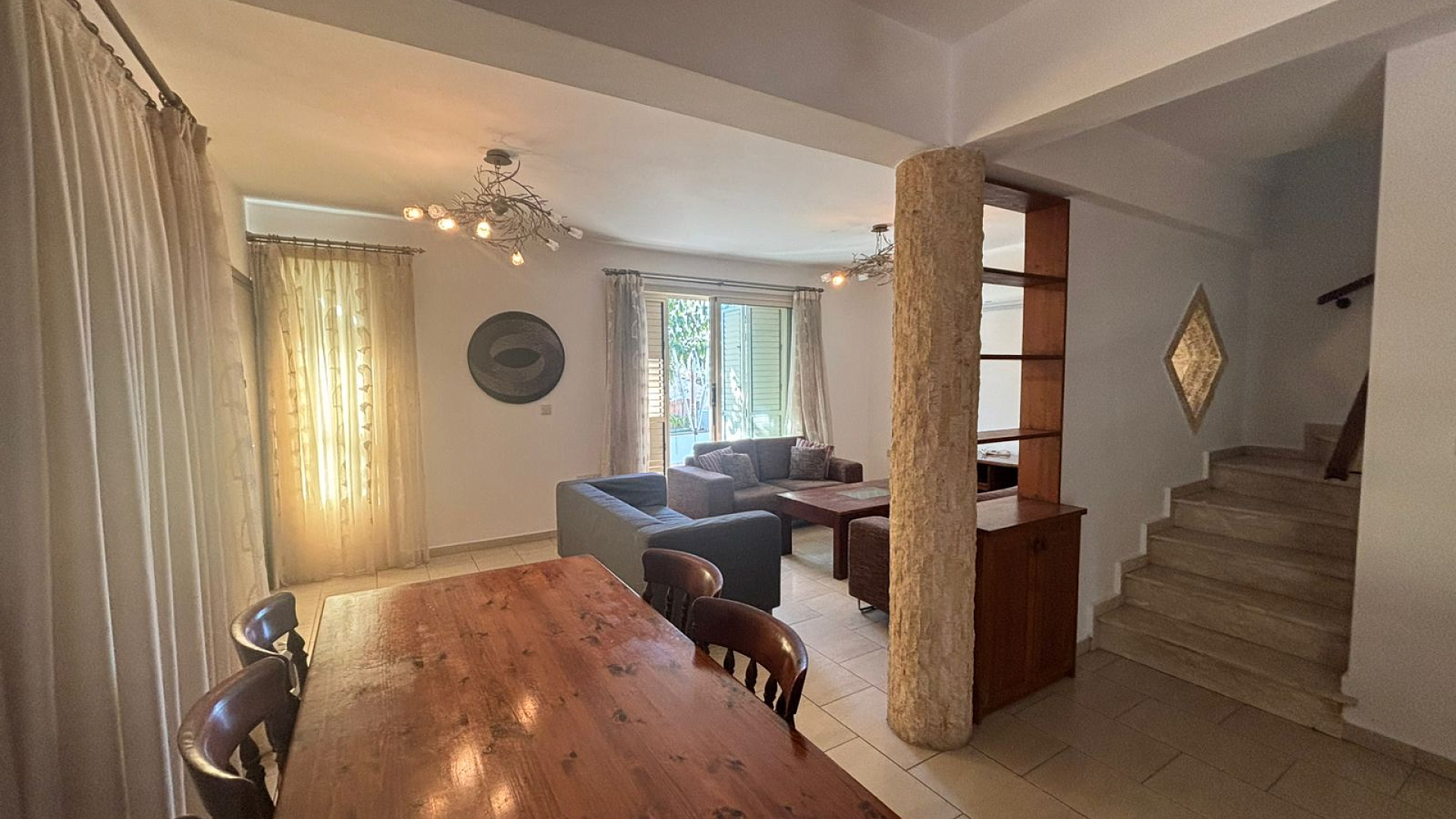 For rent a four-bedroom house with an area of 180 m2 on a plot of 200 m2 in the Tremithousa area, Paphos. The house includes one bedroom on the lower level and three bedrooms on the upper floor, three bathrooms, a kitchen, a living room and a parking space on a plot of 200 m2. The property is fully furnished and equipped with an air conditioning system in all rooms.