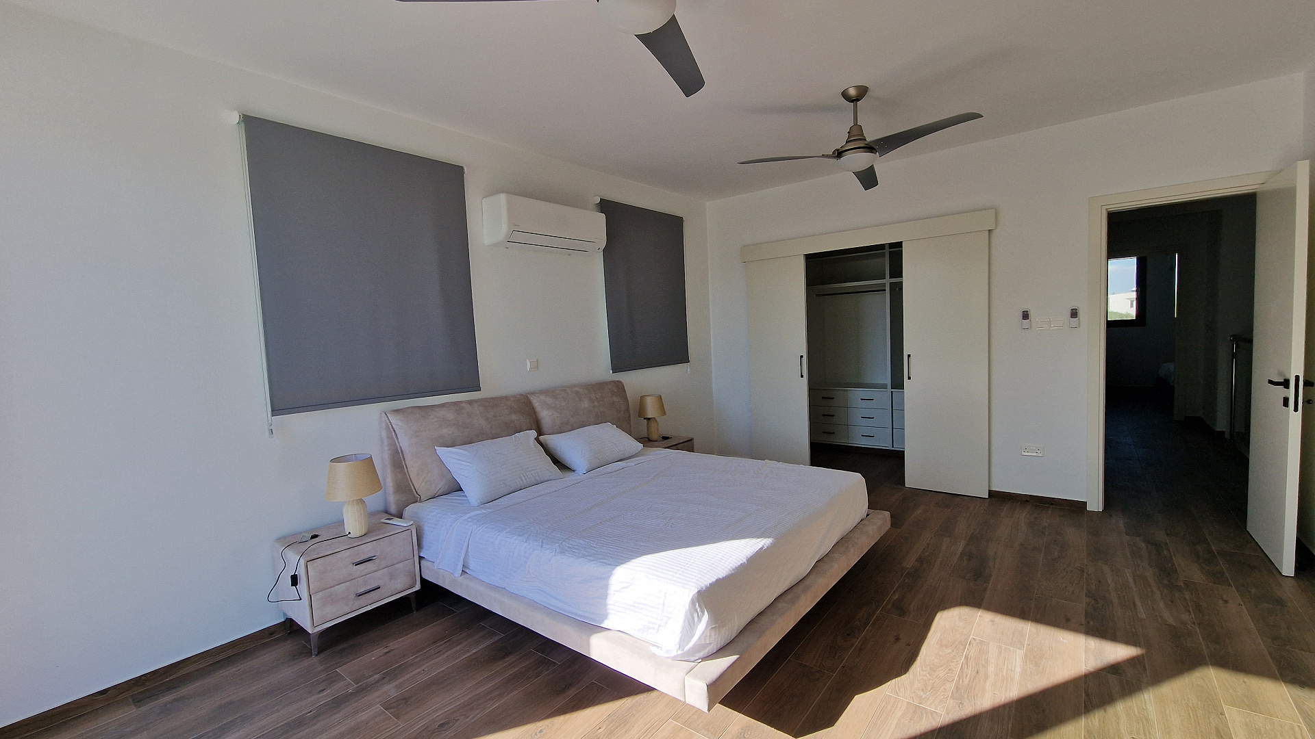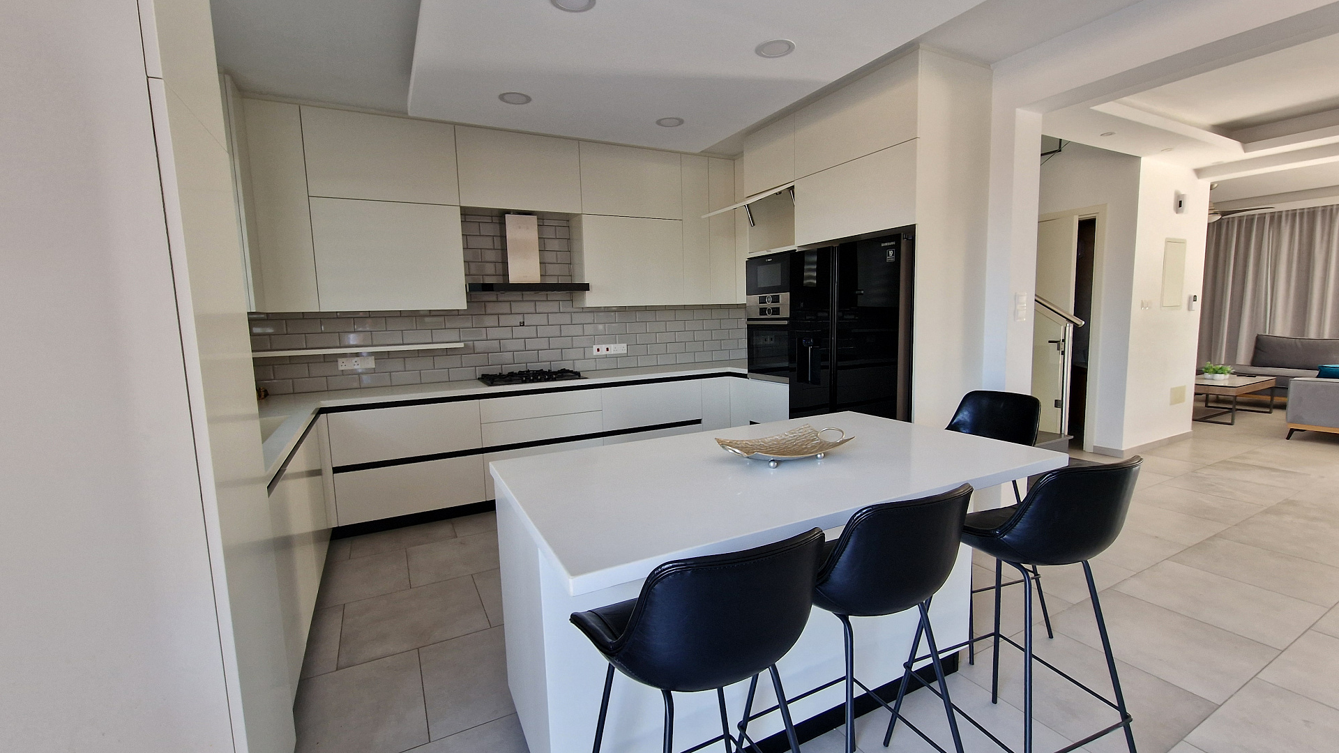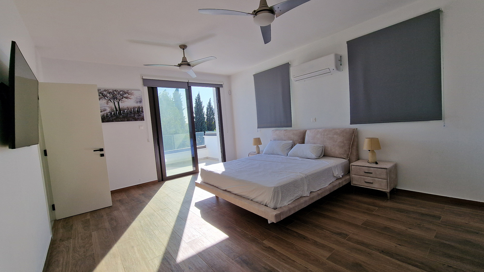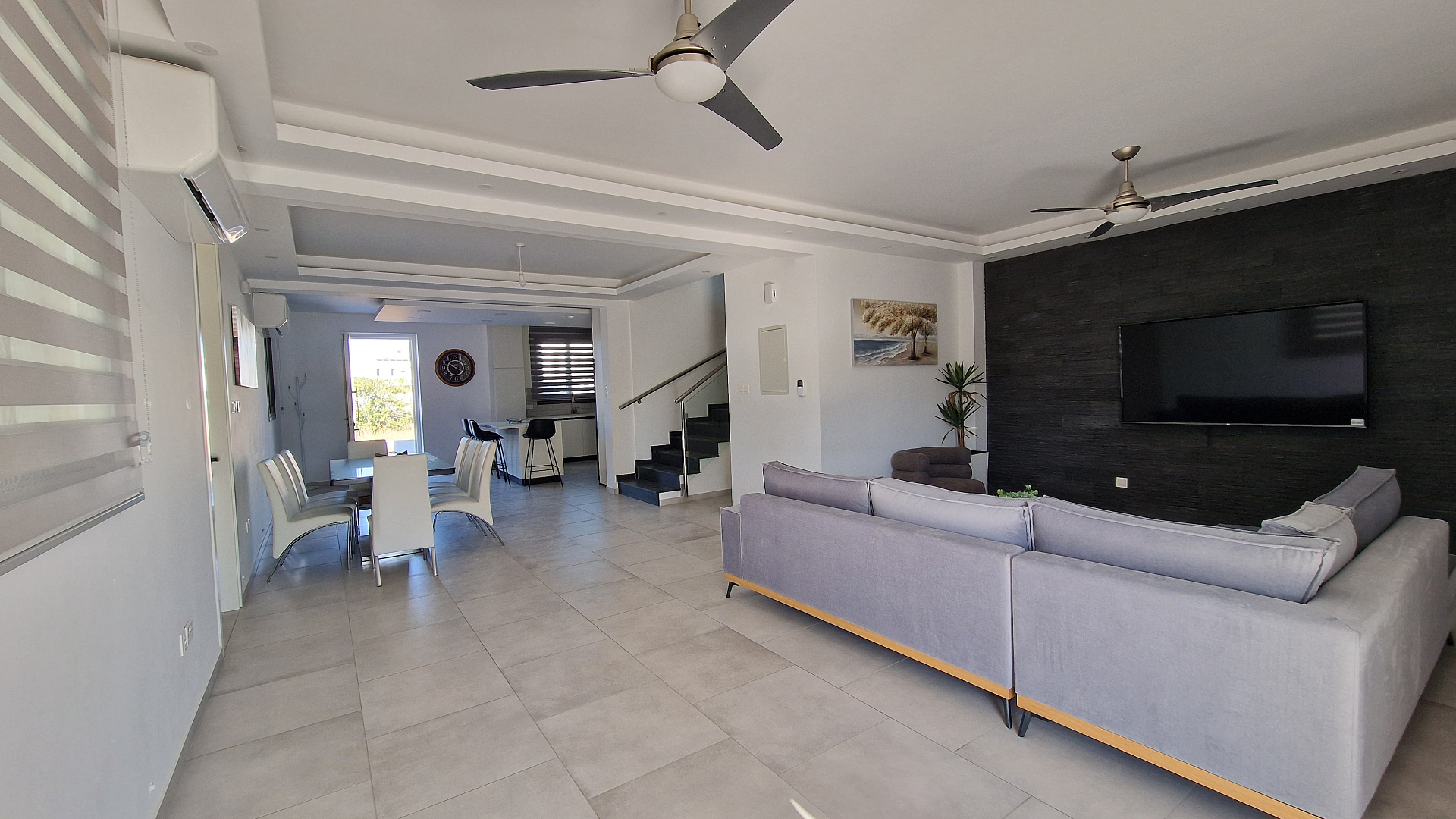 3 bedroom villa with a large swimming pool for rent in Livadia, Larnaca. The villa includes 3 bedrooms, 1 studio for an au pair (1 bedroom, study, kitchen, full appliances), 3 bathrooms, 1 additional bathroom in the studio, a spacious living room, a covered balcony on the ground floor with a barbecue area, a large garden (432 m2). The kitchen is fully equipped with all appliances. The house is minimally furnished, there are air conditioners in all rooms, TVs. A covered parking space is available for cars. The villa is located in the village of Livadia, within walking distance of all amenities.
