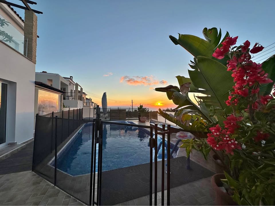 Three-bedroom villa for rent in Tala Paphos with a covered area of 123 m2 on a plot of 255 m2, available from January 2026 and equipped with a private pool, garage and a comfortable veranda of 15 m2, which can be closed in winter. The villa is furnished, includes three bathrooms, two of which are en suite bathrooms, is quietly located in a cul-de-sac and is a corner house offering sea and mountain views. New air conditioners, a fireplace are installed inside, an AENO smart heating panel is located in the children's room, there is a wine refrigerator, a smart alarm system, as well as furniture. The interior features a marble staircase, double glazing, mosquito nets, a fully equipped kitchen and a pressurized water supply system. Additionally, Wi-Fi-controlled air conditioners, 4 kW solar panels to save electricity, a storage room, nearby amenities, and an outdoor awning umbrella are provided.