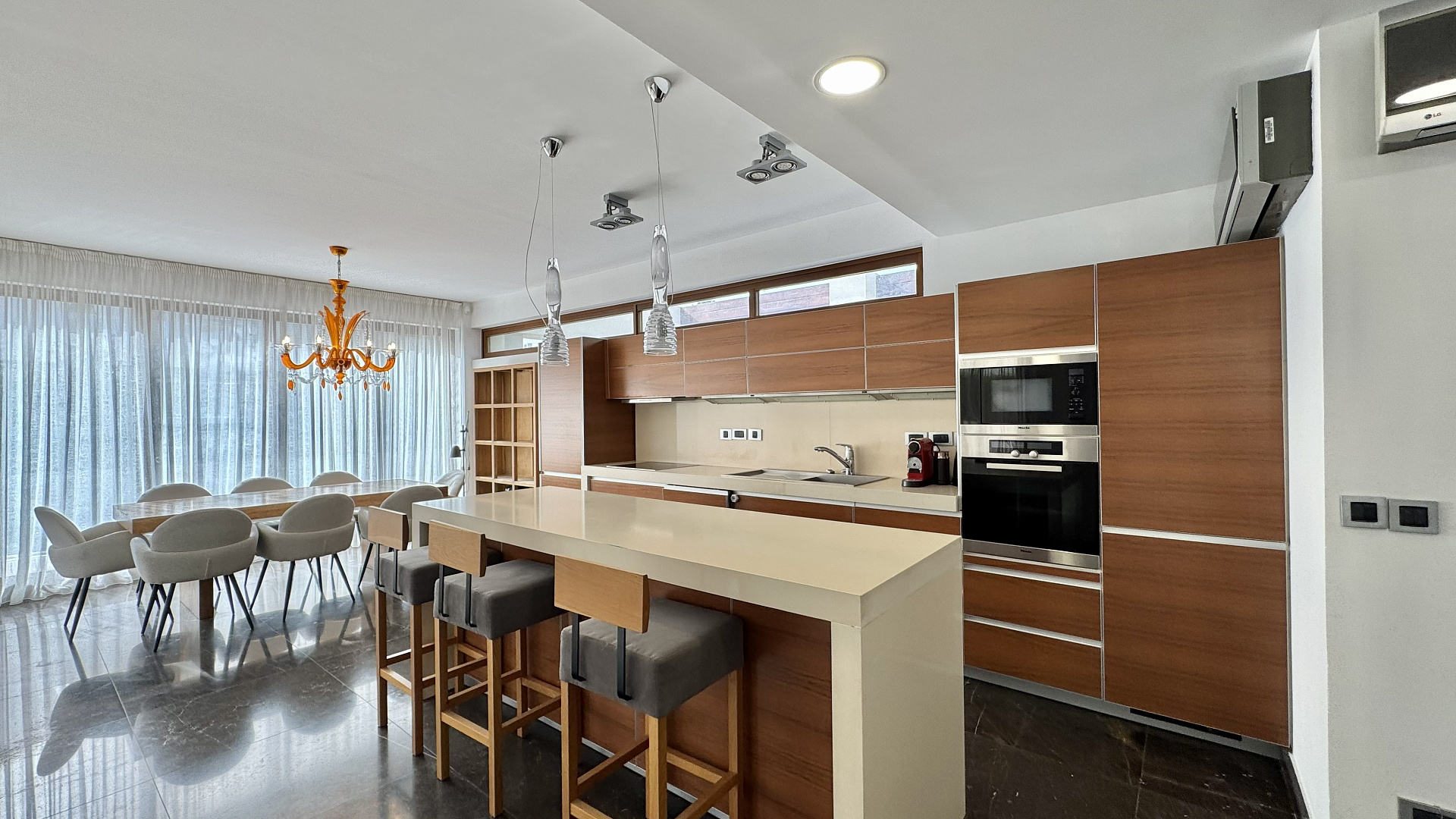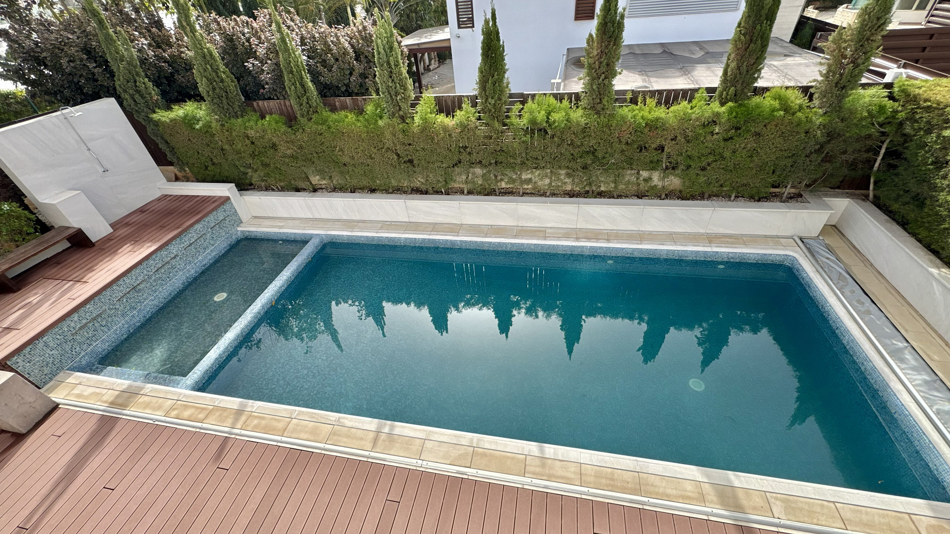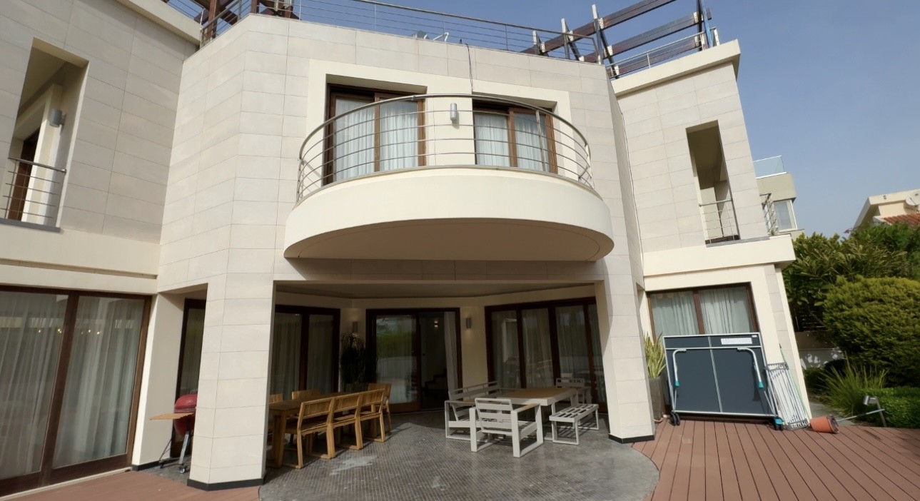 Four-bedroom villa of 350 m2 for rent on a plot of 600 m2 in the area of Pyrgos, Limassol on the first line by the sea. The villa includes 4 bedrooms, 3 bathrooms, 1 guest bathroom, a separate kitchen, a living room, a laundry room, a storage room, a basement with a sauna and a cinema, as well as a garden, a terrace and a barbecue area. The property is fully furnished and equipped with household appliances. Sauna, home cinema, storage system, laundry, private parking for 1 car and public parking are available. The villa has panoramic sea views from the roof terrace, as well as views of the green garden area. The tenants also have at their disposal a large swimming pool, a landscaped veranda and a private roof garden.