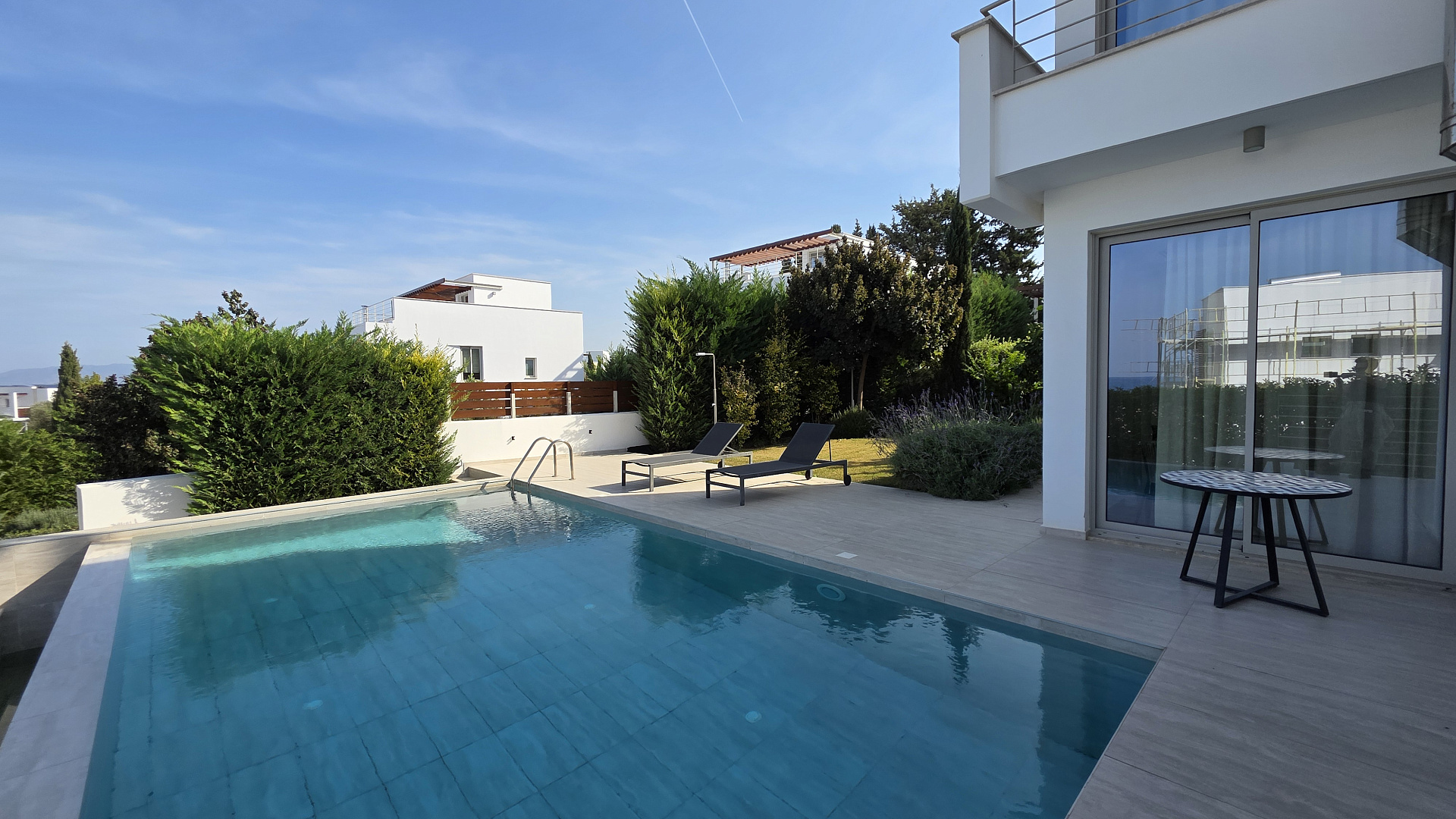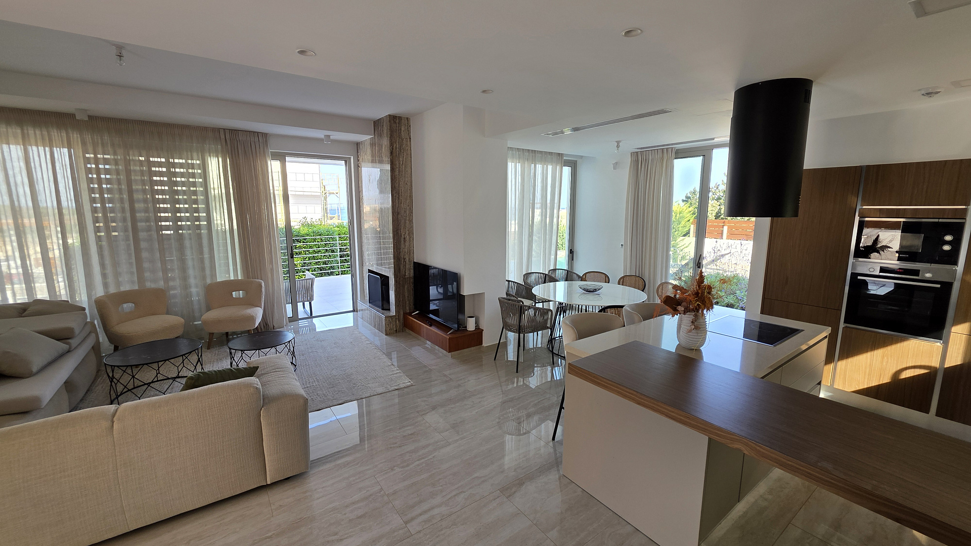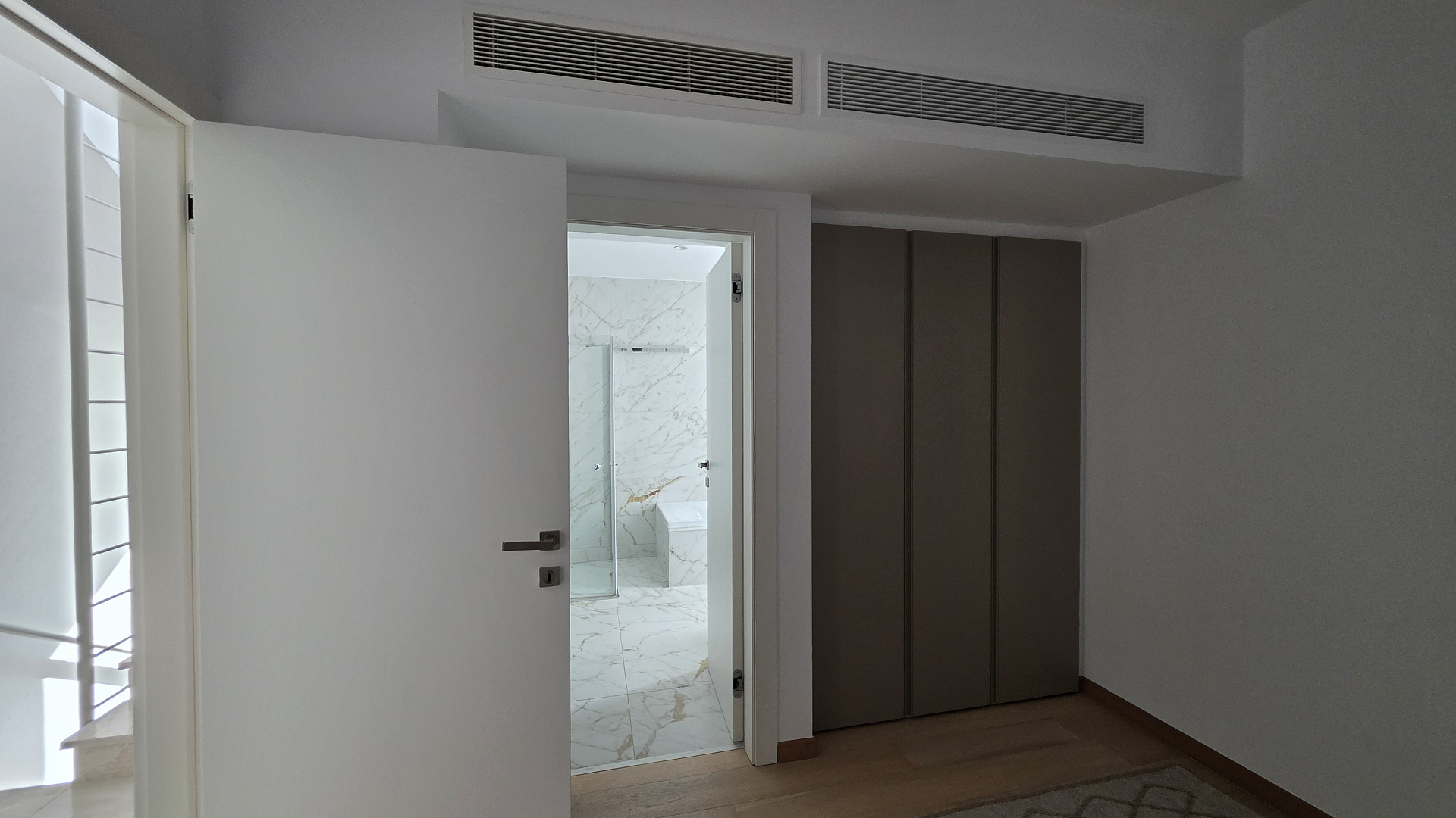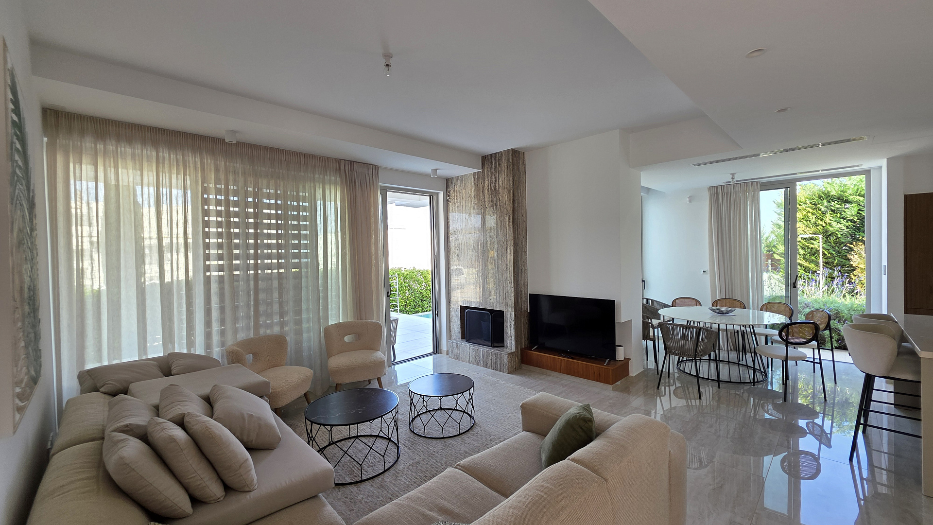 A four-bedroom villa with three bathrooms is available for rent in a residential complex ,200 meters from the beach. The house features panoramic windows, spacious terraces, a garden, and a private swimming pool, set on a large landscaped plot with sea and mountain views. The ground floor includes a living room with a fireplace and a fully equipped kitchen, while the second floor offers three bedrooms, one of which has an en-suite bathroom. The fourth bedroom with a window and its own bathroom is located on the lower ground level. The villa is equipped with a Smart Home system, VRV air conditioning, and underfloor heating. A covered parking space and a rooftop terrace are also available. The complex has 24-hour security.