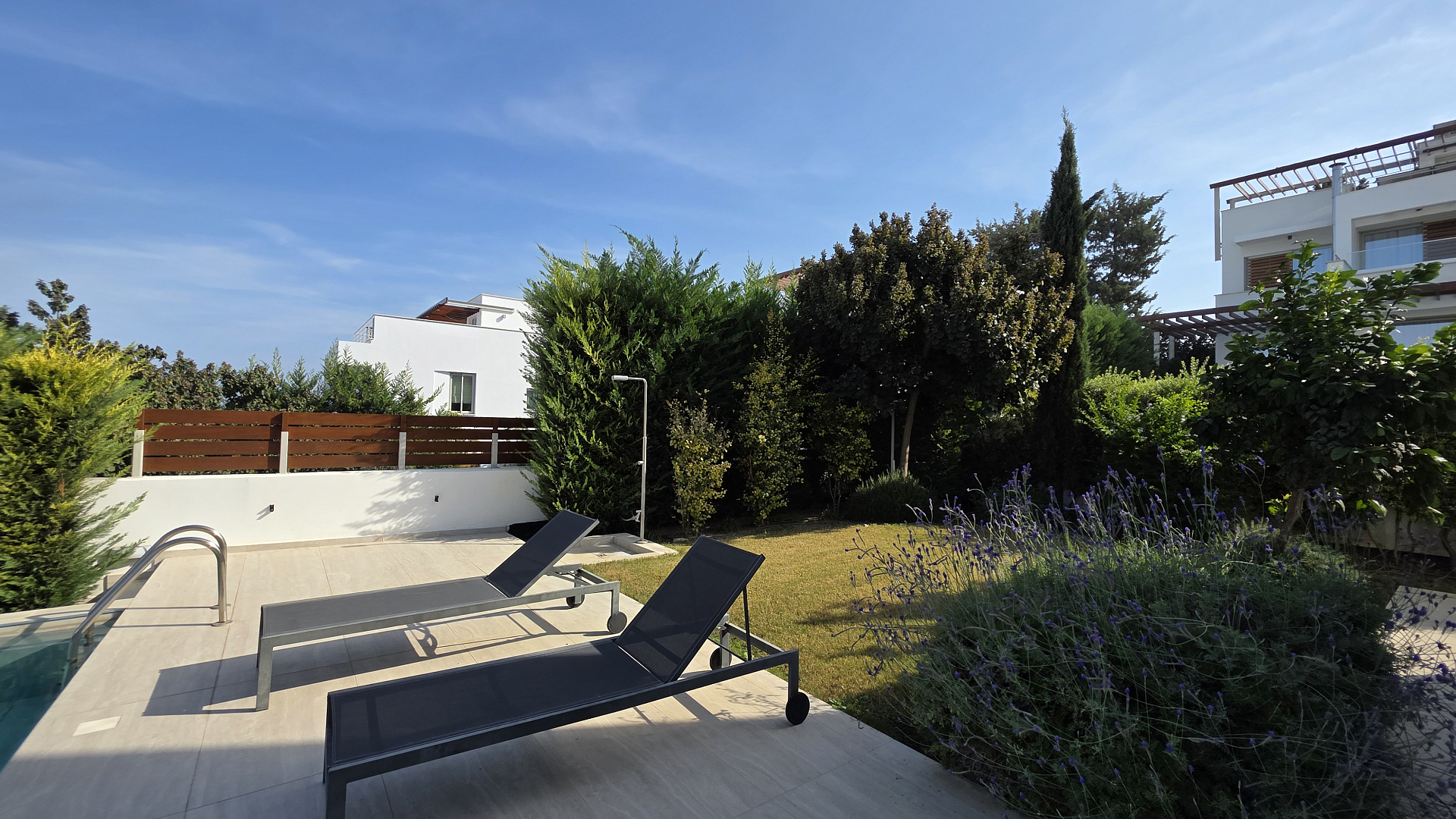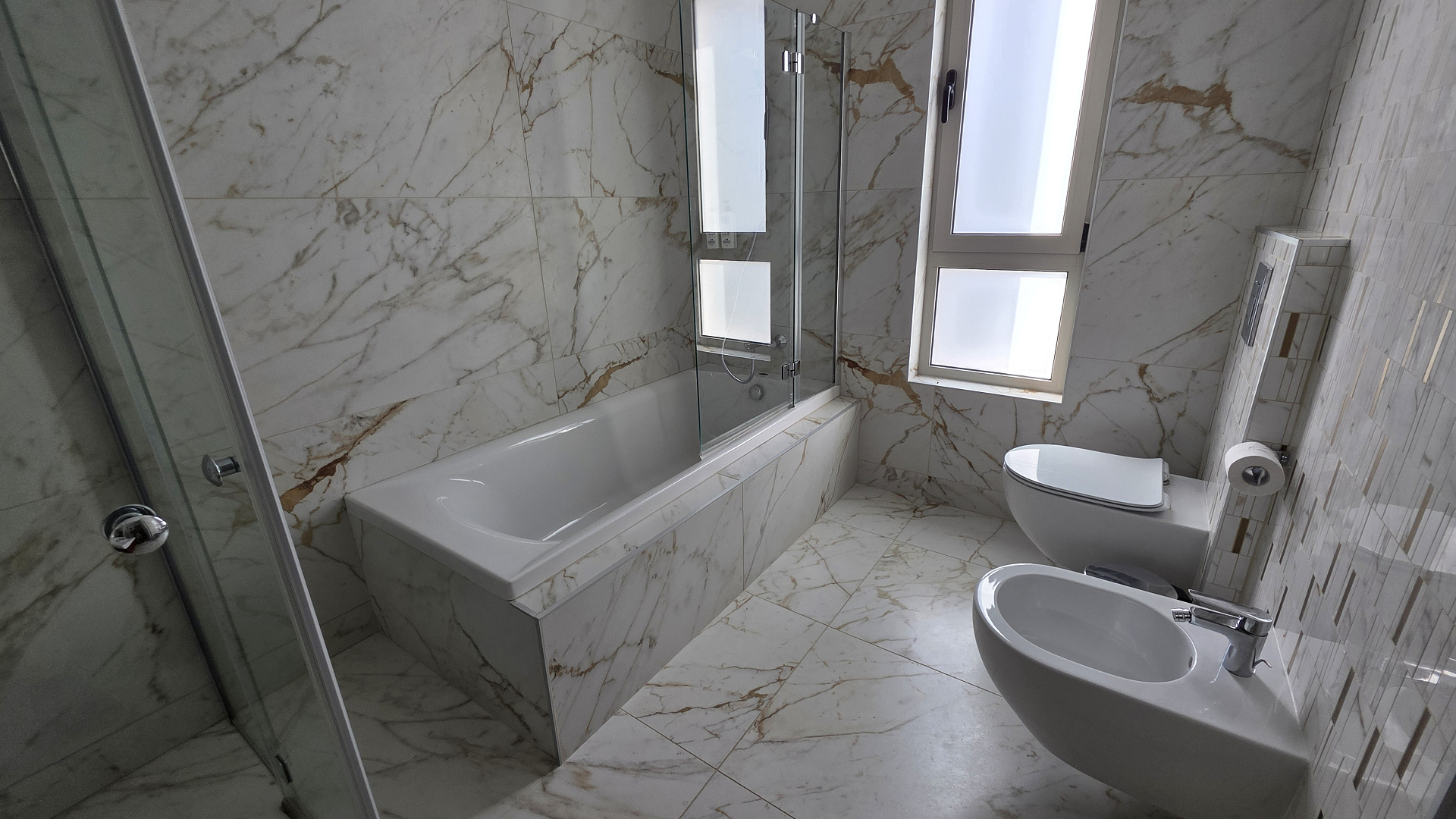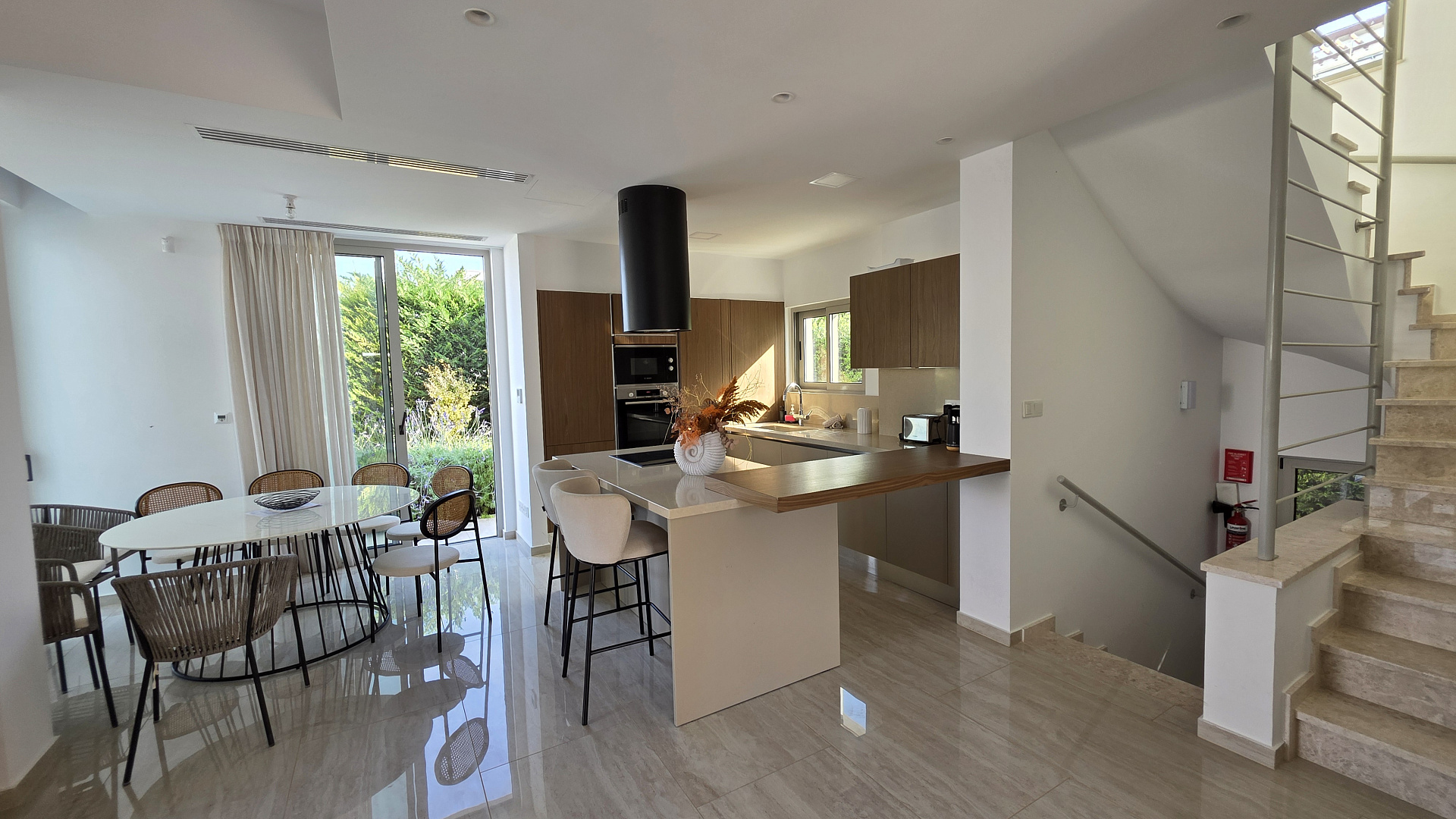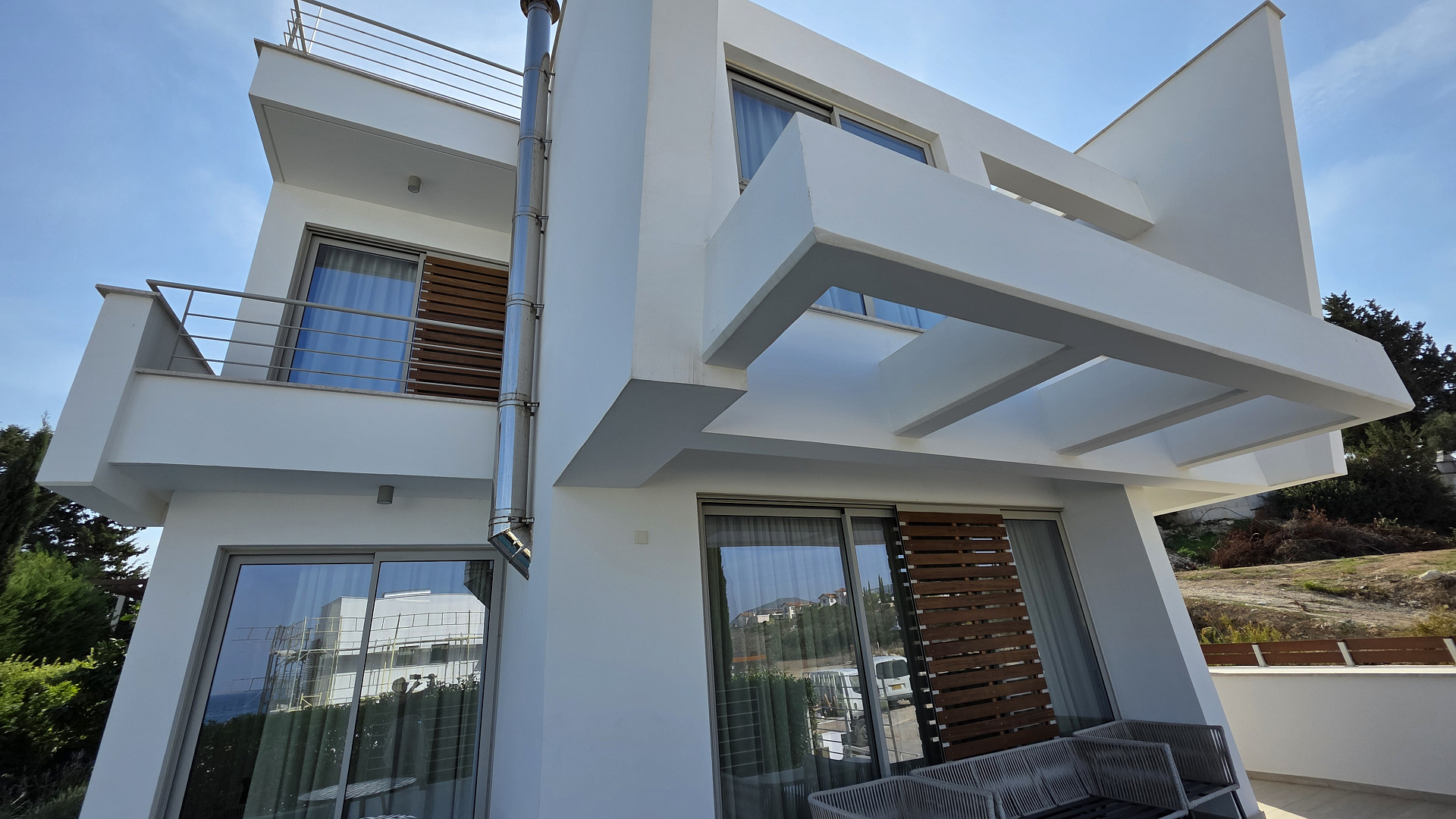 A four-bedroom villa with three bathrooms is available for rent in a residential complex ,200 meters from the beach. The house features panoramic windows, spacious terraces, a garden, and a private swimming pool, set on a large landscaped plot with sea and mountain views. The ground floor includes a living room with a fireplace and a fully equipped kitchen, while the second floor offers three bedrooms, one of which has an en-suite bathroom. The fourth bedroom with a window and its own bathroom is located on the lower ground level. The villa is equipped with a Smart Home system, VRV air conditioning, and underfloor heating. A covered parking space and a rooftop terrace are also available. The complex has 24-hour security.